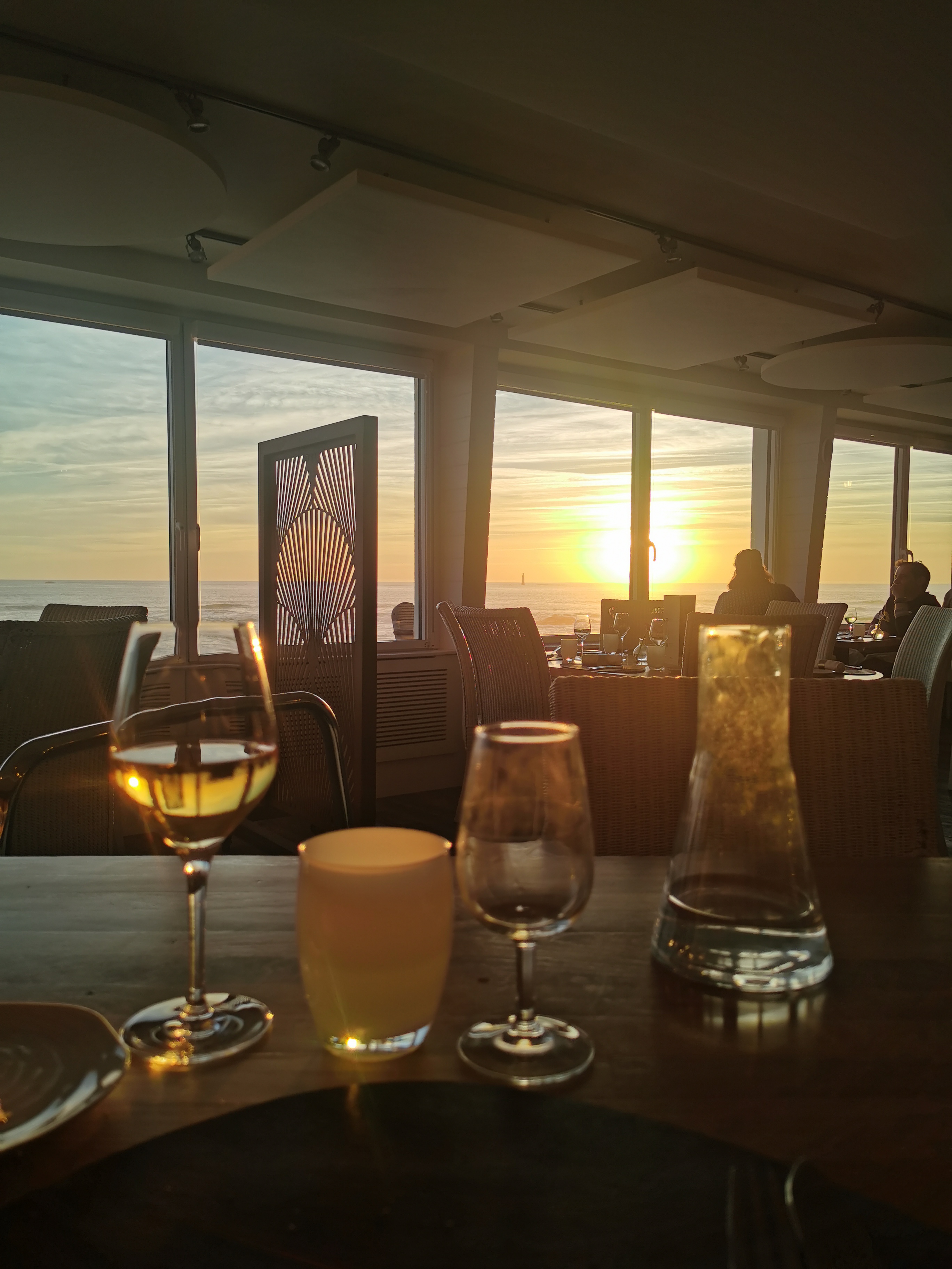 Excellent accueil et cuisine raffinée Vue imprenable sur la mer et le phare des barges et magnifique coucher de soleil avec une table contre la fenêtre A recommencer !