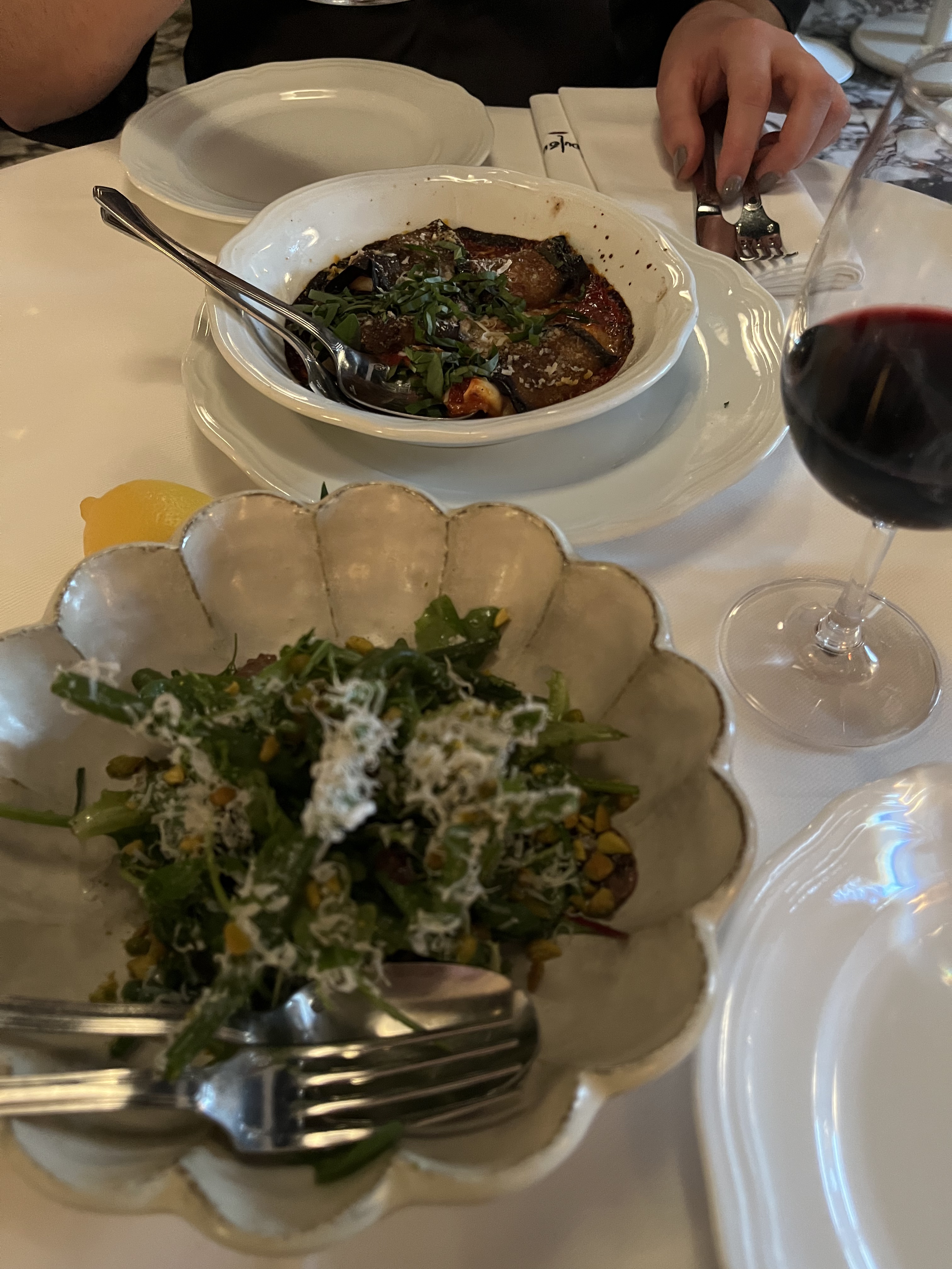 Le service était correct. une fois assis, il a fallu environ 15 minutes avant que quelqu'un nous salue et nous étions d'abord assis le long du mur, coincés entre deux tables jusqu'à ce que je demande à être transféré au stand. L'aubergine parmigiana était parfaite, j'aurais aimé qu'il y en ait plus. La salade de haricots verts était légère et délicieuse. Le poulpe avait l'air aussi parfait que son goût. Mon amie a également apprécié son plat de sauce à la vodka. A été facturé un supplément pour l'eau en bouteille sans jamais avoir la possibilité. Joli à l'intérieur