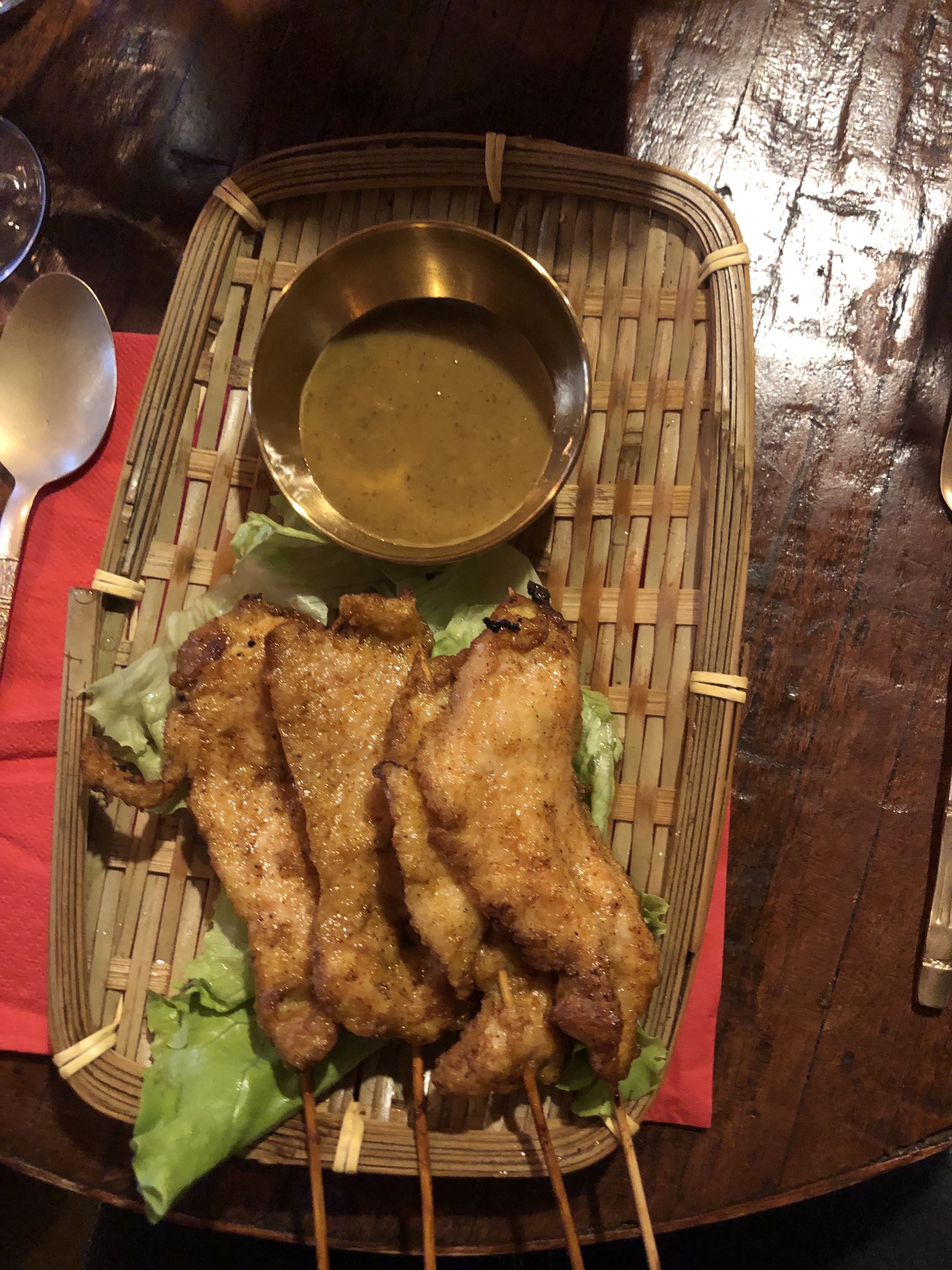 Nous avons pris : Brochettes poulet Satay, riz soufflé au porc, bœuf tigre qui pleure, poulet frit. Les brochettes au Satay étaient trop cuites donc sèches mais c'était pas mal. Le riz soufflé c'est une vraie tuerie je recommande totalement ! Hyper réconfortant, croustillant, le porc est super bon, c'est plein de saveurs. Le boeuf tigres qui pleure était parfait, cuisson parfaite de la viande, la viande était bien parfumée avec une saveur grillée à tomber. Le poulet frit était bon, assez classique mais efficace. Le prix reste un peu cher et je trouve la carte vraiment pas clair, vous devriez l'épurer. Je recommande et je reviendrai