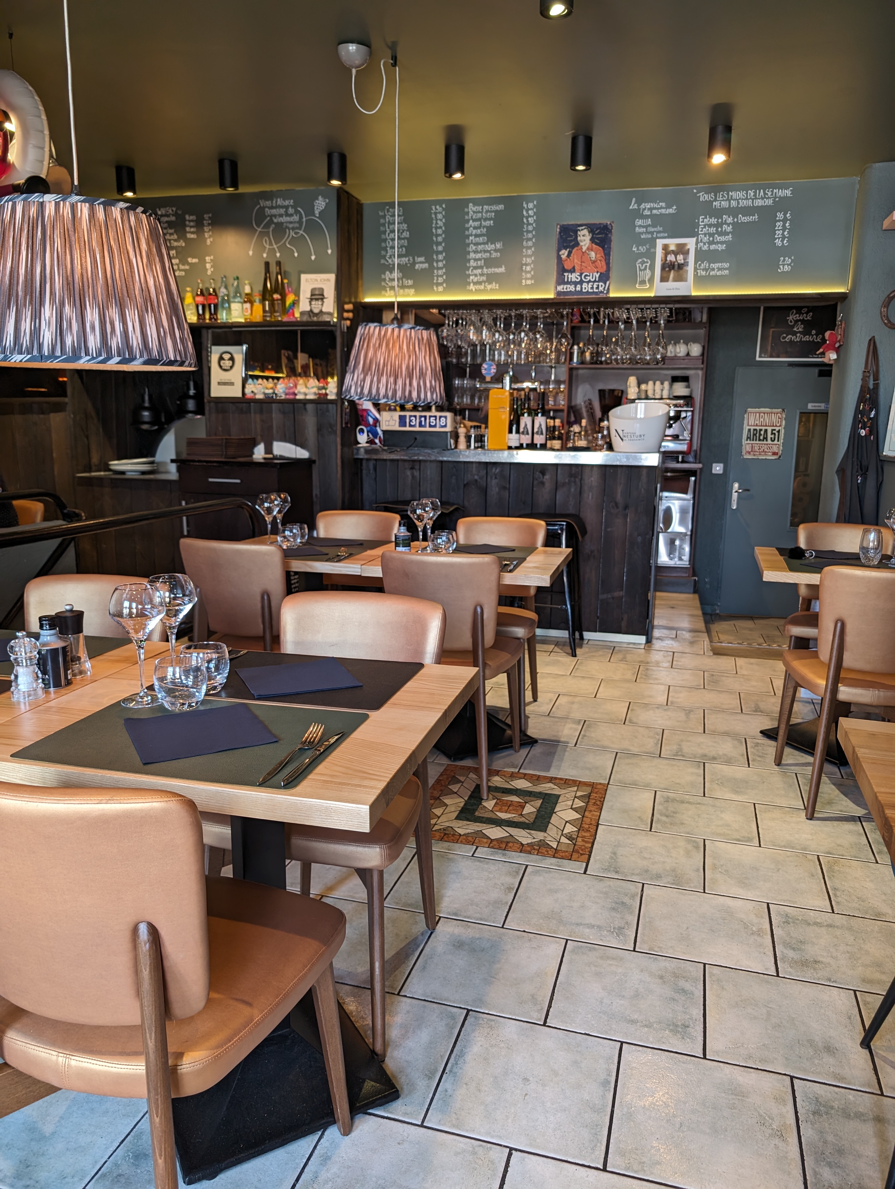 Quelle belle découverte ! Je sortais de l'hôpital et pour fêter ça j'ai cherché un petit bistronomique... et j'ai trouvé ! Le menu ce midi est vraiment top et bien servi, des asperges aux jambons puis une viande cuite à la la perfection avec une originale sauce au café. Je vous invite (c'est une métaphore) à découvrir cet excellent restaurant, patrons très sympas et serveur serviable ! Pas beaucoup de tables, ce qui rajoute à la convivialité du lieu, je recommande sans réserve ! Gérard et Lorette Ps j'ai pas pu m'empêcher de prendre cette photo, tellement vrai, bien que l'inverse existe aussi... mais moins ;)