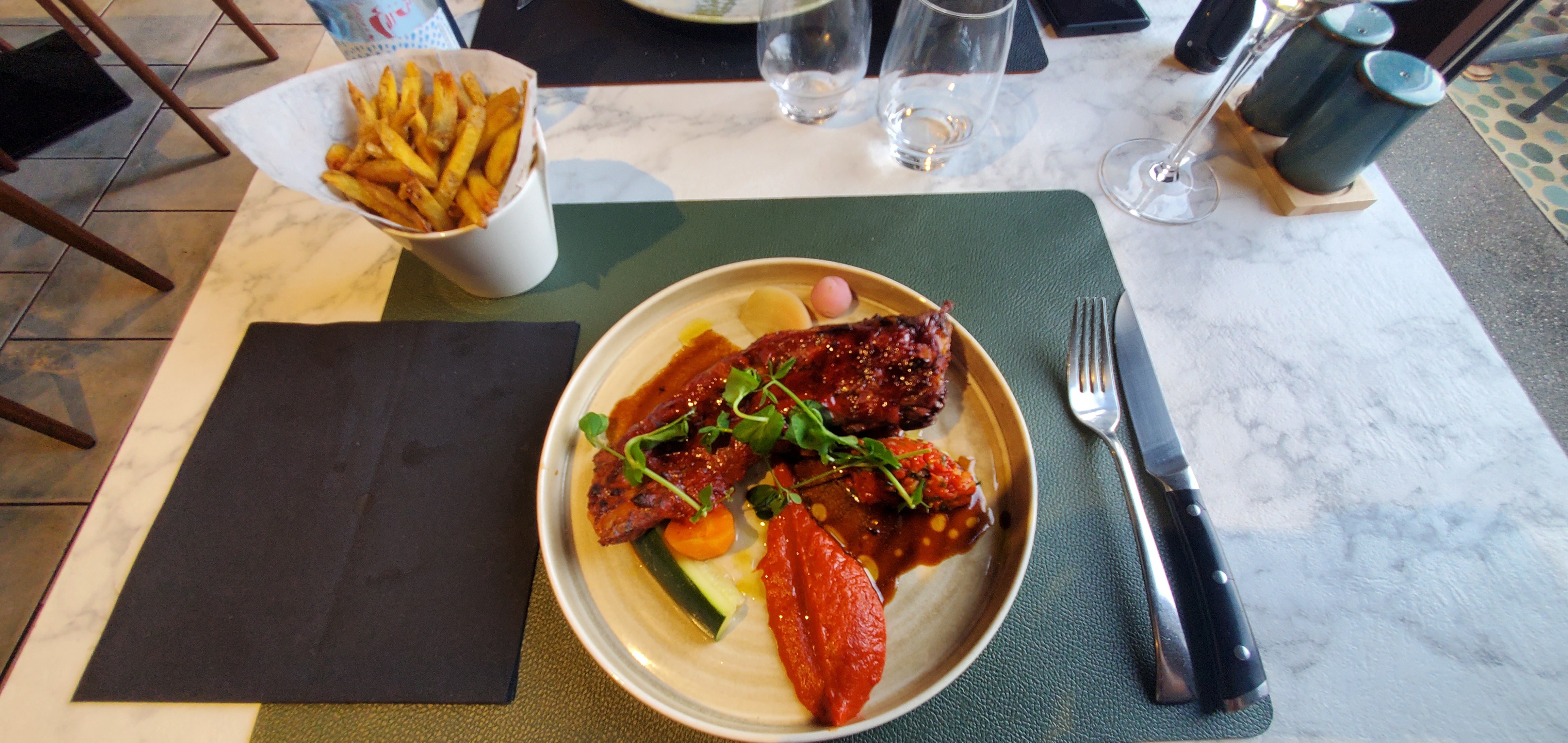 La cuisine est tout à fait correcte, du moins en ce qui concerne la viande. Les accompagnements sont frais et en quantité suffisante. La température de la salle est un peu juste...on va dire que c'est pour être vertueux....mais les frileux pourraient bouder. On retentera ce printemps 😉