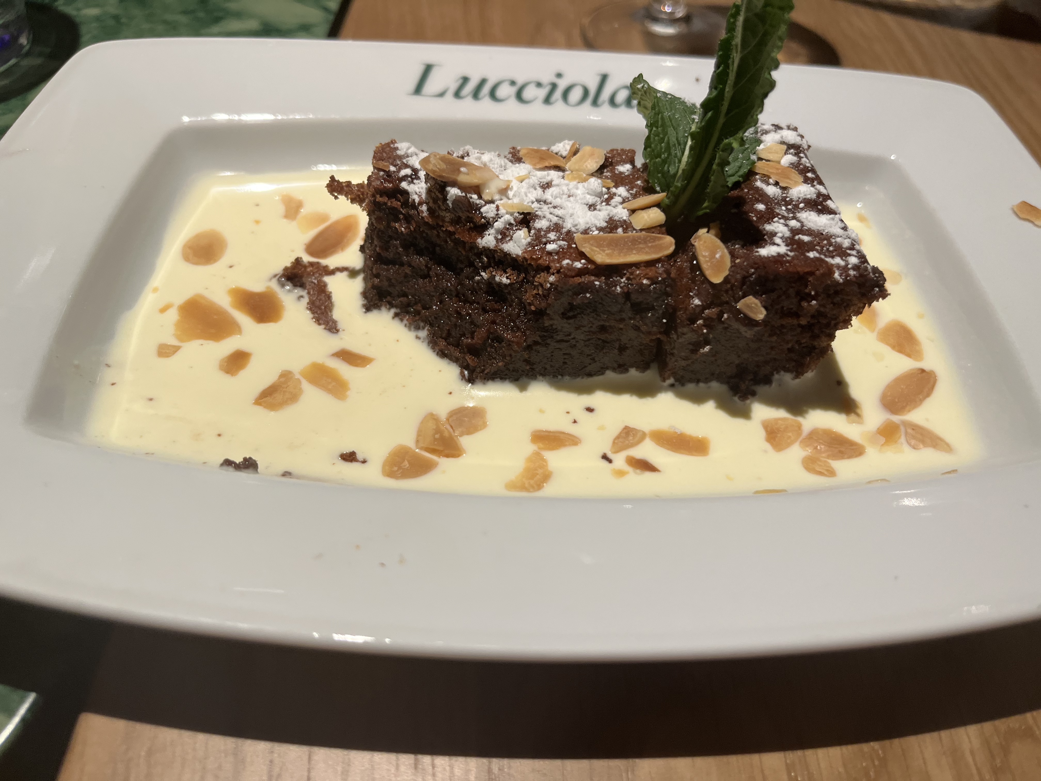 Dîner à La Lucciola, nous partions avec de belles attentes, de l’extérieur le restaurant donne envie, la carte également. Cependant, assez déçue de la cuisine: une pizza mortadelle avec de la pistache qui ne se sent pas, tellement il y a de crème… la 4 fromages était bonne, mais pas excellente, la limonade également. Puis vient le dessert, une tarte noix, noisettes, amandes et chocolat: arrive une sorte de moelleux goût pâte d’amande, trop gras, trop sucré, et sans chocolat (ou alors c’est du chocolat blanc, et ce n’est pas indiqué sur la carte, dommage car encore plus de gras et de sucre qui rend le dessert écœurant), le tout baignant dans de la crème anglaise. Le restaurant est pourtant sympa visuellement, avec une ambiance musicale immersive, il y a du potentiel. Nous avons trouvé notre serveur particulièrement intrusif, bien que sympathique, pas idéal pour un dîner en tête à tête.