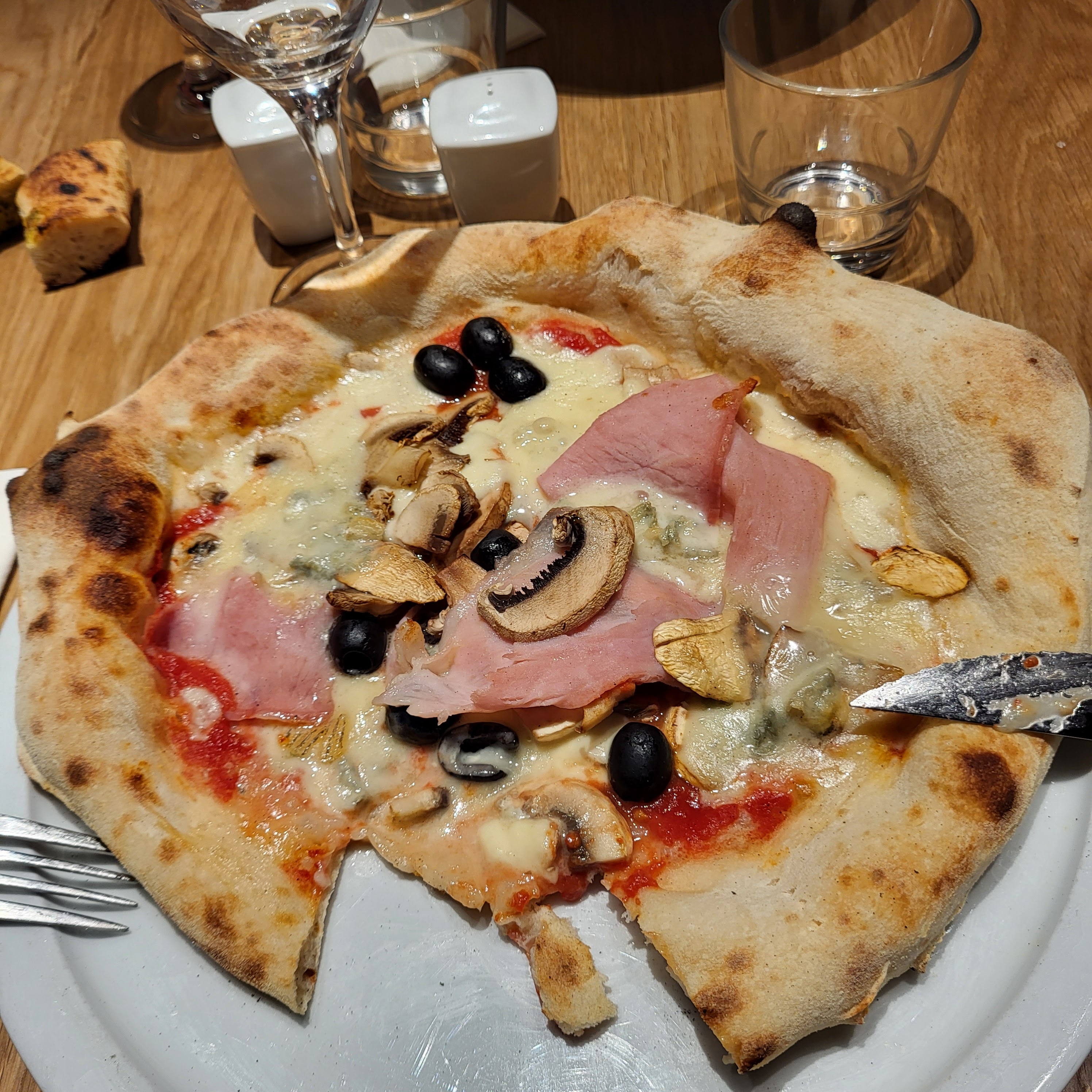 Pizza copieuse et délicieuse réalisée avec de très bons produits. Personnel aimable et chaleureux. Je mets également 5 étoiles pour l'originalité italienne des toilettes. Je conseille vivement cette pizzeria !