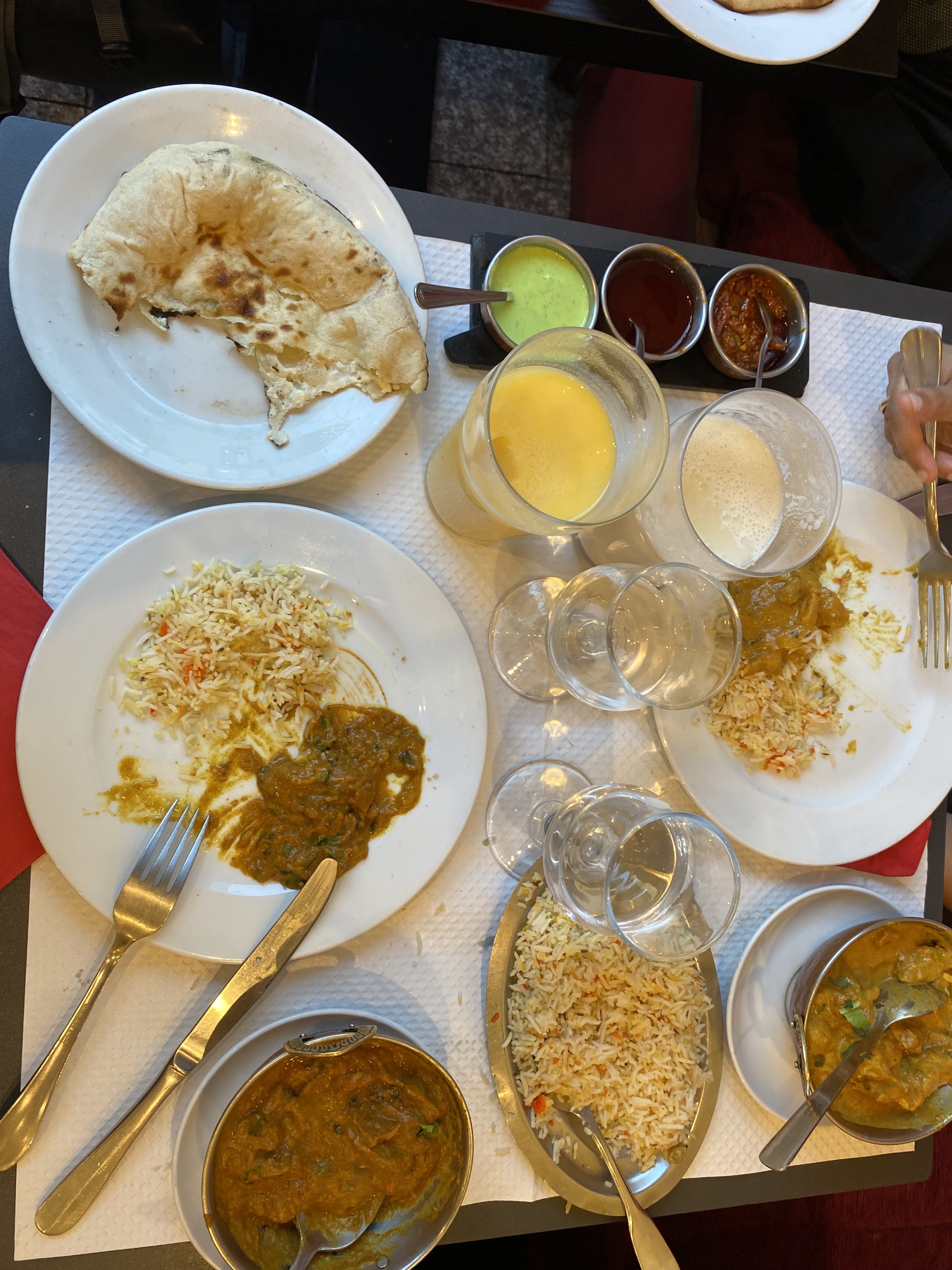 Excellent et tres copieux pour un prix clairement raisonnable 🤤 (2 lassi, 2 naan fromage, 1 entrée, 2 plats et un riz pour 47€)