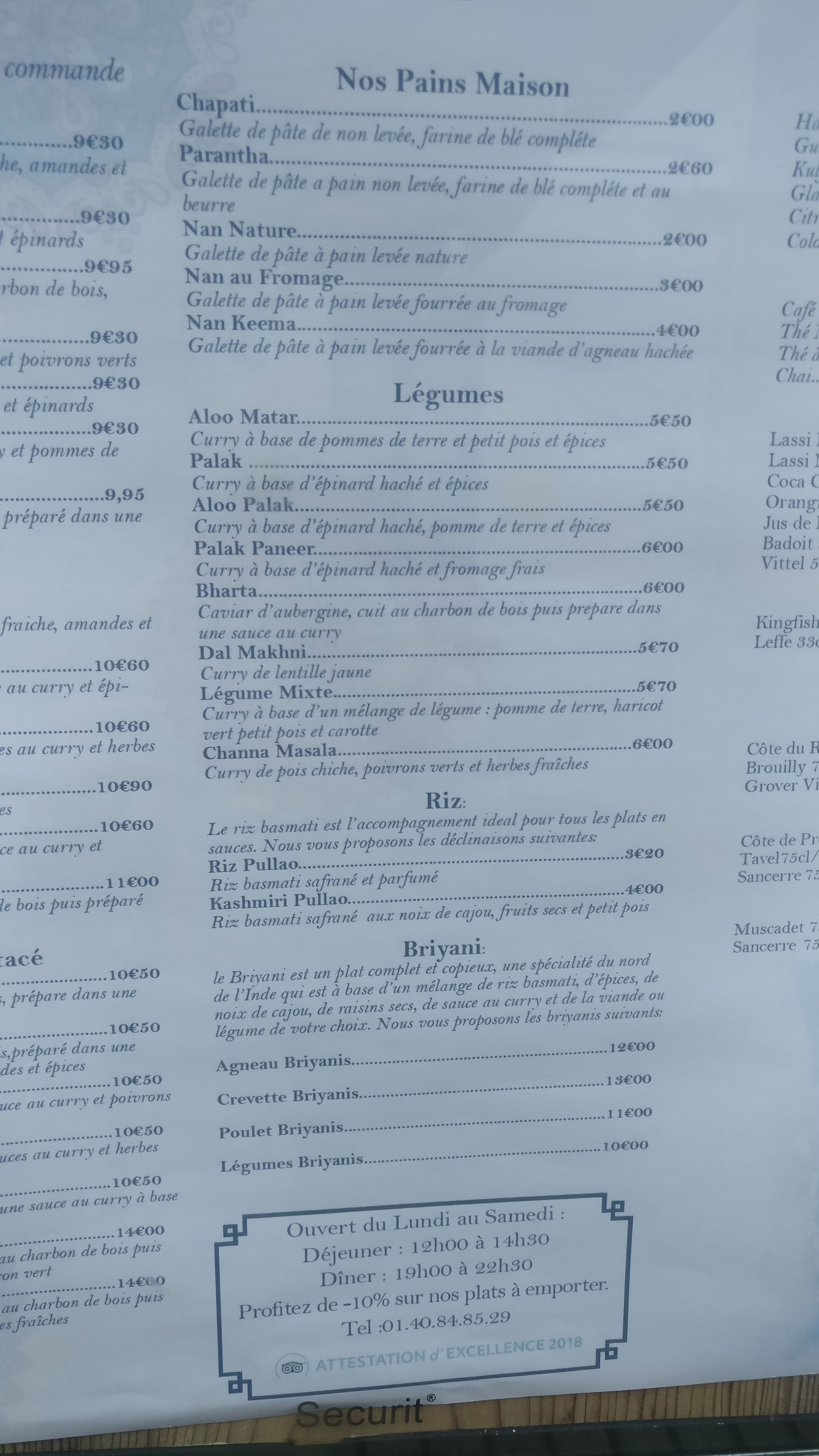 Endroit où il faut réserver absolument car 20 couverts max...mais que c est bon!!! Menu à prix imbattable avec cheese naan dans chaque menu inclus...~21€..approximatif menu végétarien <15€...faut juste trouver à se garer...