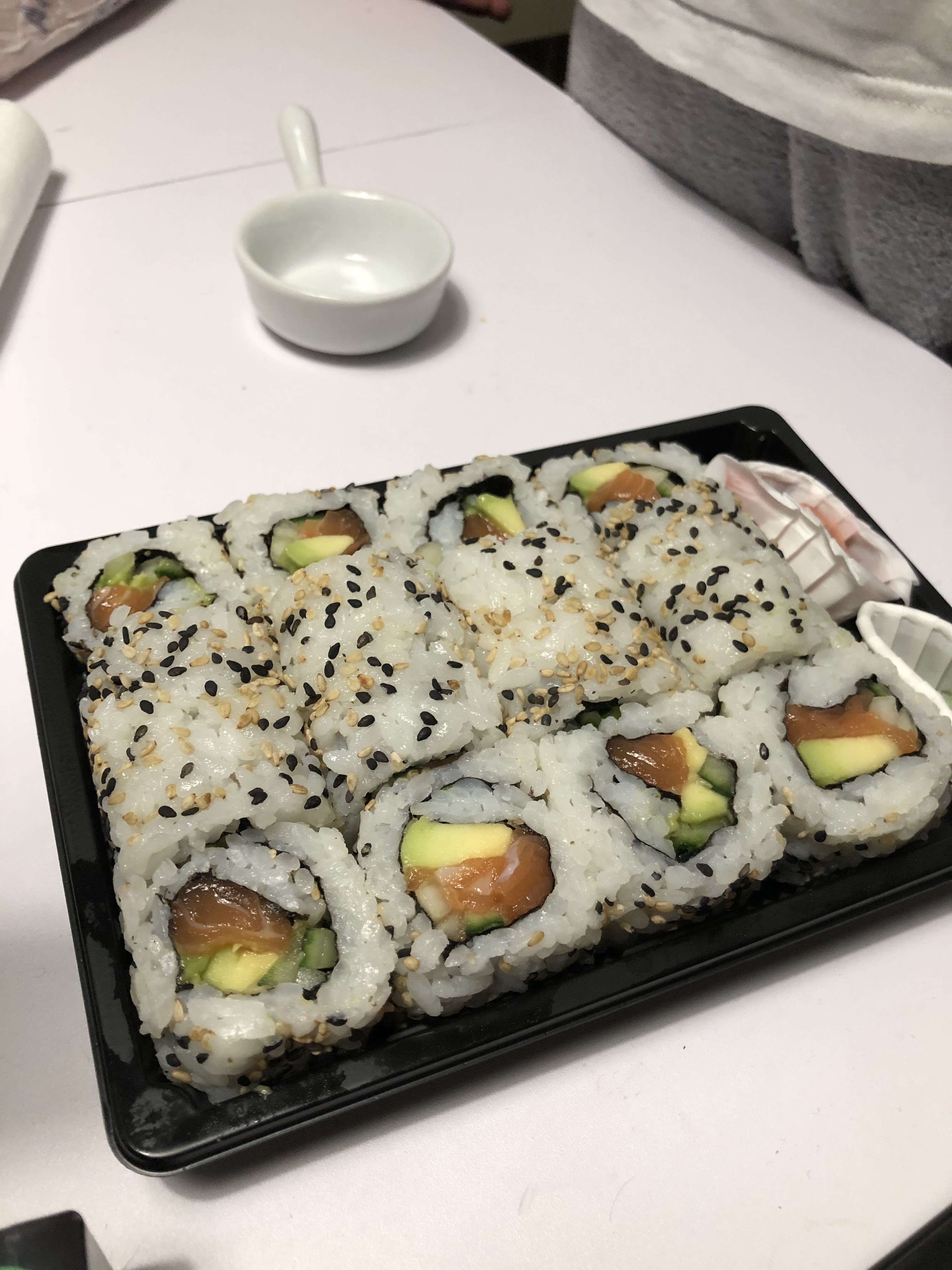 California saumon avocat délicieux , nouilles sautés au poulet et nem extra livraison rapide . Bravo
