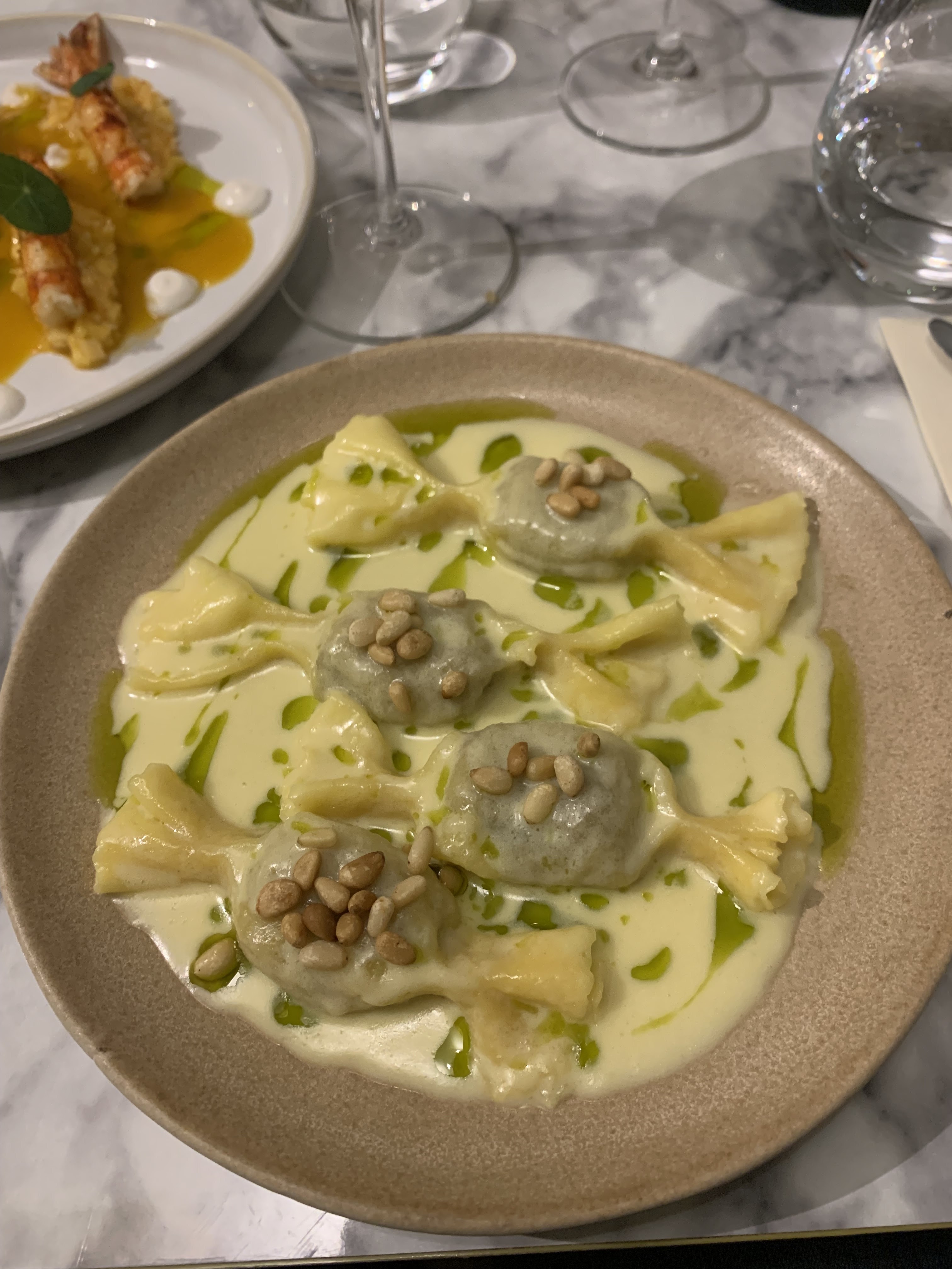 Tout est purement délicieux et original ! Bravo au chef nous avons rarement mangés de plats aussi délicieux avec des sauces à tomber. Tout est délicieux de l’entre au dessert. Cuit et assaisonnes à la perfection. Dessert pas trop sucré. Bref cela vaut le détour. Service efficace et très agréable ce qui en gâche rien ! Question note .. un peu cher c’est sur mais c’est le prix de la qualité et des produits frais... Nous reviendrons avec plaisir. Coup de cœur également pour les ravioles en forme de bonbon . Sauce sublime.