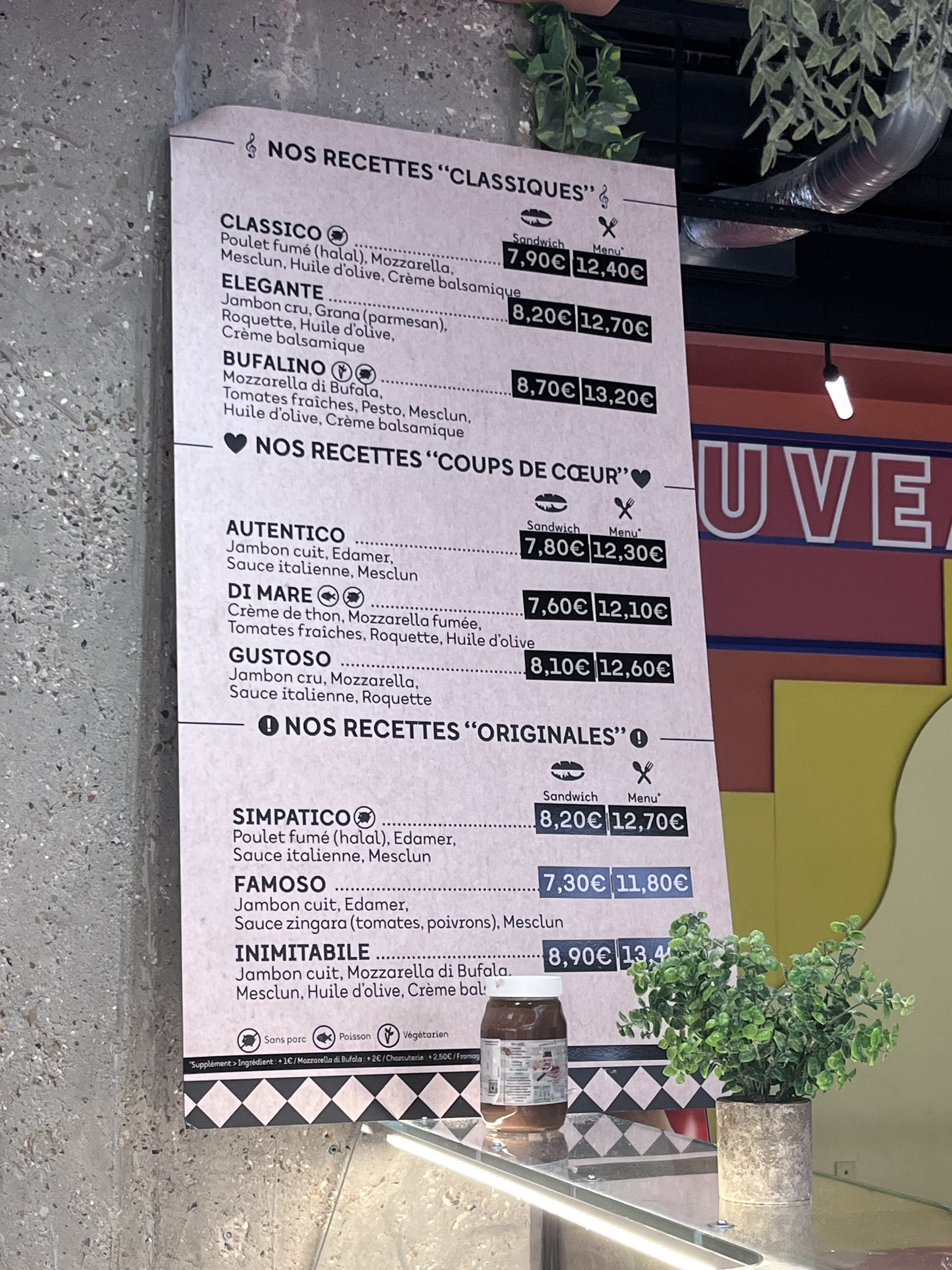 J’ai pas pour habitude de laisser de mauvais commentaires mais là je trouve que c’est nécessaire de le faire je n’ai jamais été aussi choqué. J’ai choisi le menu classico dont je cite « Poulet fumé (halal), mozzarella, salade, huile d’olive, sauce balsamique ». Le poulet en question est du blanc de poulet 2 tranches, et je précise que la serveuse à utiliser les mêmes gants pour prélever du jambon de porc du sandwich précédent (vous faites bien de préciser halal), la mozza c’est des tranches de fromage et de la salade avec ses deux sauces. Il faut voir la tête du sandwich qu’il propose pour 7€20 ! Ce Lunicco propose un service de mauvaises qualités, j’avais testé un autre qui en faisait des très bon avec de la vraie Mozza au moins. N’allez pas a celui là vrai conseil