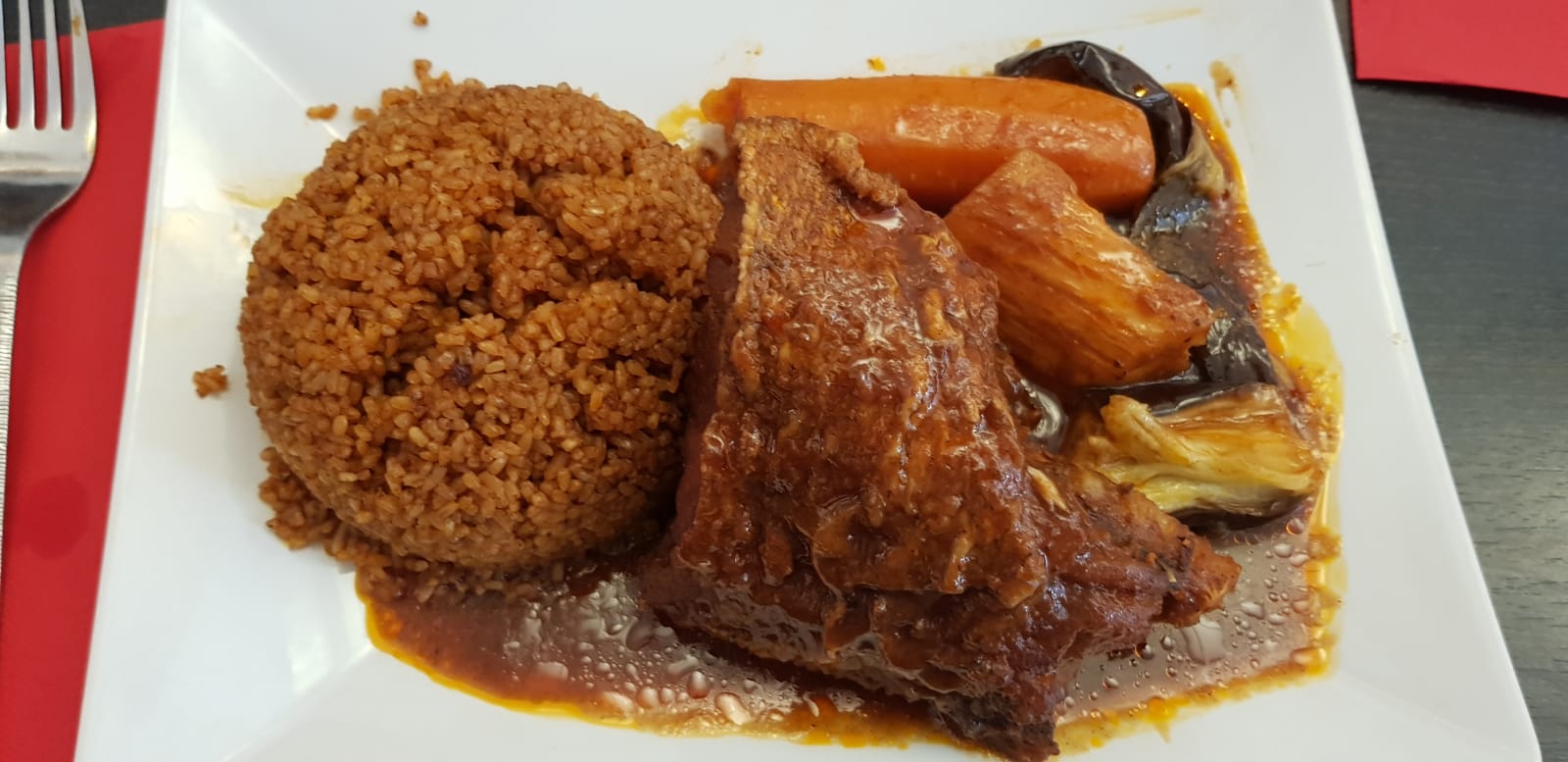 Thiebou Djen à emporter. Repas délicieux et copieux avec un bon rapport qualité-prix. Attention le piment 😂 j'ai pleuré avoir testé. Cependant il manque juste un peu de convivialité ou c'est peut-être le ramadan 😂😂😂. Je reviendrai au moins une fois par mois c'est sûr.