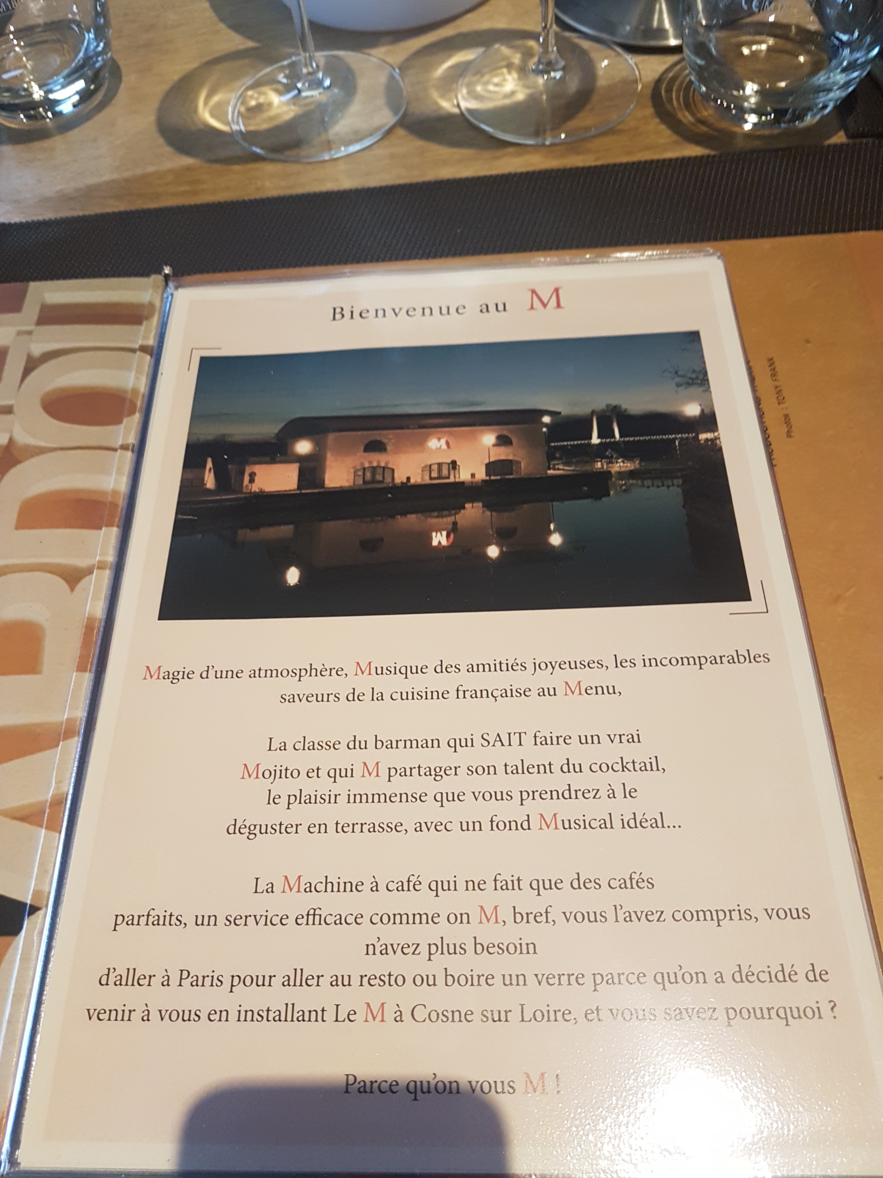 Je vais souvent au M et c’est vraiment très bien! C’est convivial et digne d’un restaurant gastronomique ! Les serveurs sont vraiment super, j’ai pu changer ma sauce dans mon magret sans aucun problème. La salle est belle et grande et est au bord de la Loire.