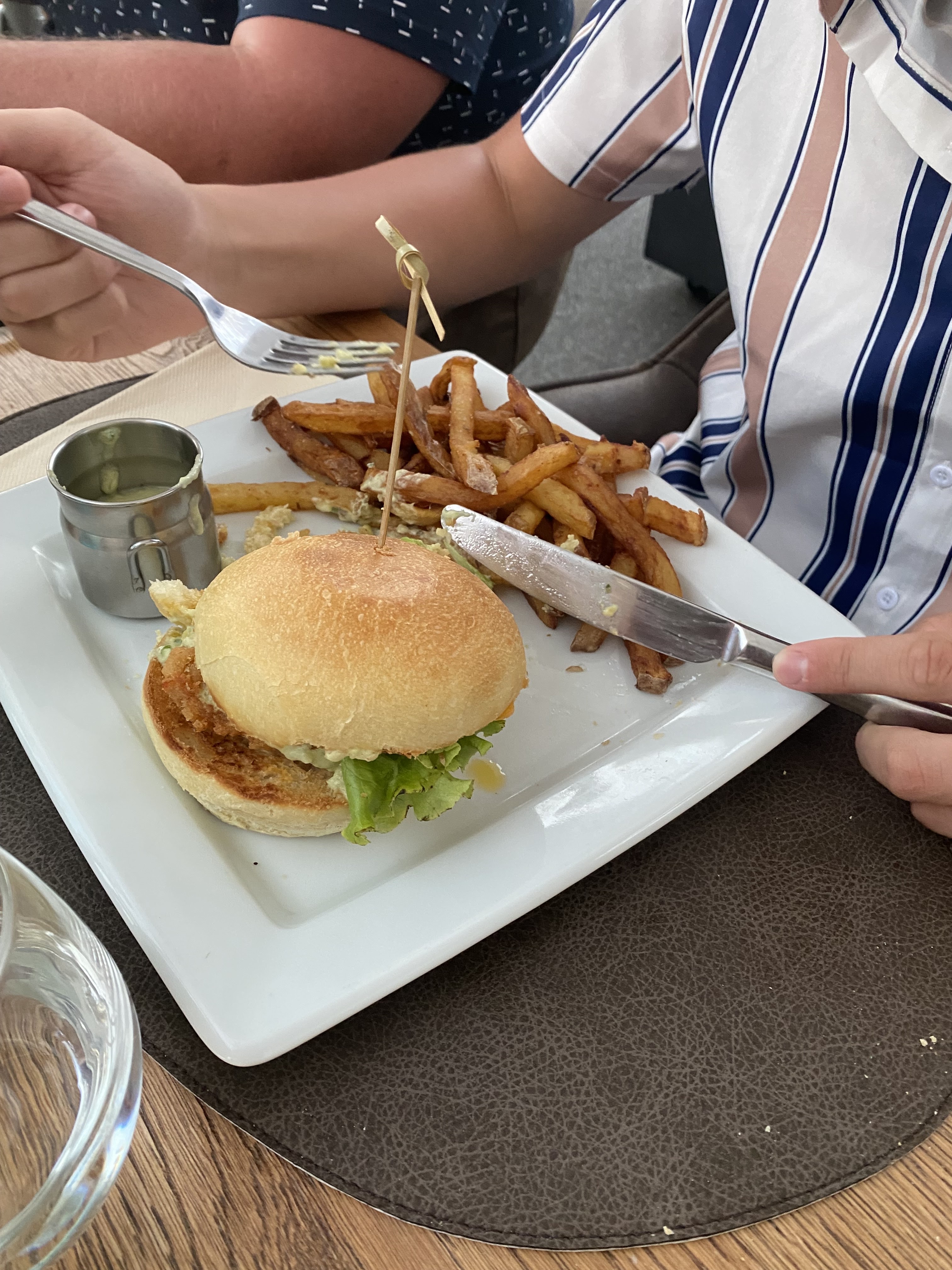 Sympathique restaurant disposant d’une terrasse ainsi que d’un grand espace intérieur où un pianiste jouait pour le plus grand plaisir de nos oreilles. Plats classiques et bien fournis (burgers, salades, viande rouge, planches, menus) Bon rapport qualité/prix Service rapide