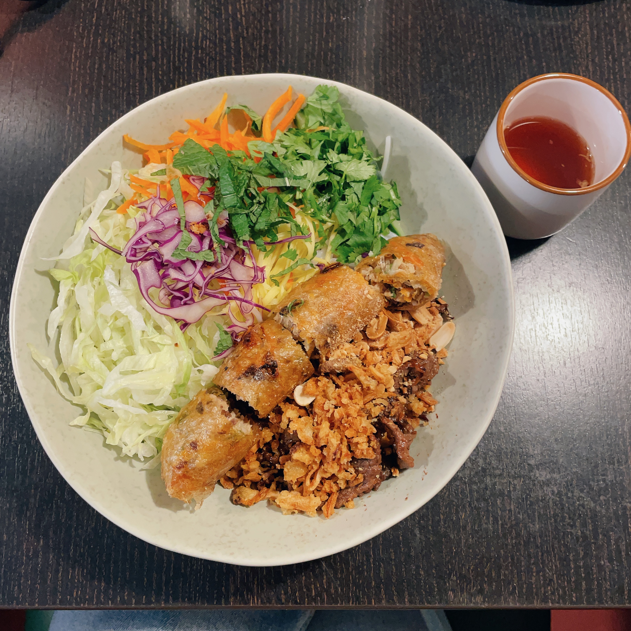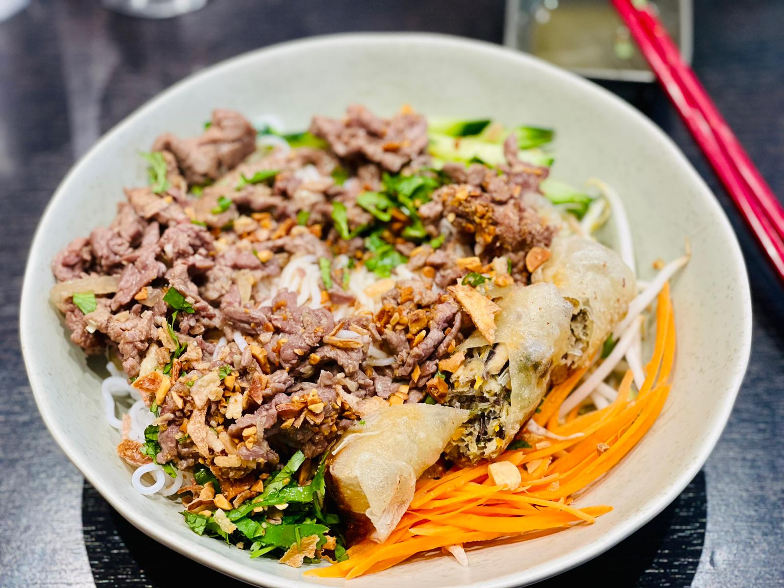 Je mets 5 étoiles avec réserve : je voulais commander le porc au caramel mais ce dernier n’était pas dispo donc j’ai dû me rabattre sur le bo bun, de plus le café glacé que j’ai commandé (qui au passage était trop sucré et concentré à mon goût) est arrivé quasiment à la fin du repas ce qui est bien ballot. Mais ces bémols au niveau du service sont rattrapés par la qualité du plat : c’est tout simplement le meilleur bobun que j’ai jamais mangé jusqu’à présent. La sauce est exceptionnellement bonne, tous les ingrédients sont archi frais (ce qui est très important dans ce plat), j’ai également adoré le bœuf émincé qui est cuit à la perfection avec beaucoup beaucoup de saveur. Le nem était très bon également, plus raffiné et riche que la majorité de ceux servis en restaurant, mais au niveau du goût je n’ai pas été autant impressionné que le reste. En tout cas ce fut un vrai régal pour les papilles et on sent l’amour et l’authenticité qu’il y a eu dans la préparation du plat. C’est vraiment dommage que le service ait autant pêché. Je reviendrai pour tester leur fameux plat signature, j’espère que j’aurai une meilleure expérience.