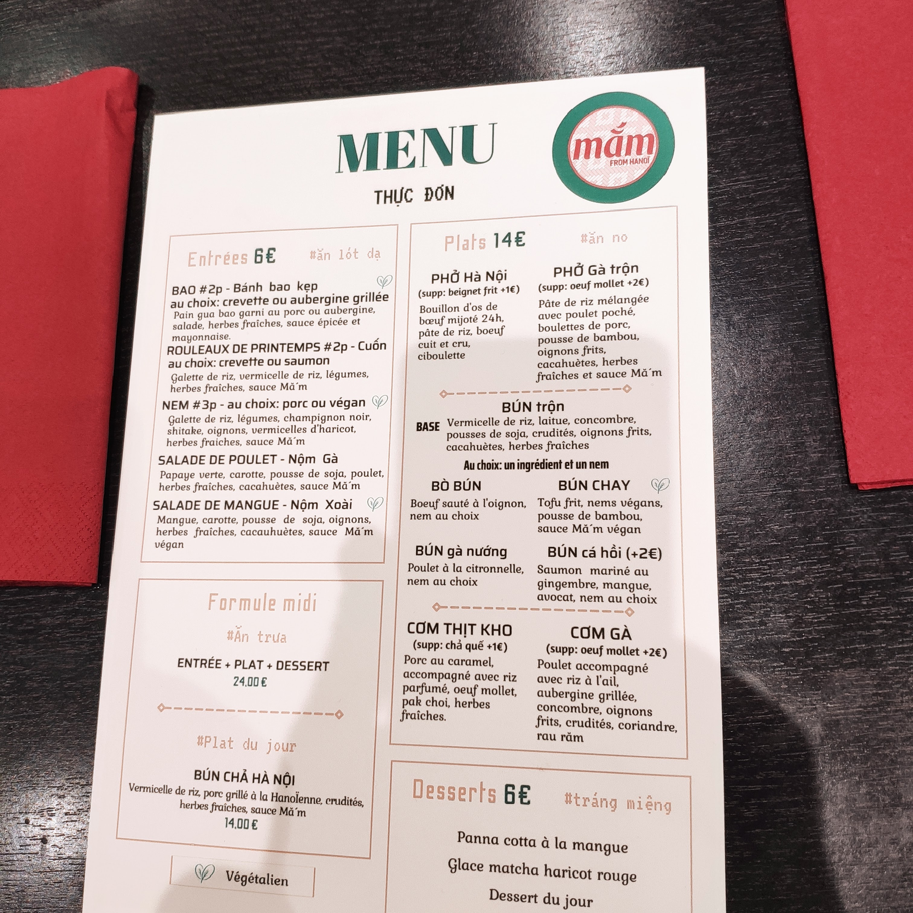 Je viens du Vietnam et Mam est le restaurant vietnamien le plus authentique que je puisse trouver à Paris. La soupe Phở est exactement la même goutte que vous pouvez trouver dans les rues de Hanoi. Excellent bún chả et les nems sont si croustillants et délicieux, à ne pas manquer. Je recommande vivement ce petit restaurant à tous ceux qui veulent découvrir les goûts originaux de la cuisine vietnamienne