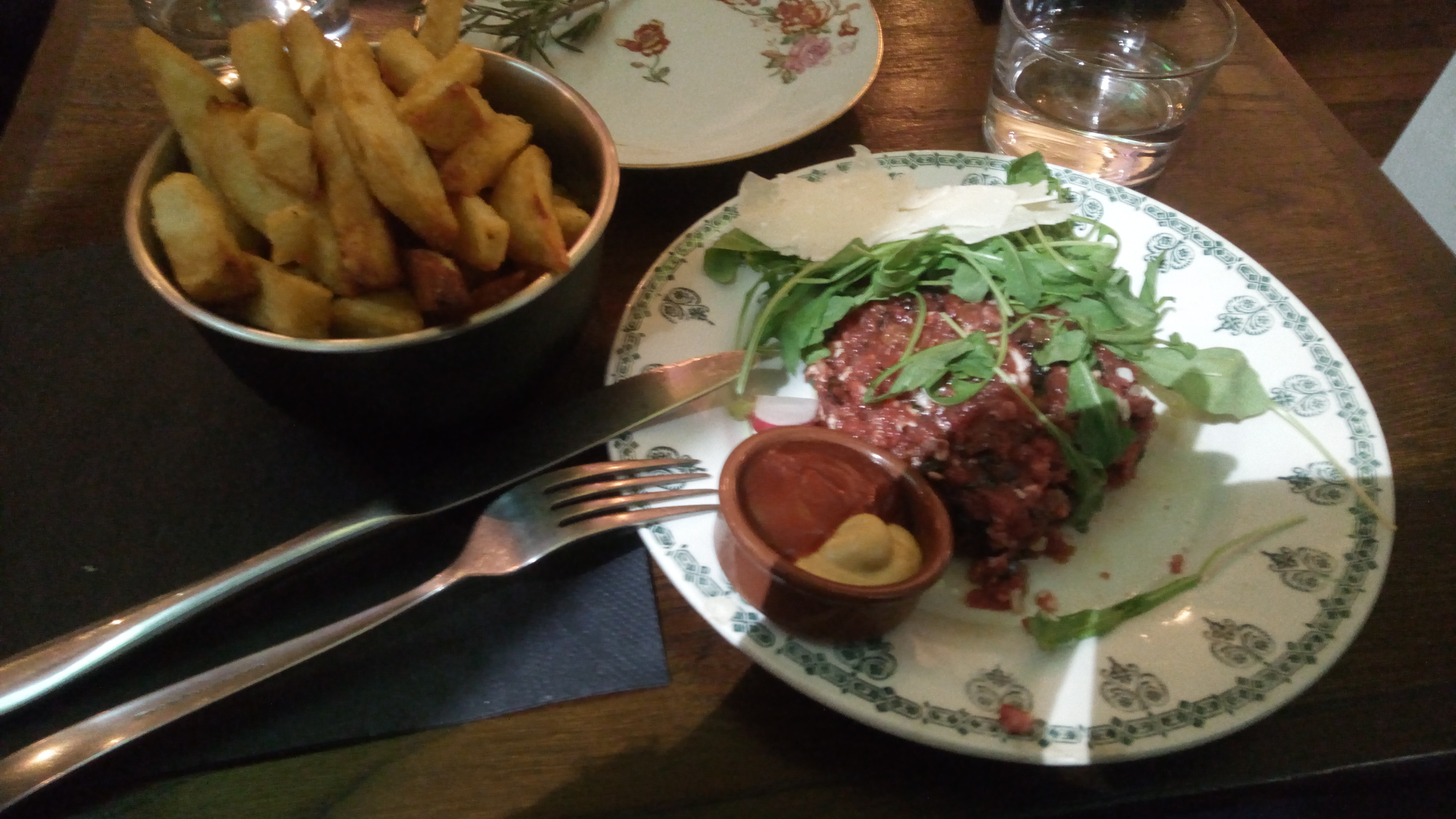Super ambiance, confortable mais pas à l'étroit. Exactement ce que nous recherchions après une longue journée de marche. La nourriture était délicieuse, nous avions tous les deux un hamburger avec des frites. Patty était faite maison et fonctionnait très bien avec les saveurs françaises des autres garnitures. Les chips étaient grosses et croustillantes, parmi les meilleures que j’ai eues depuis longtemps. En dessert, je recommande vivement le tiramisu.