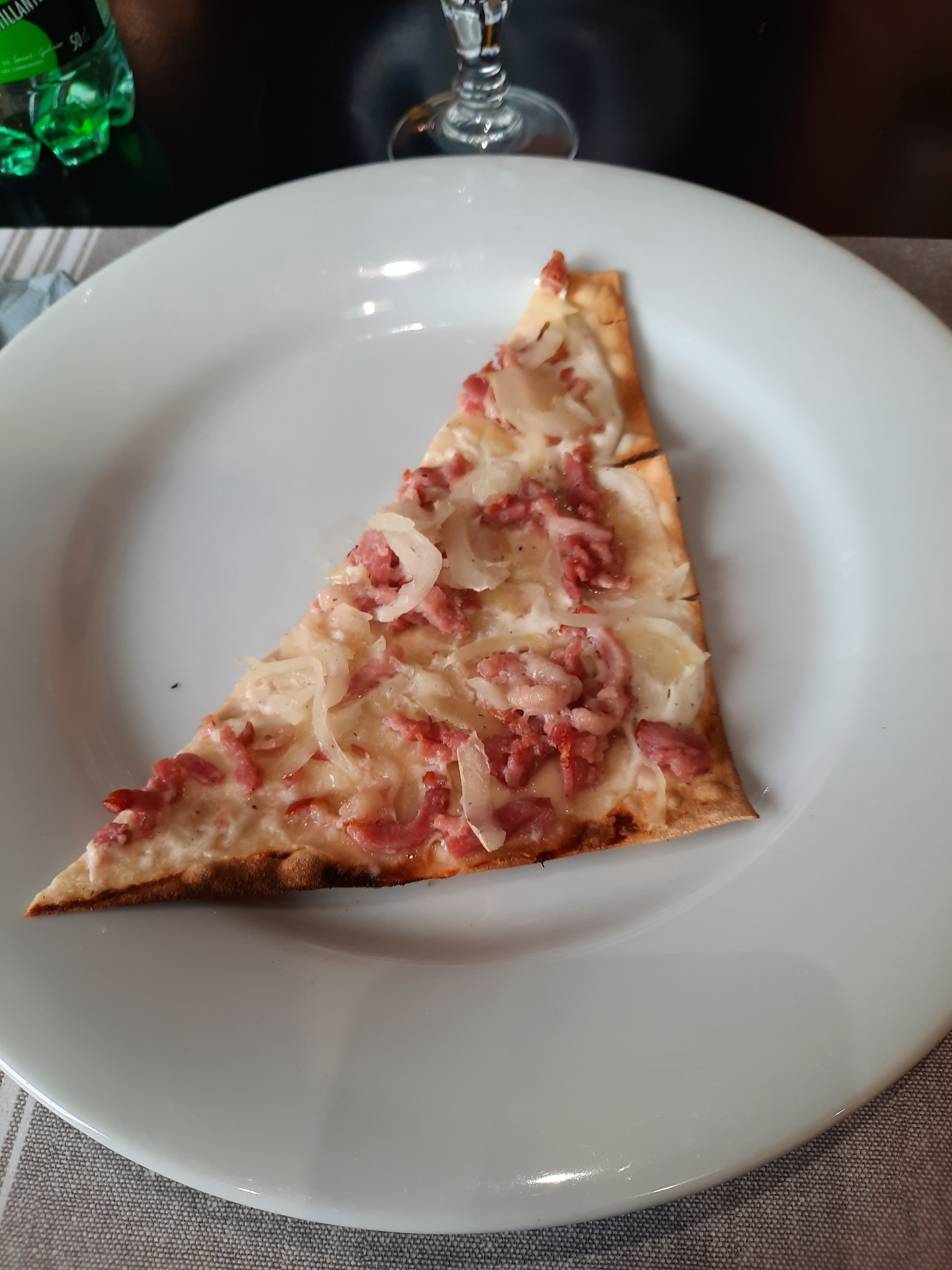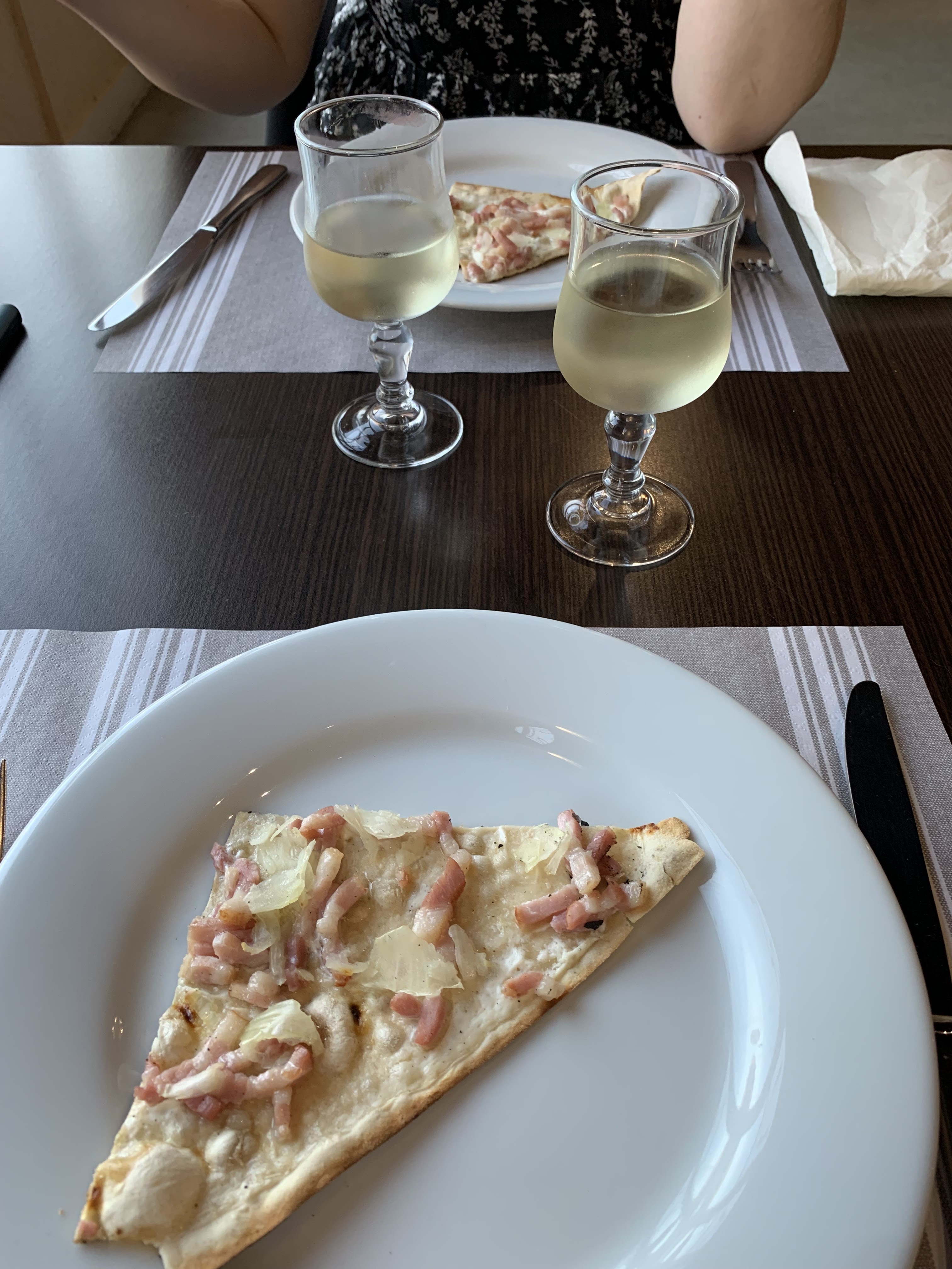 Très belle découverte de la spécialité locale. La propriétaire et le serveur son juste génial. Le menus du soir a 22€ avec compris un vin moelleux en apéritif avec une part de tarte , l’entrée , le plat et le dessert + 1/4 part personne de vin . (Repas très copieux) Vraiment abordable et surtout le rapport qualité prix est super . Tous est cuisiné maison part la propriétaire !! Restaurant à l’étage avec salle climatisé pas de terrasse Je recommande vivement ce restaurant