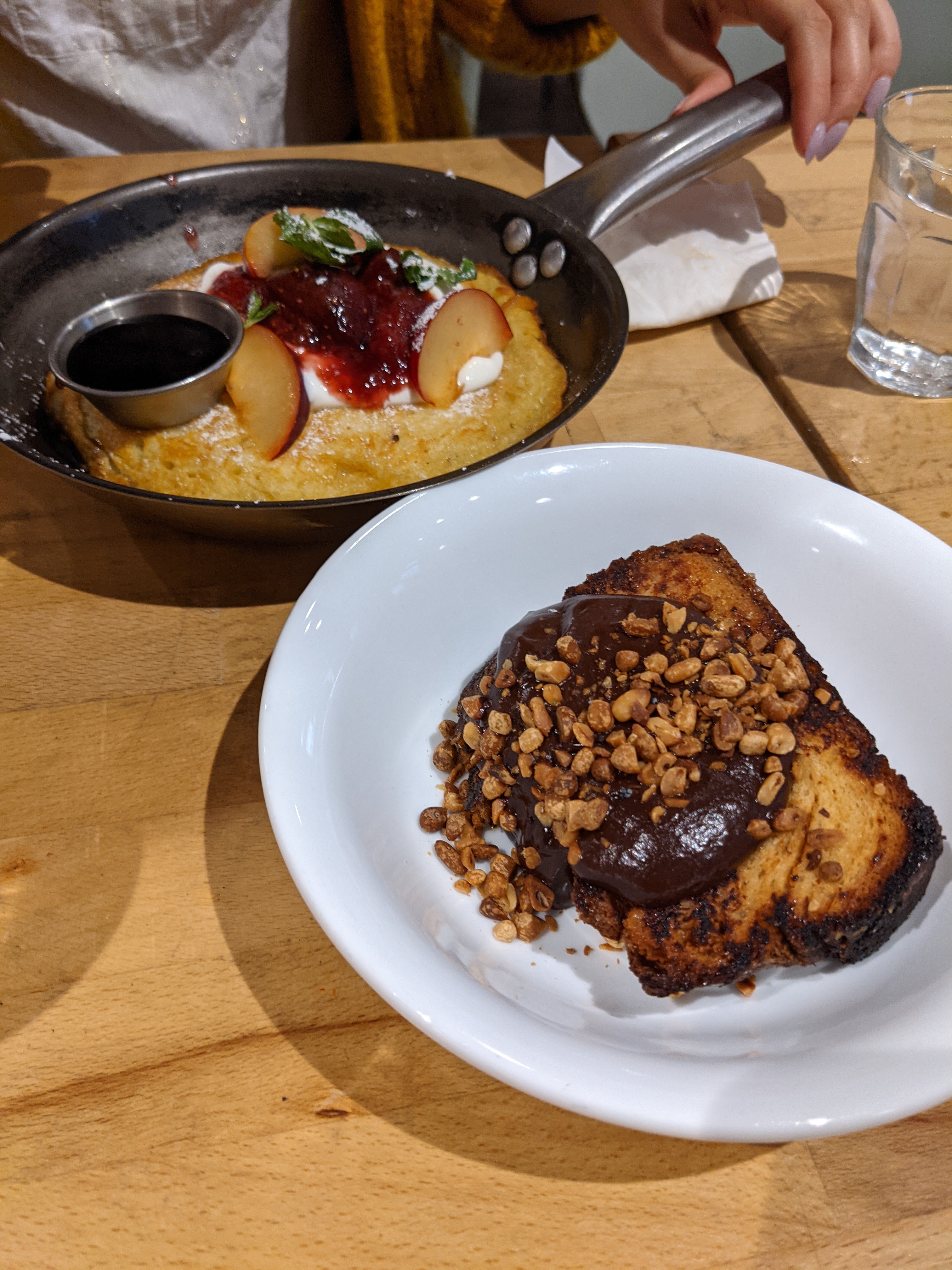 Très bon brunch du dimanche chez maafim. Nous avons eu la pizzette, la patate douce et le pain aux œufs, puis la crêpe et la babka en dessert. Nous avons adoré ❤️