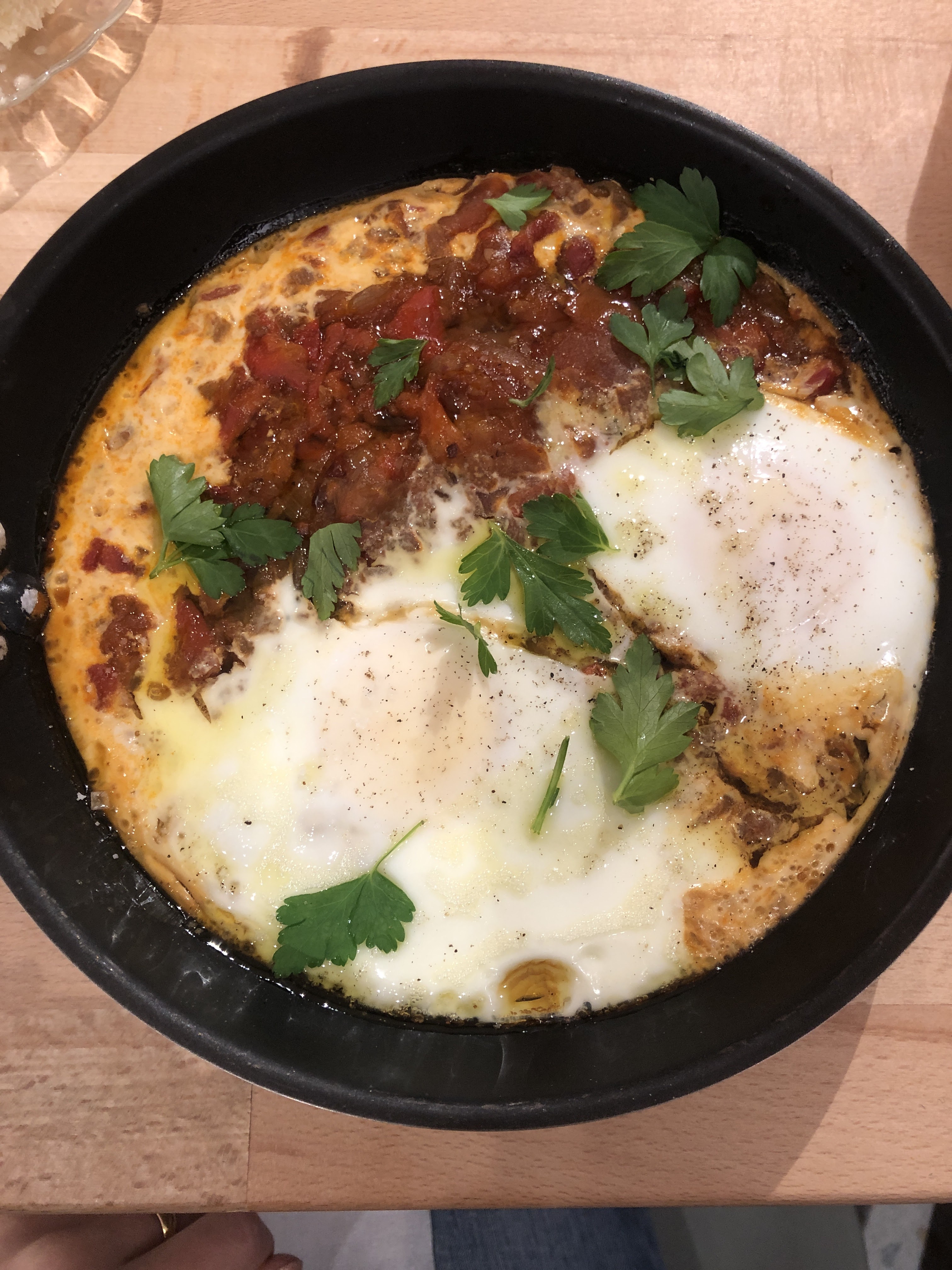 Au cœur du sentier. Cuisine israélienne. Belle assiette israélienne, tchukchuka servies avec ses œufs dans une poele. A boire : bonne limonana citron et menthe pas trop sucrée