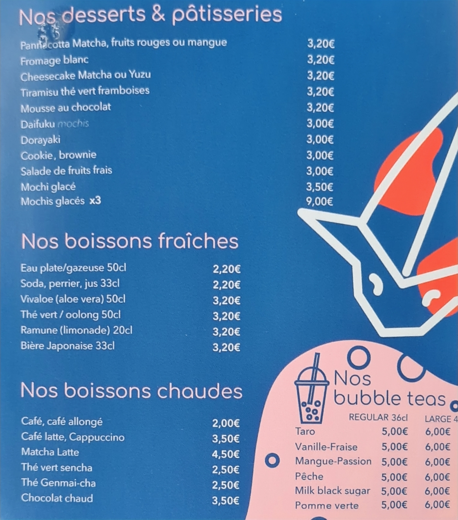 Les restaurant donne envie, mais la qualité des ingrédients n’est pas satisfaisante. J’ai pris un bento a emporter et j’ai ressenti que tous les ingrédients n’étaient pas spécialement frais. Pourtant en tant que resto japonais il est important que les ingrédients le soient. Le bubble tea au taro était inbuvable et n’avait pas le goût de taro. Par rapport au rapport qualité-prix, je dirais que ce n’est pas adapté. Je suis déçue de mon achat, mais malgré tout j’ai pu bien manger et c’est l’essentiel.