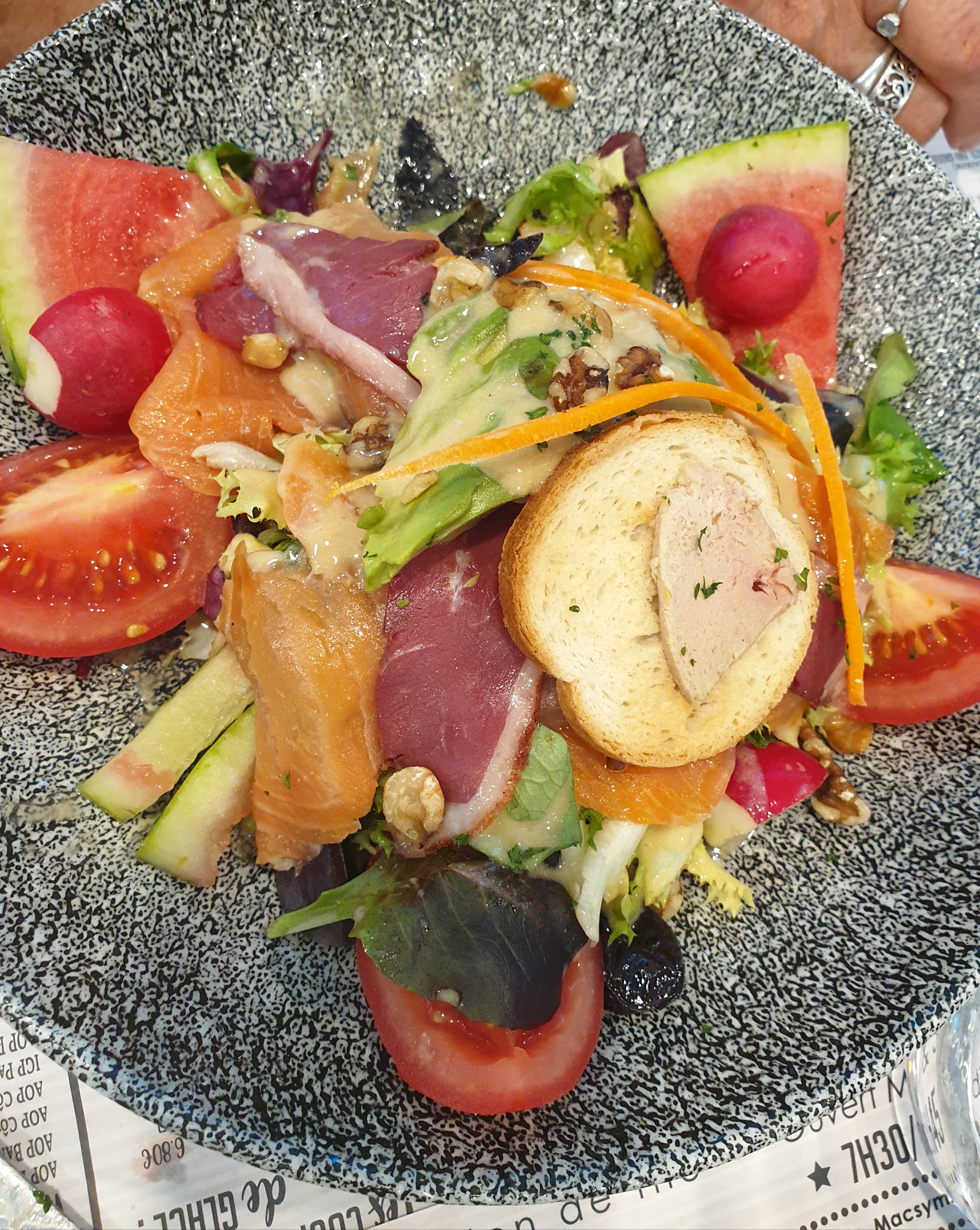 Une HONTE , une salade avec 5 tomates cerises froides et sans goût , 4 maïs en boîte et 3 feuilles de salade avec au beau milieu une poignée de semoule froide et humide .... 26 euros !! Vous ne me reverrez plus !