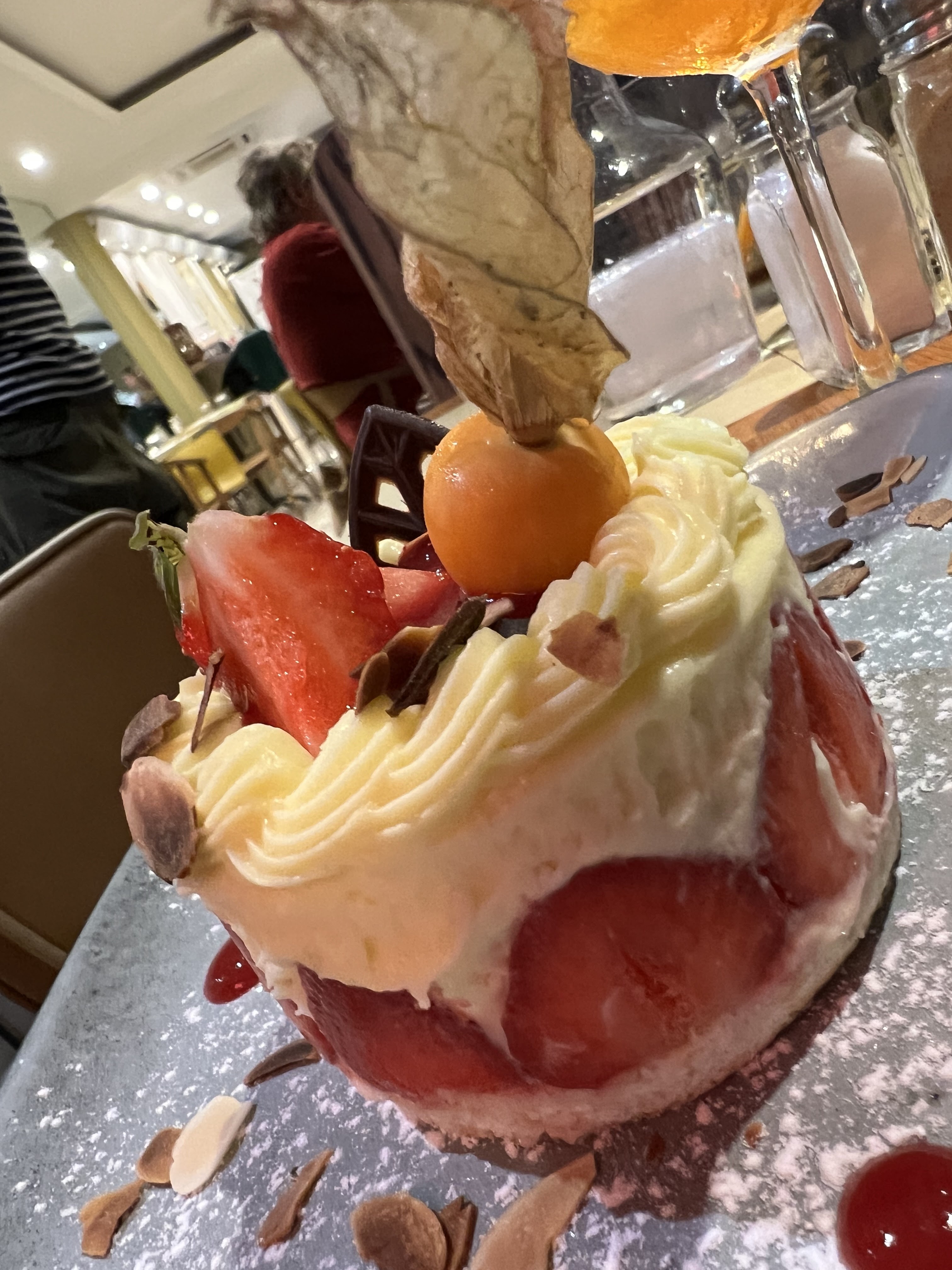 J’ai commandé un fraisier, je cherches encore les fraises beaucoup trop de crème, une assiette de tapas très mauvais rapport qualité prix, et un crumble qui a sauvé la mise de ce repas décevant