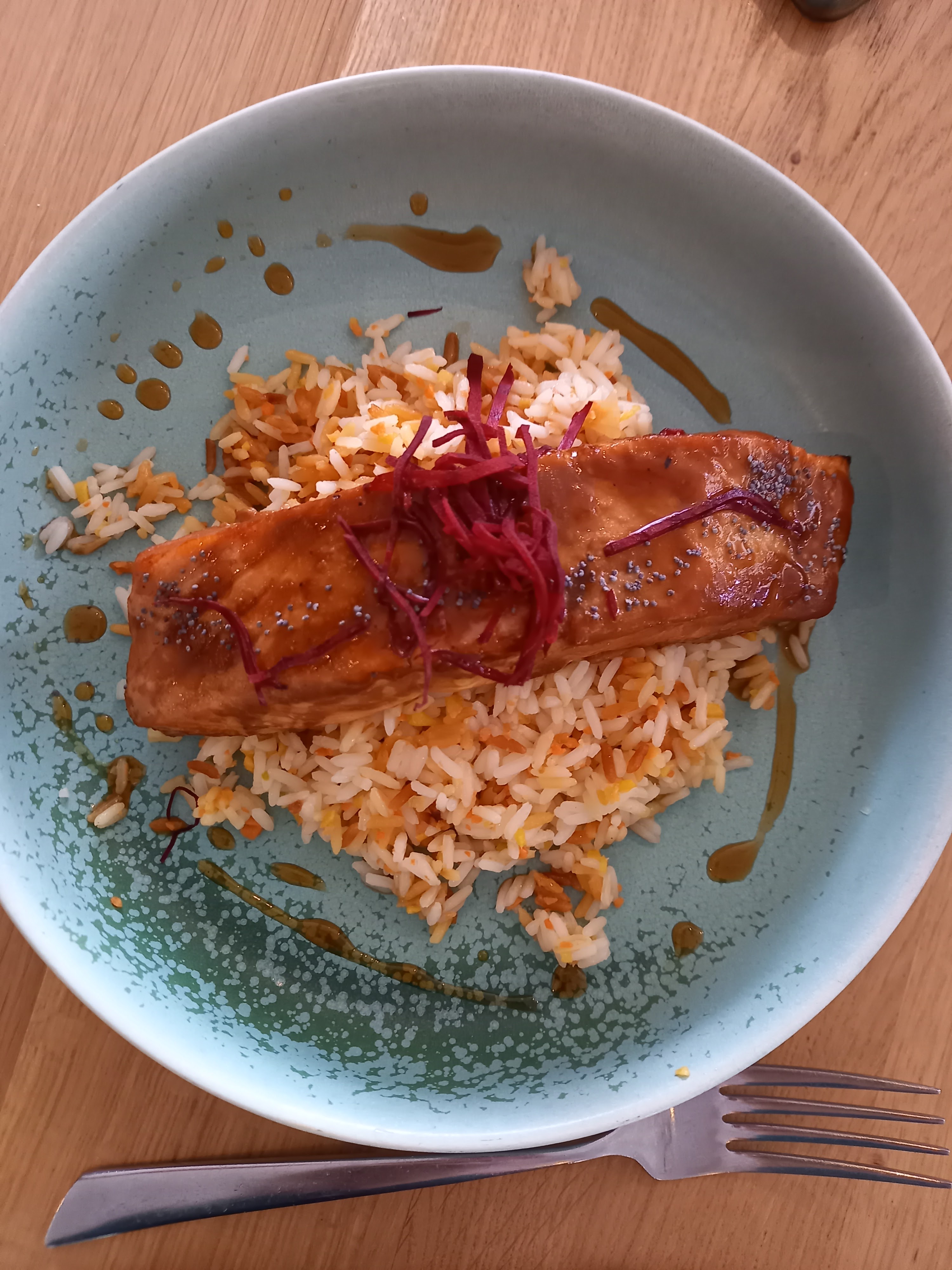 J'ai failli chialer 2 fois aujourd'hui. Conseillé par un autre restaurant qui était fermé pas loin, nous avons pris des plats que nous ne connaissons pas à madame bleue, j'ai pris un saumon laqué sauce miso et un rocher de roquebrune, même en étant vraiment vraiment fan de chocolat ce n'est pourtant pas le dessert que je retiendrai, même si il était très bon, la sauce de ce saumon était exceptionnelle, un goût que jamais je n'avais goûté 👌 Est ce que c'était le meilleur moment de ma journée ? Non, mais bon j'ai entendu le cœur de mon premier enfant juste avant, le meilleur des plat ne pourra jamais être à la hauteur ! C'était bon !