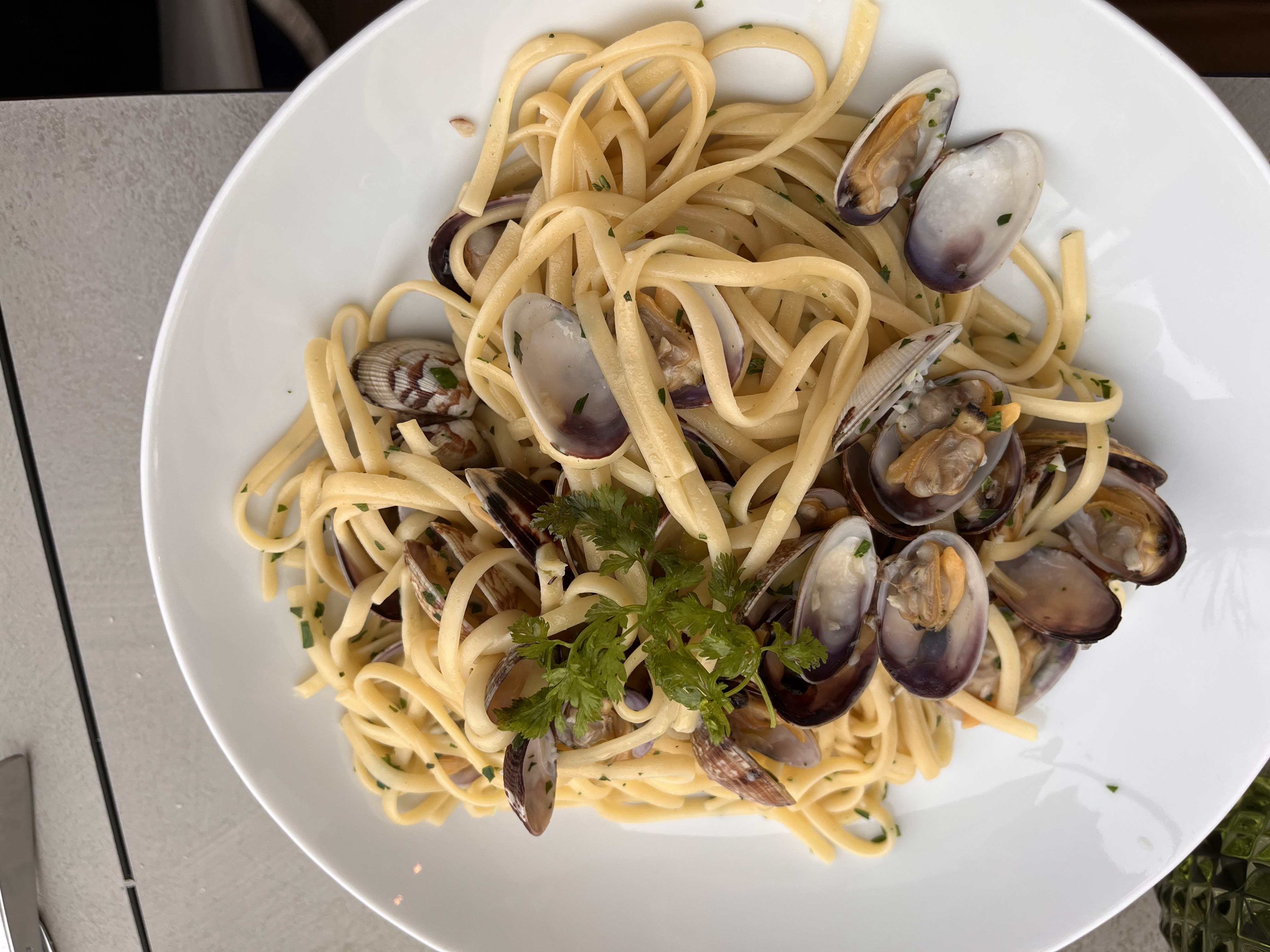 Nous y avons soupé en famille, sur la terrasse. Hélas, il n’y avait plus de place sur la terrasse près de la plage, il aurait fallu réserver. Le service était excellent. Tout le monde a aimé son plat (pizza en forme de fleur pour ma fille!, ravioli, linguine vongole, tataki de thon, saumon sauce miso)