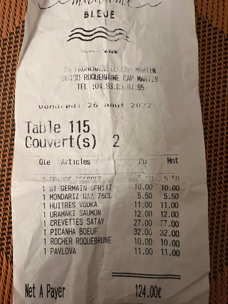 Ce nouveau restaurant s'inscrit dans le cadre magnifique du Cap Martin. La décoration en intérieur et en terrasse thématique est sobre et épurée, de très bon goût. A la carte: entrées, plats et desserts méditerranéens sont préparés avec des ingrédients locaux mais aussi d'Espagne/Italie, d'excellente qualité. Les pizze, entre autres, sont délicieuses et la pâte digne des meilleures sur la côte. Service impeccable. Rien à redire nous avons passé un très bon moment chez Madame Bleue. Je recommande !