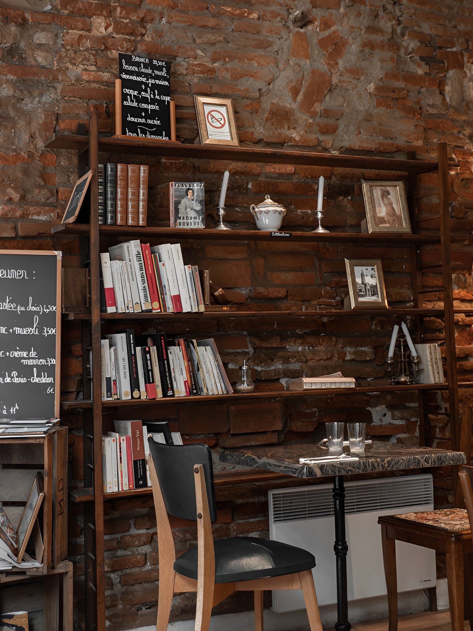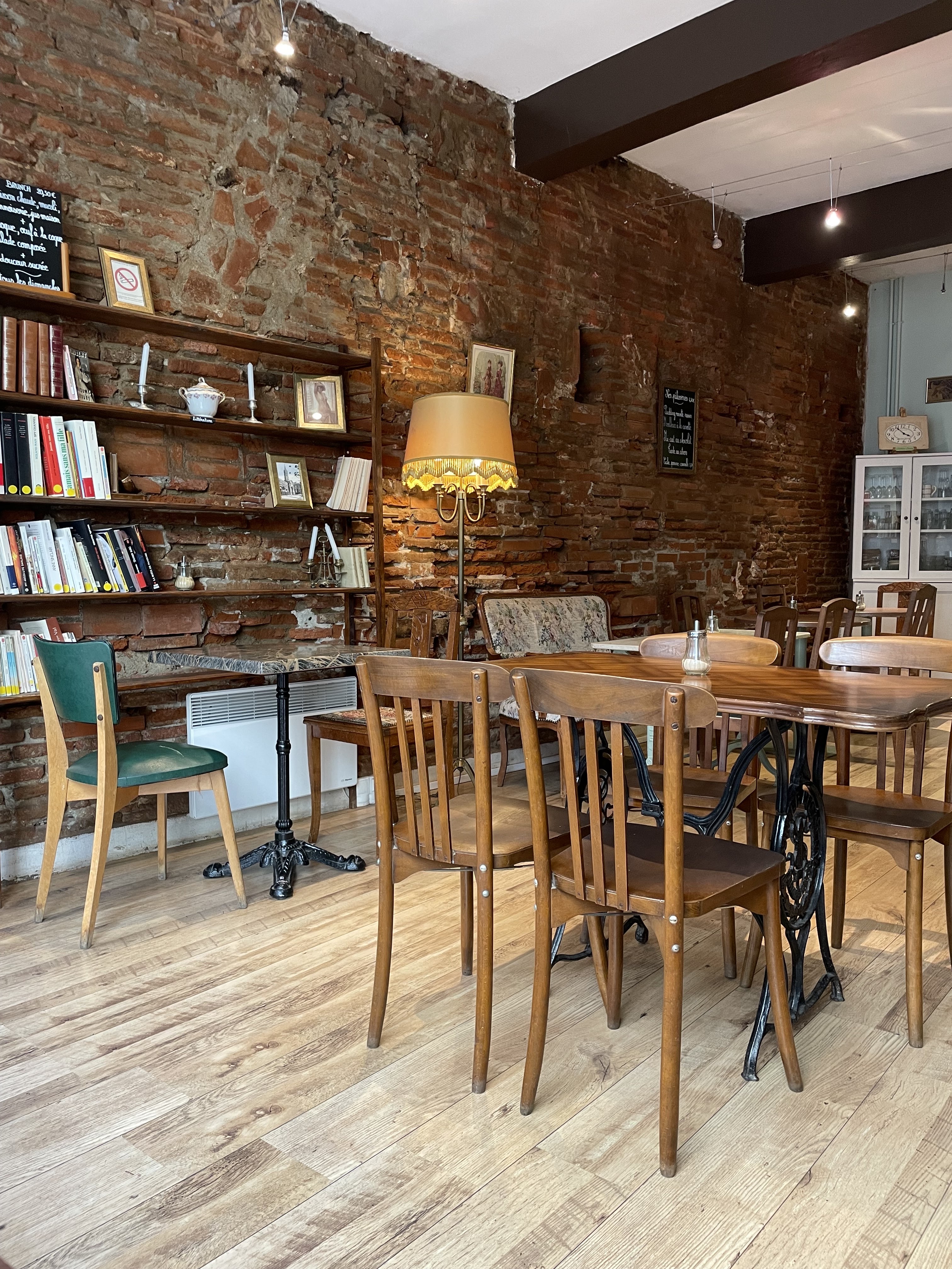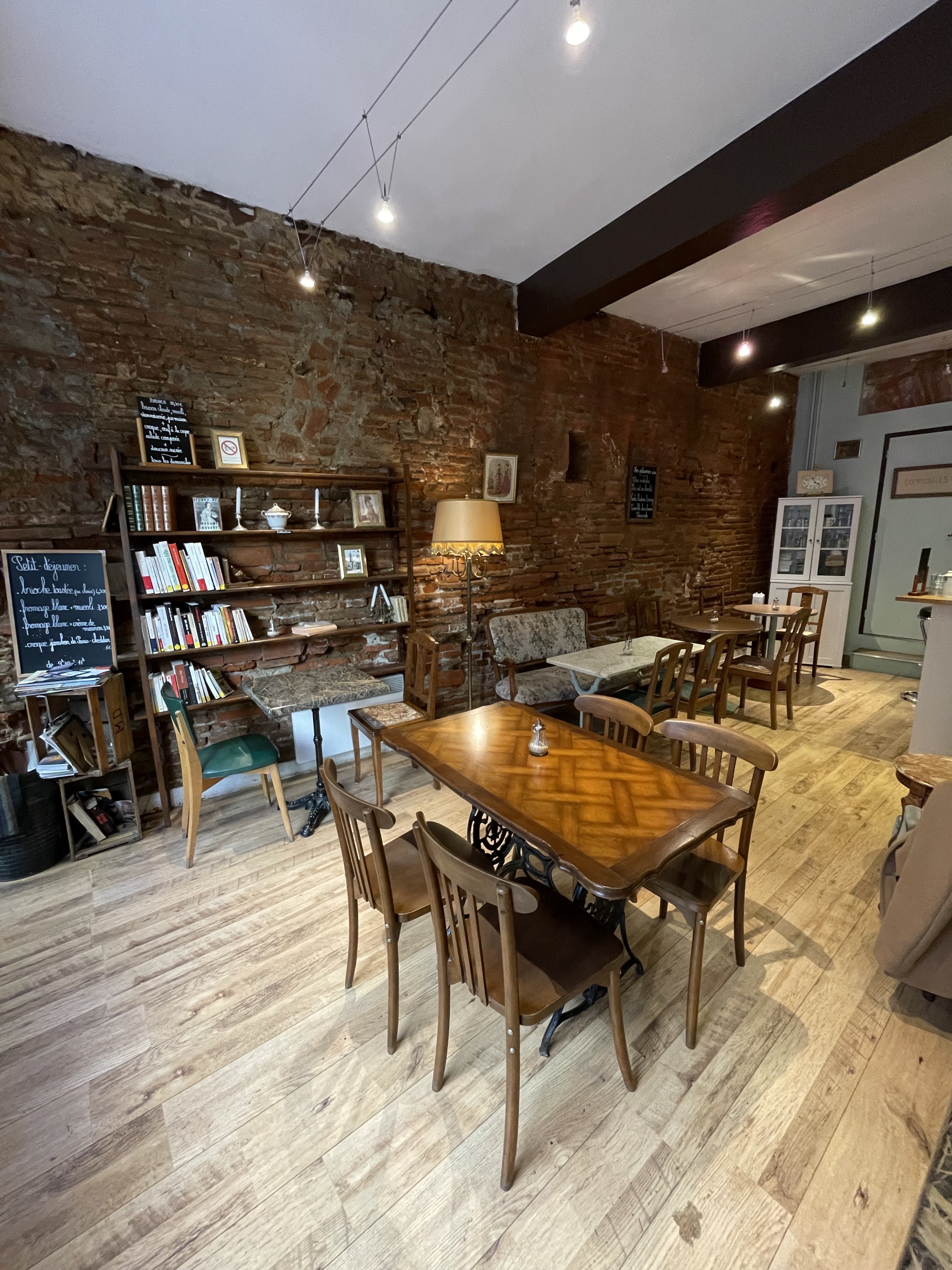 Deux fauteuils Louis XV dans la vitrine , des livres sur les bibliothèques, le mur de briques toulousaines ... et voilà, vous partez dans des rêveries romantiques ... agrémenté d'un accueil fort chaleureux et sympathique ! ... à bientôt !