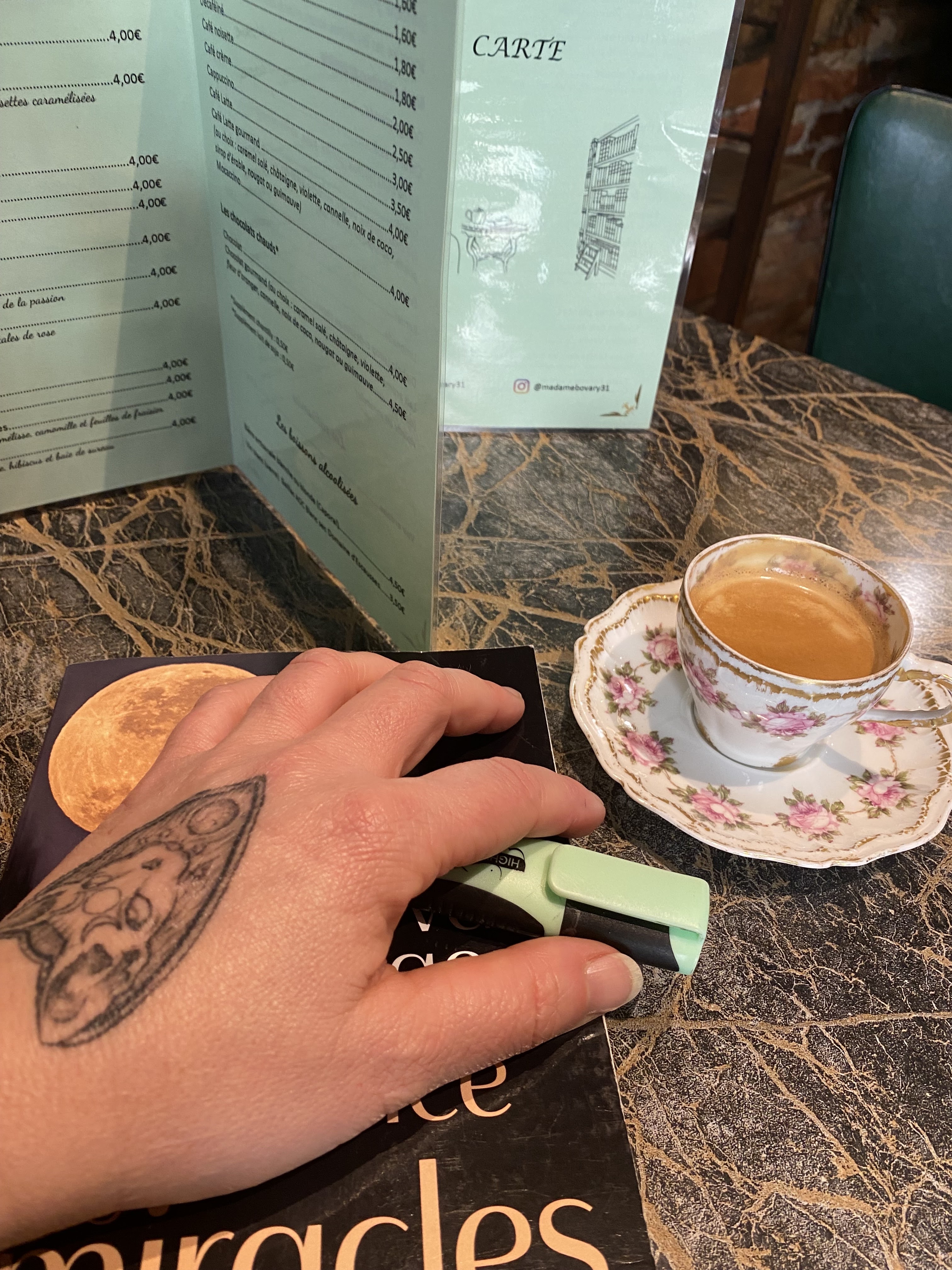 Parfait pour une petite halte romantico-poétique. La tenancière (oserais-je l'appeler Emma) a su par ses allures élégamment Flaubertiennes rendre cet endroit charmant. Le concept de café littéraire m'a également beaucoup plu, d'autant qu'il est possible de lire Madame Bovary sur place. :) En tant que fan de l'esthétique ''dark academia'', j'ai aussi adoré la décoration (tenture pittoresque drappant les murs des ''commodités'', chandeliers et tasses de porcelaine floquées d'imprimés d'époque). J'aurais juste rajouté dans un petit cadre un portrait de Léon (de préférence, celui incarné par Ezra Miller dans le film Madame Bovary). :) <3 Merci pour ce moment hors du temps.