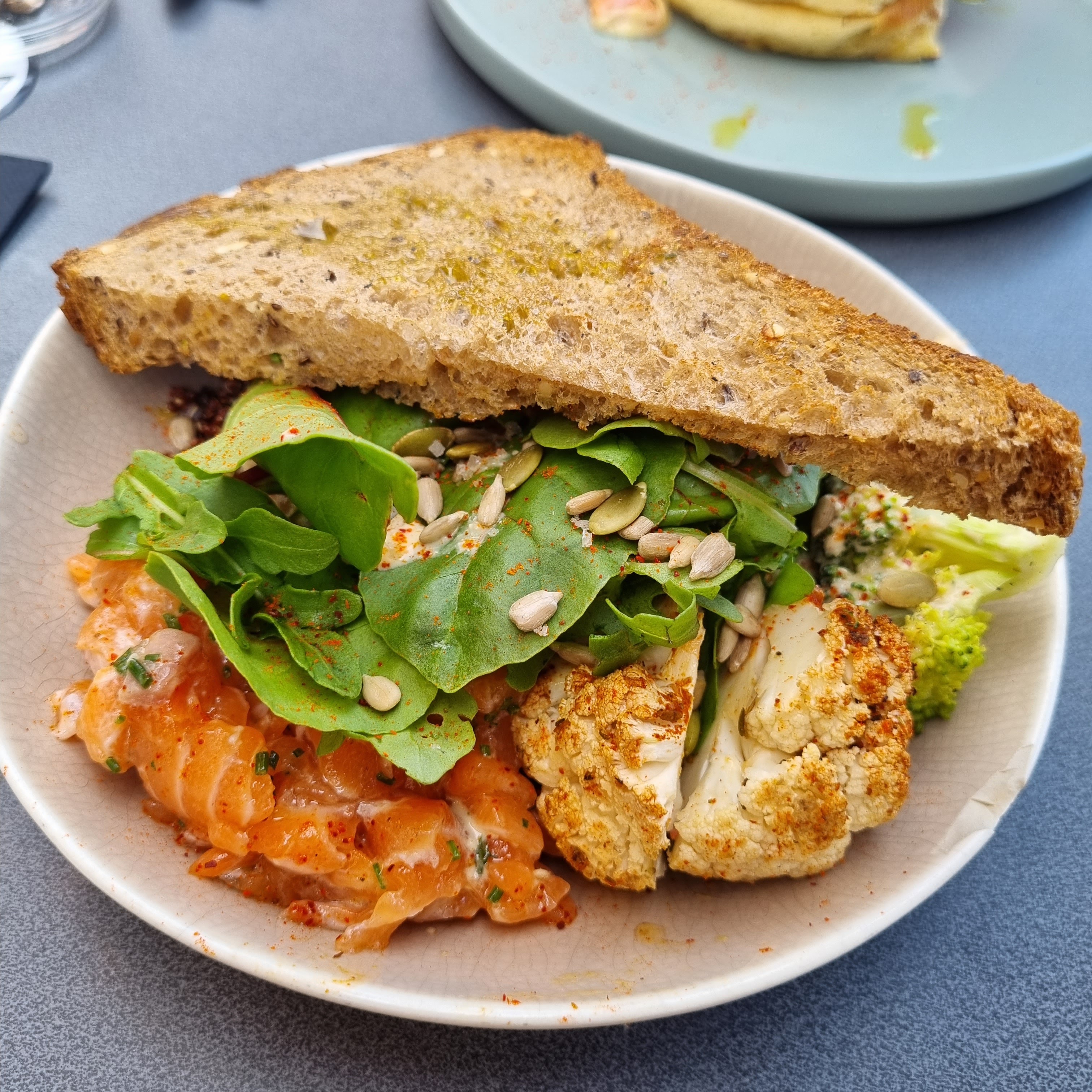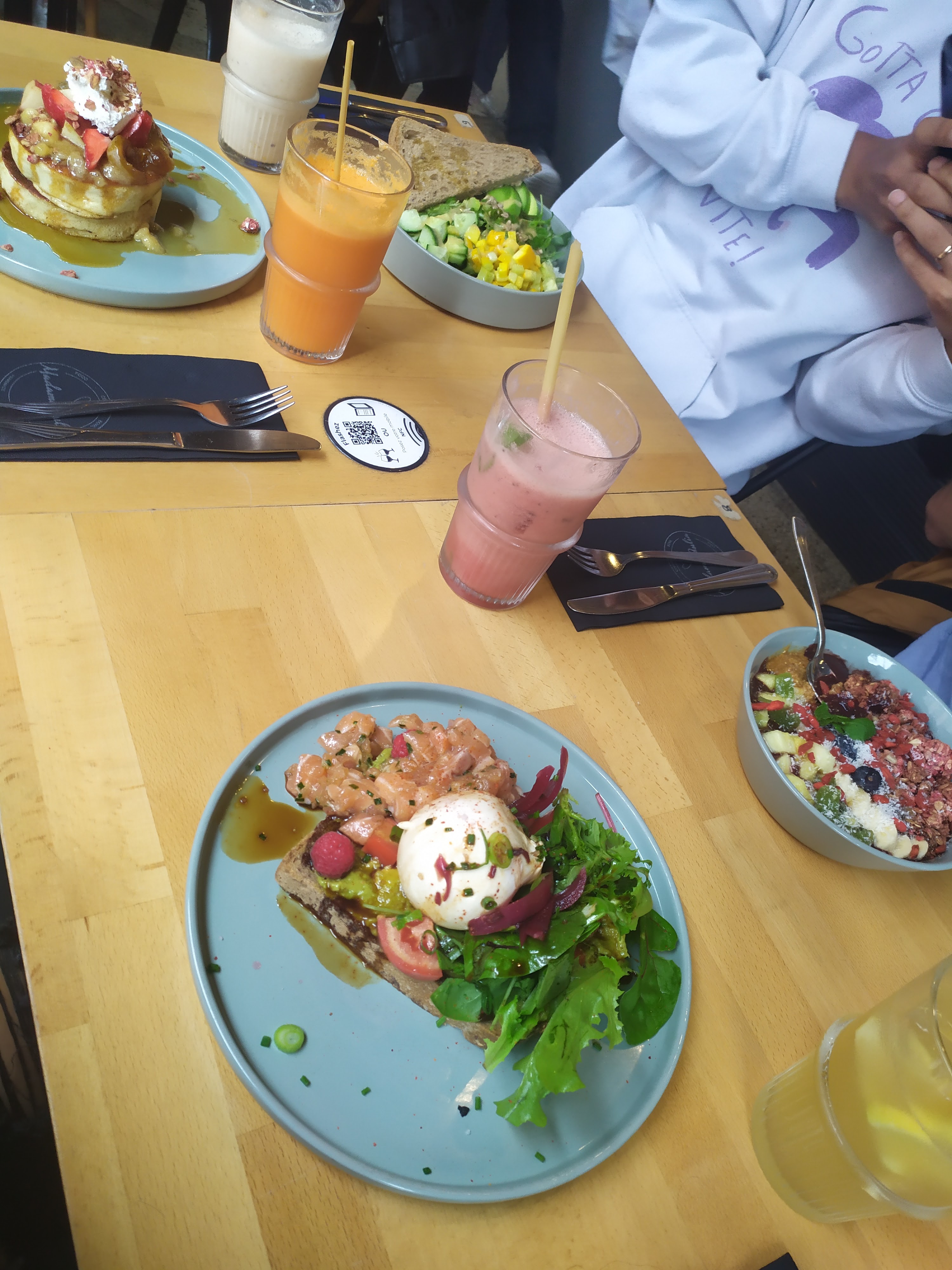 On peut y aller aussi bien pour le petit dej que pour manger. Les plus : Établissement très jolie, j'aime beaucoup la déco. Les employés sont très souriant et nous renseigne bien. Les plats sont frais, et j'adore les mélanges qui sont fait. J'ai pris un Bowl saumon(qui contenait un avocat, brocolis, concombre...) Et la sauce aussi très bonne. C étais frais et fait maison. En dessert j'ai pris un cheesecake qui était tres bon niveau goût et quantité. Les moins : le prix des Bowl(12€-14€) est un peu élevé par rapport à la quantité.