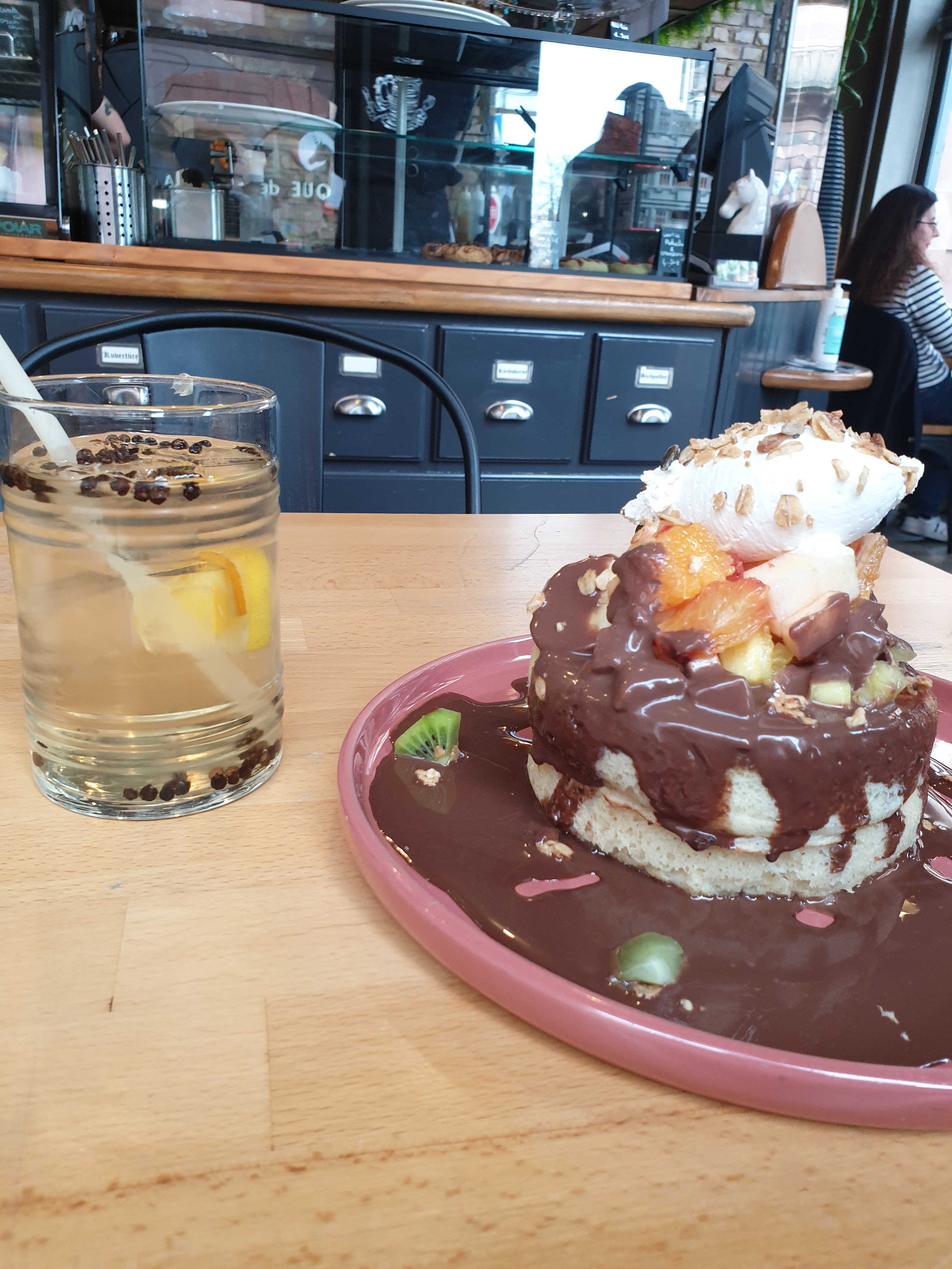 J'y suis allée pour le goûter un samedi à 16h, il y y avait du monde mais encore de la place. J'ai été très bien accueillie ! J'ai pris un Water détox. Je pense qu'il manquait le romarin et l'ananas pourtant indiqués dans sur le menu. J'ai également pris les pancakes fruits/chocolat. C'était délicieux ! Il y avait peut etre un peu trop de sauce chocolat. Les pancakes étaient moelleux et aérés. J'y retournerai pour tester le brunch !