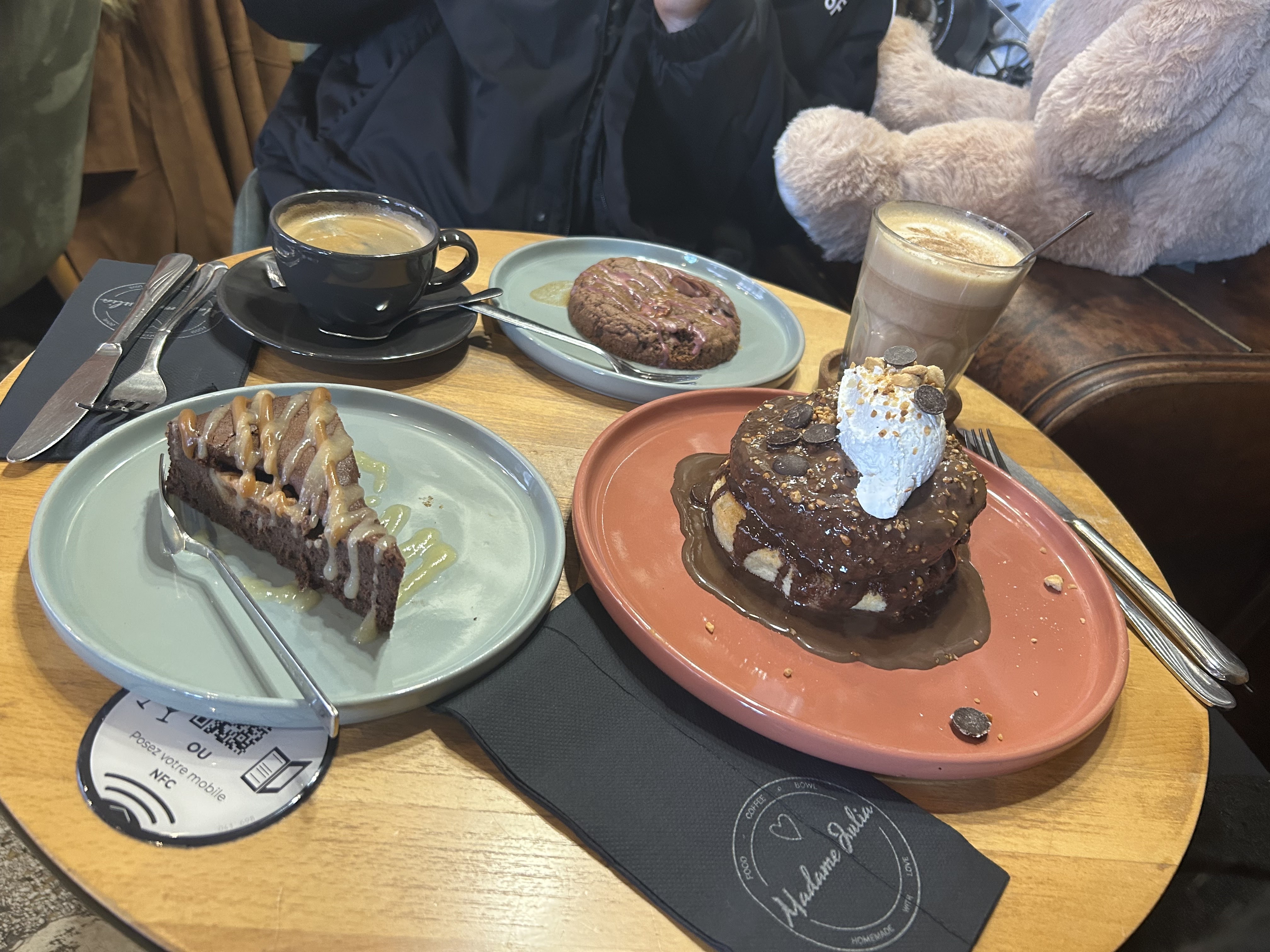 Très bon moment chez Madame Julia. Nous avons testé le brunch un dimanche matin vers 12h30. C’est après 20 minutes de queue dehors (pas de réservation possible) que nous avons pu être installées à l’intérieur. Il n’y a pas de formules ou menu possible pour le brunch (dommage..), c’est plat par plat. L’ambiance est sympa et les pancakes moelleux et savoureux. Nous avons testé, ceux à l’effiloché de bœuf, en dessert la brioche perdue. Petit problème à la caisse mais qui a été rapidement réglé. Très contente de cette découverte, juste dommage de ne pas prendre les resas et qu’il n’y ait pas de menus.