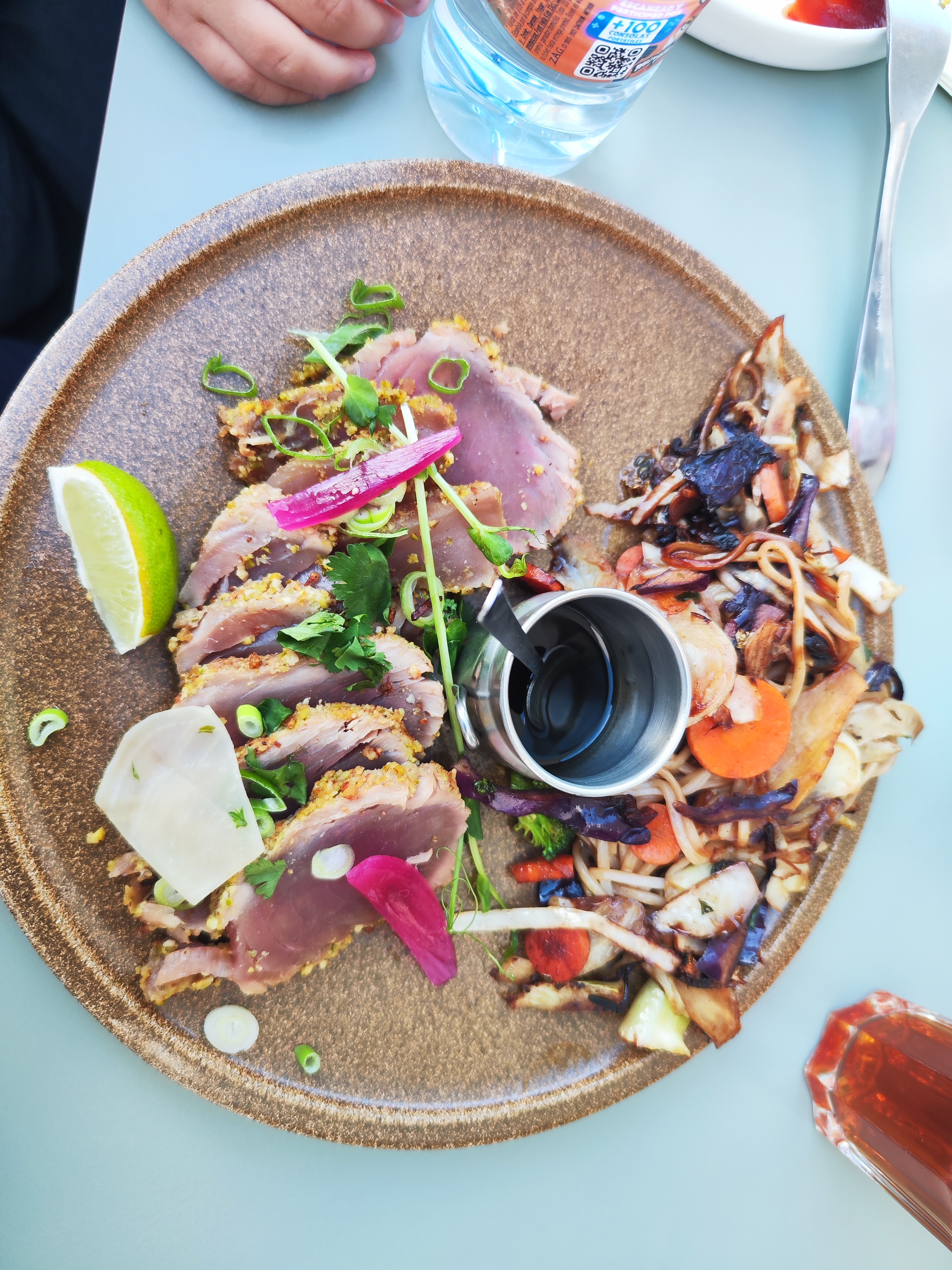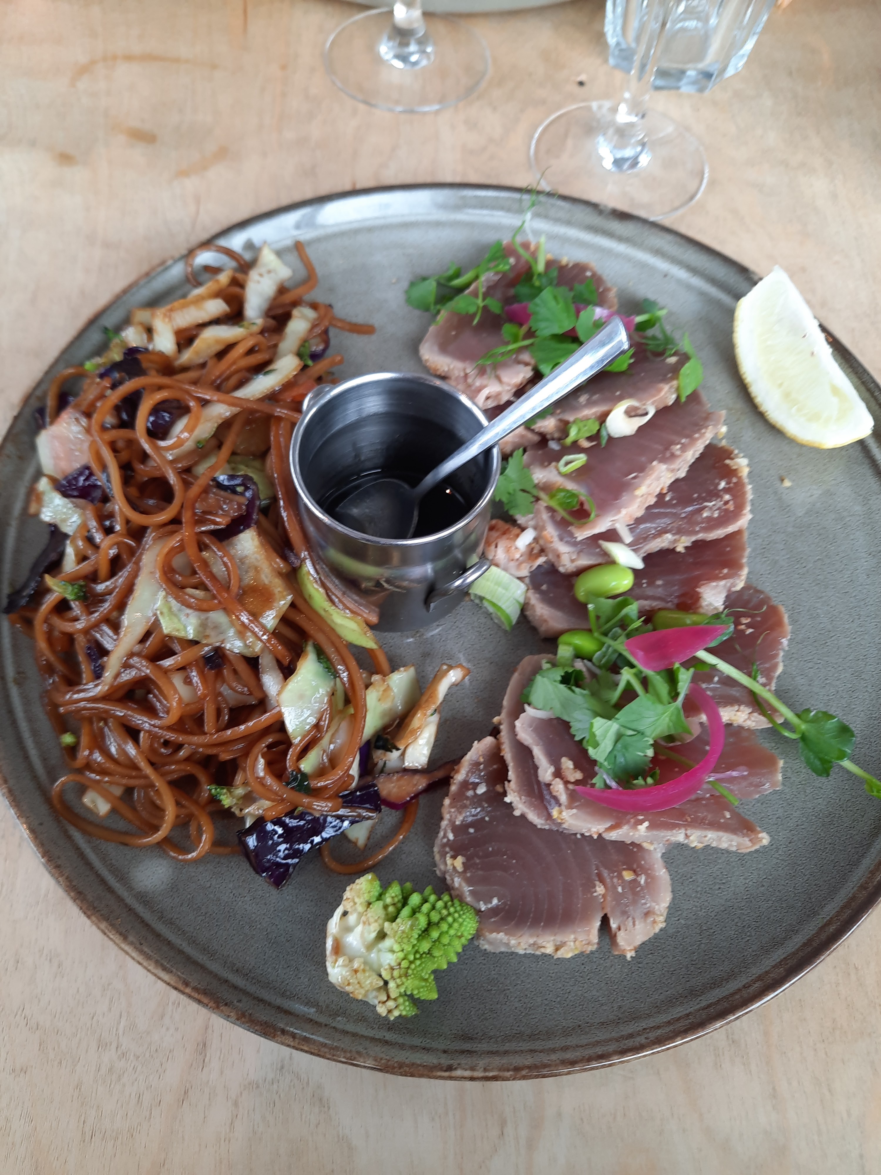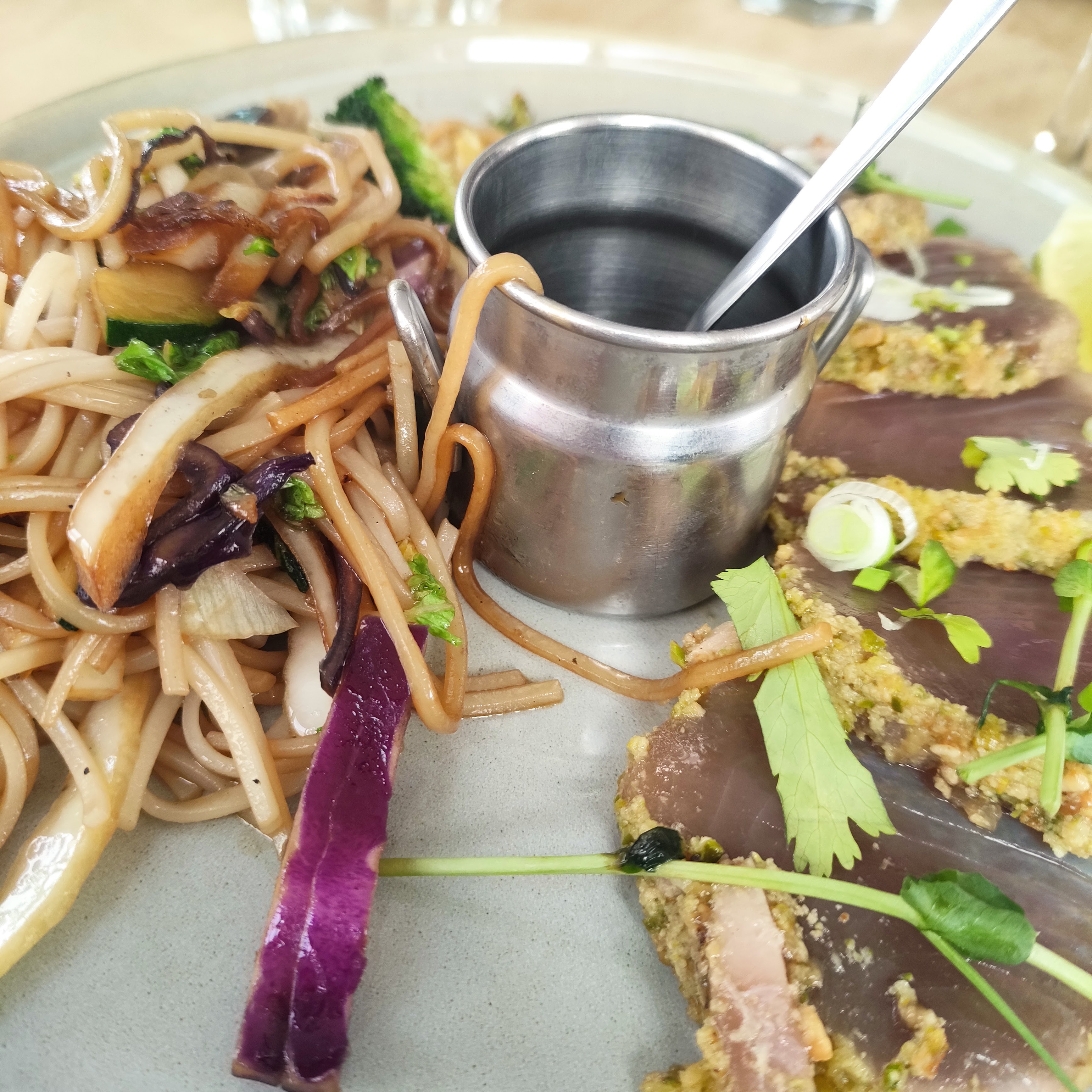 Venir pour la vue oui, pour la cuisine non. J'ai commandé le tataki de thon , portion minuscule pour le prix (un peu de chou râpé et trois pâtes ne font pas un accompagnement). J'aurais voulu un plat de poisson chaud, malheureusement il n'y en avait pas.