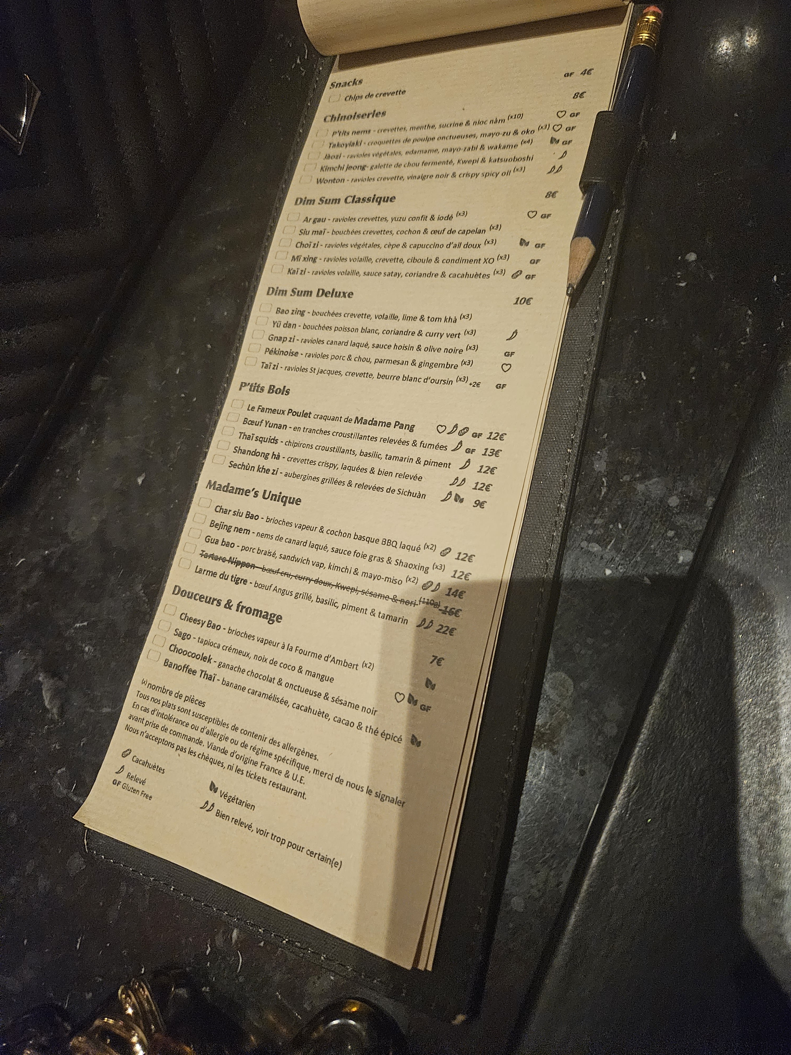 Avec mon ami, nous avons diné chez Madame Pang. Excellents plats serveurs très agréables. Pensez à réserver car nous avons dû attendre une demi-heure avant d avoir deux places Nous le regrettons pas et recommandons vivement cet établissement.