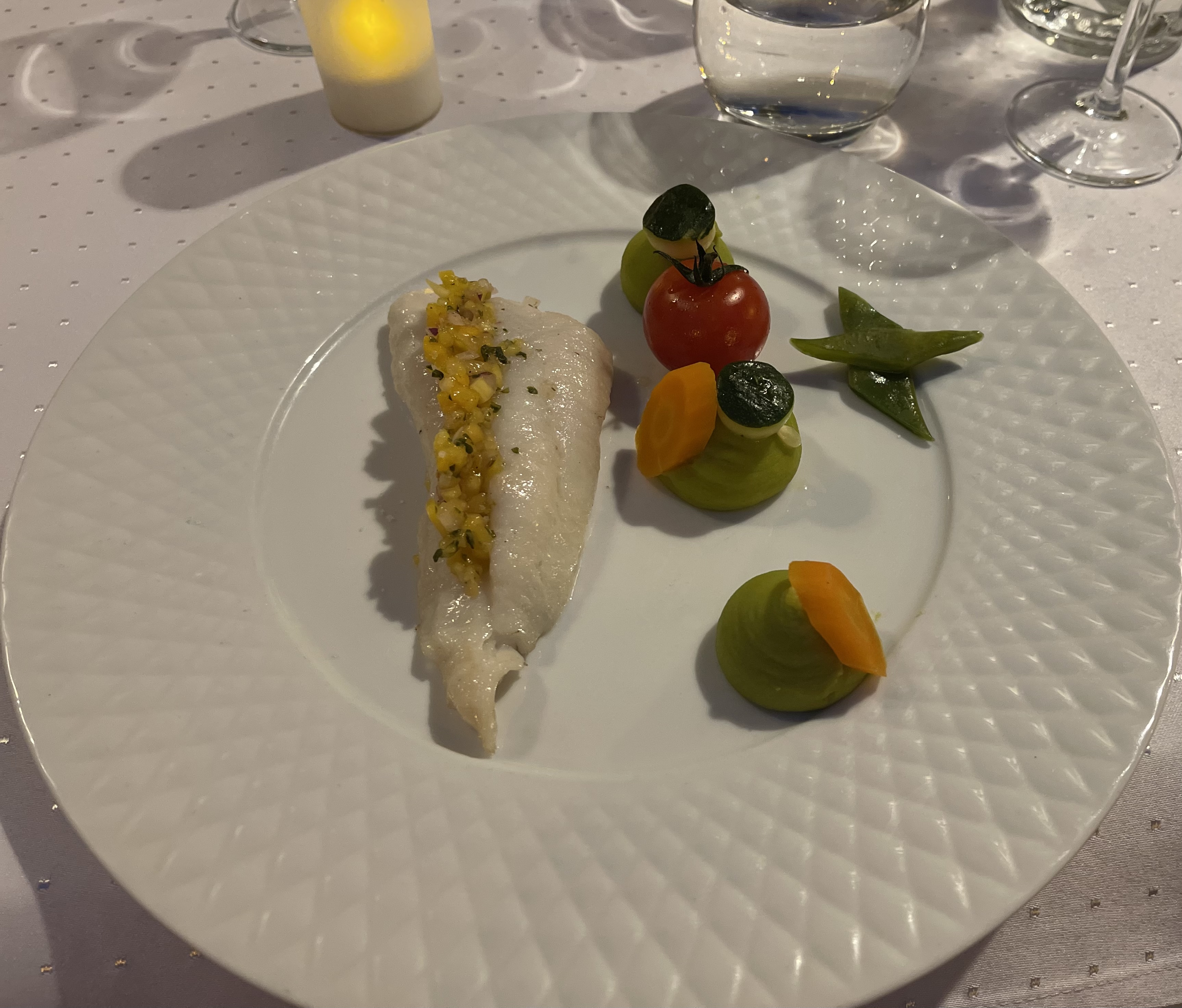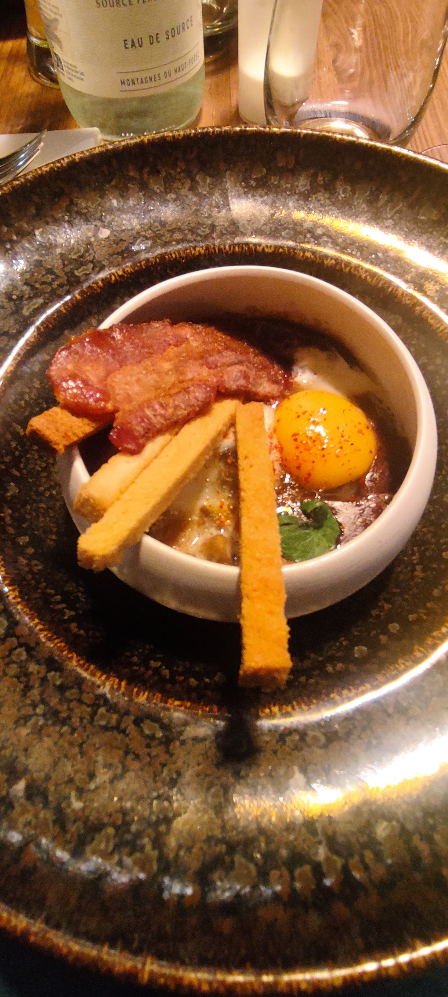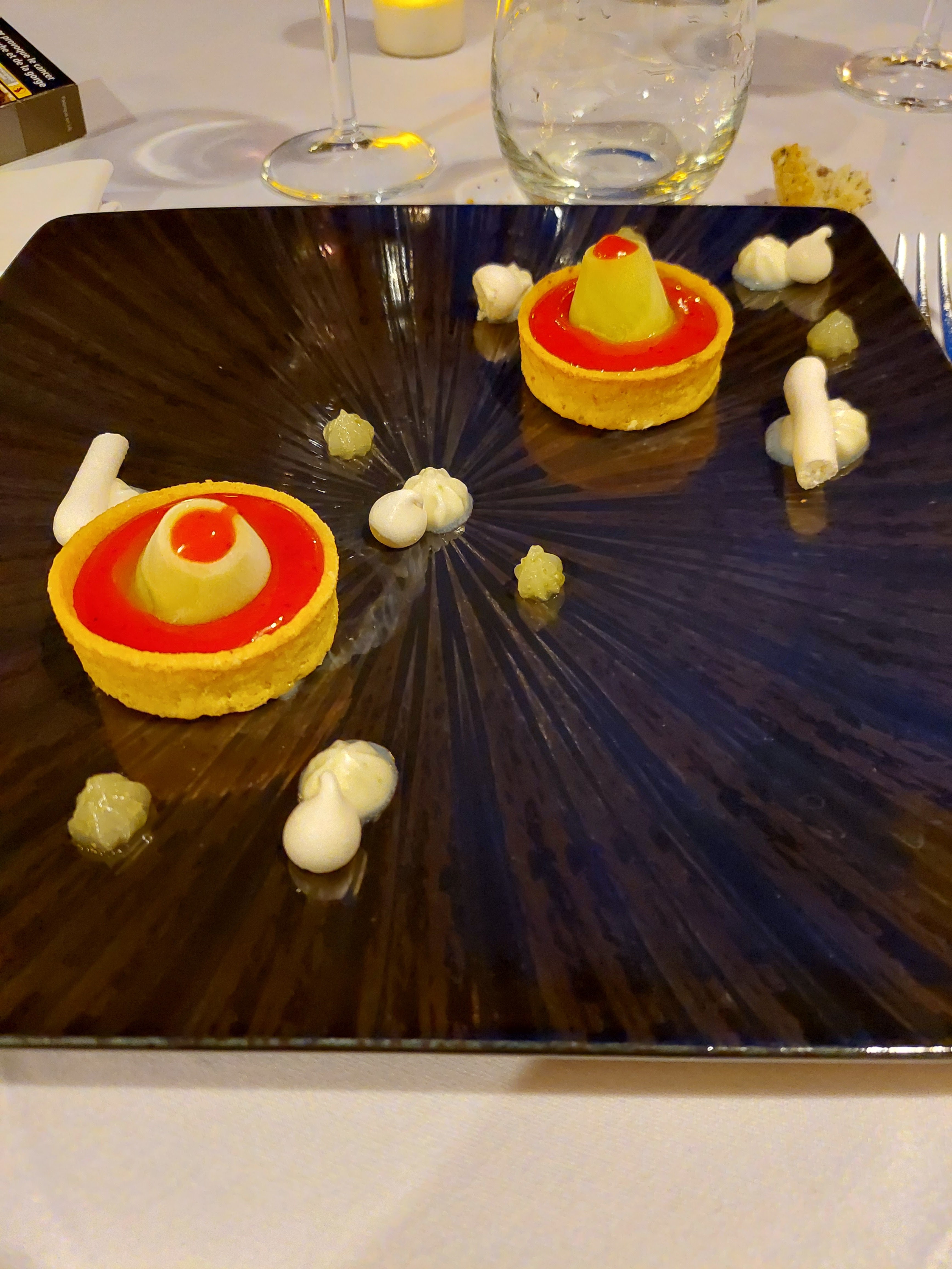 L’entrée et le dessert au citron et au sapin étaient très réussis.En revanche, la sauce du plat était beaucoup trop salée de l’avis de l’ensemble de la table. La décoration et le jeu de lumière de la salle sont agréables.