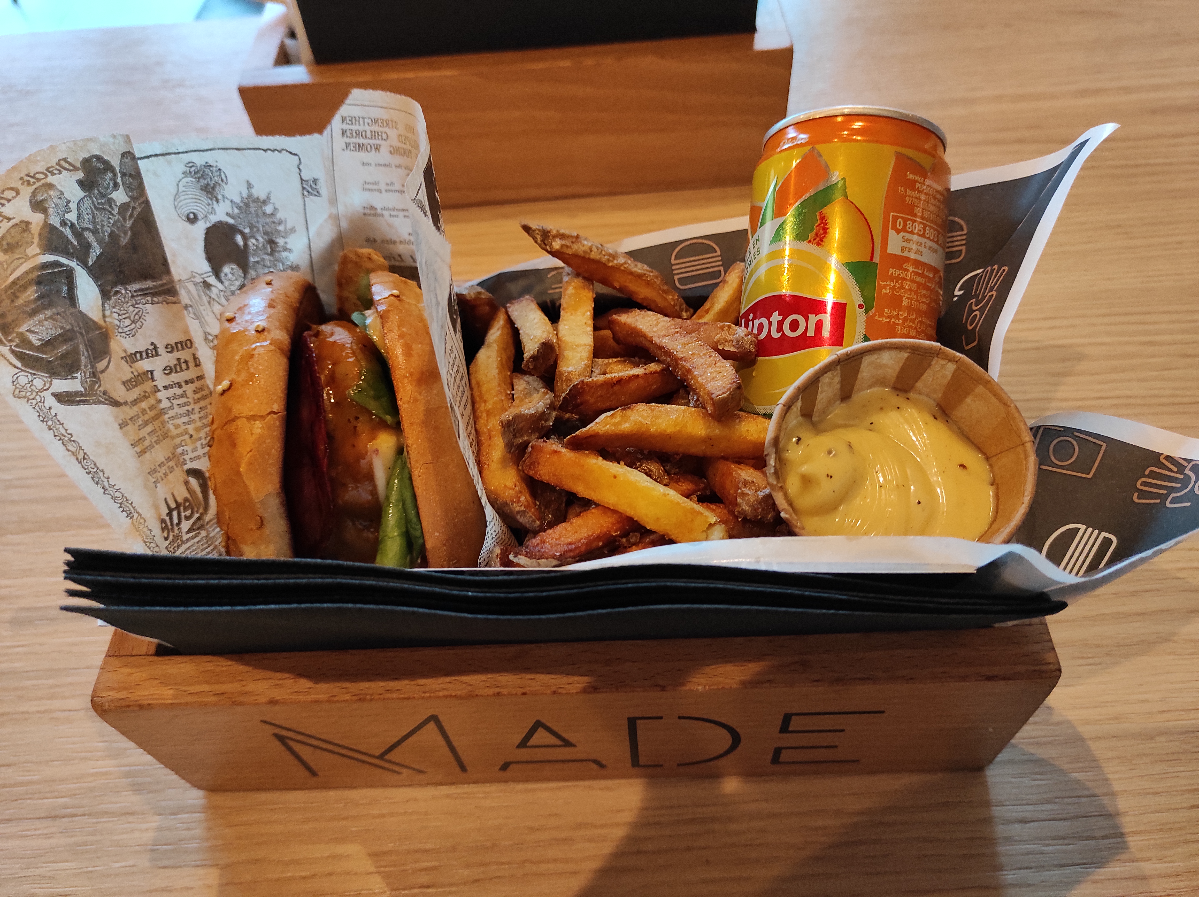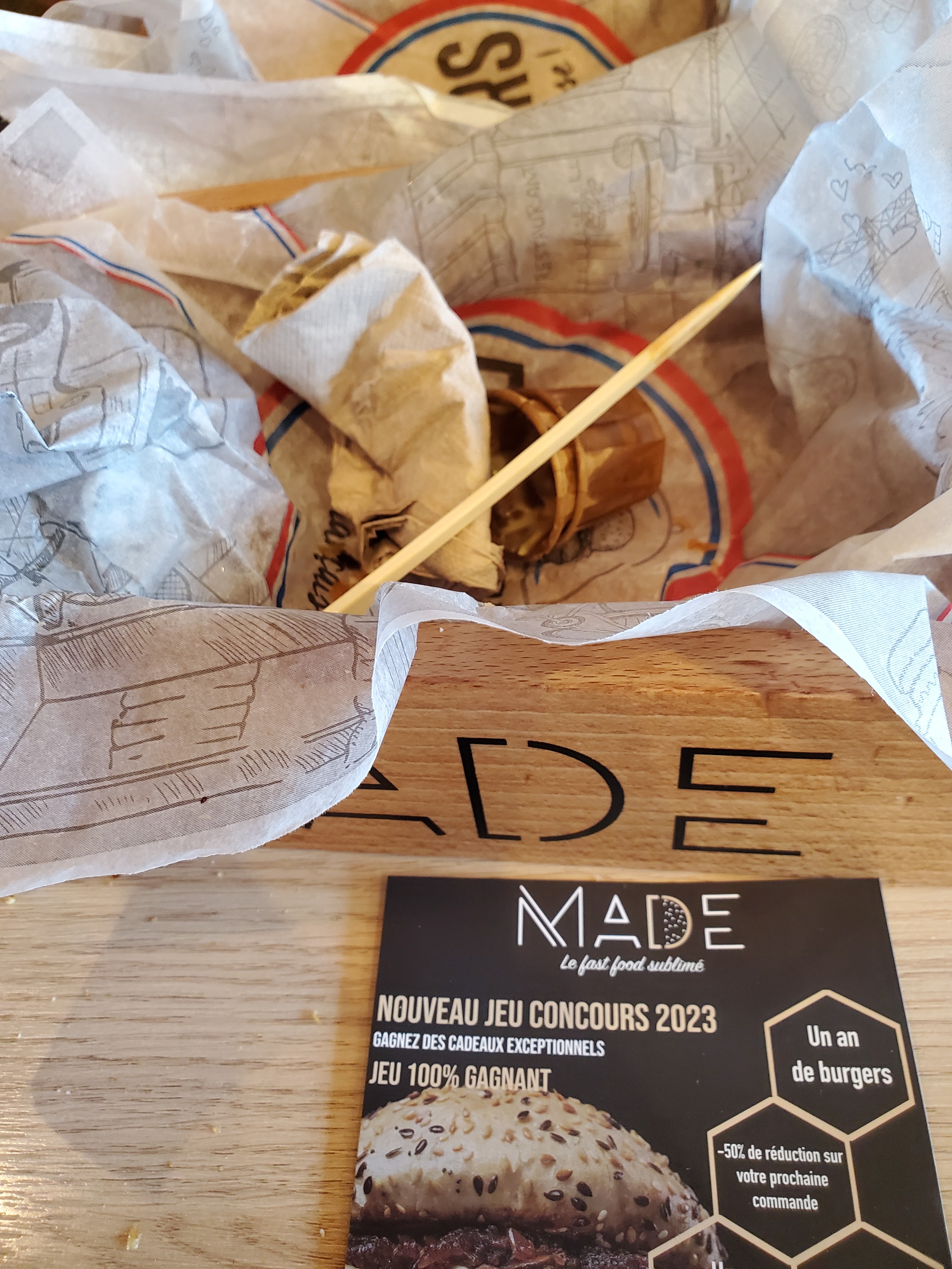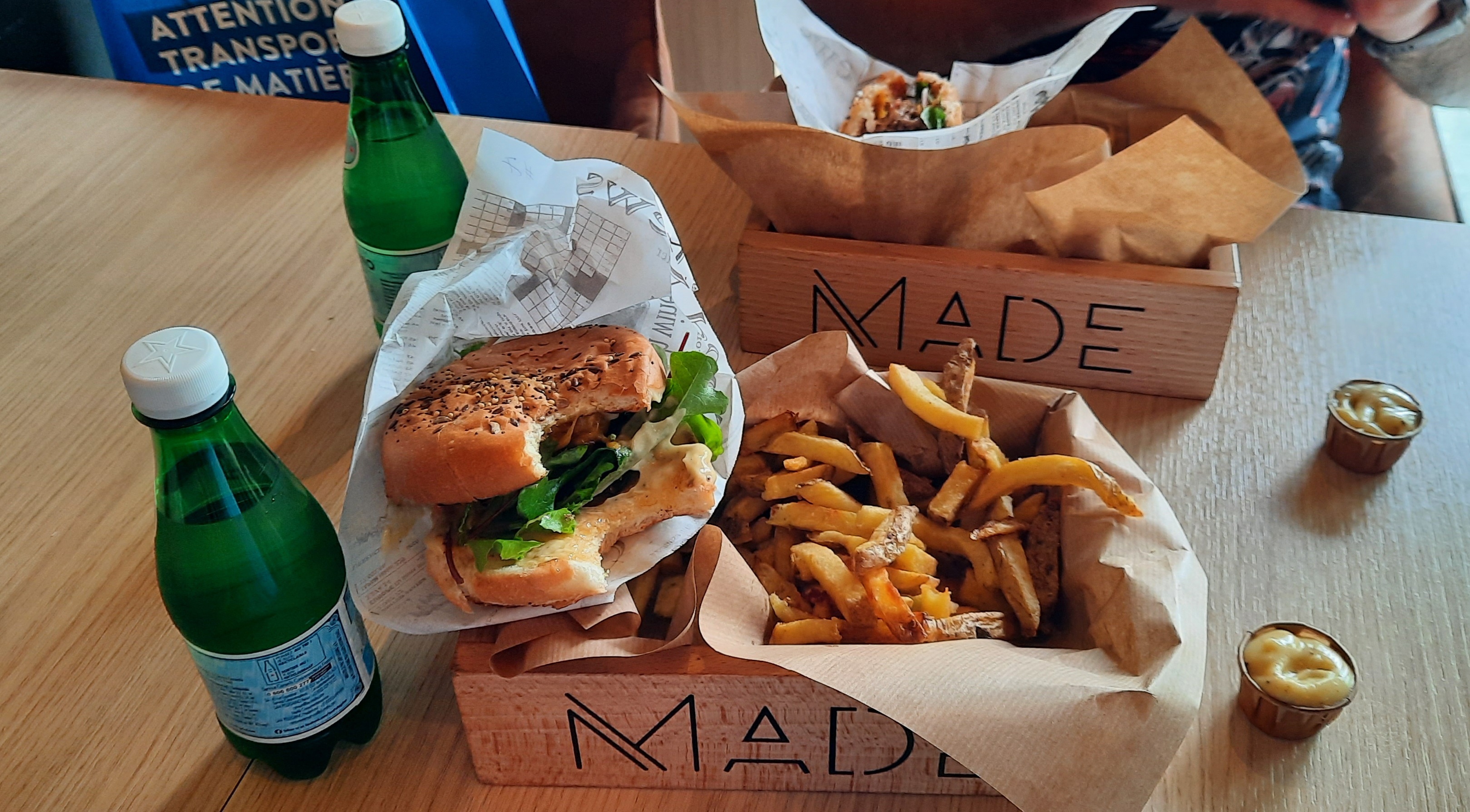 Jeudi 8 février. Un petit tour à T Atoll pour quelques courses. Il est midi, je passe à Made. Alors, le burger est bon (il est appréciable de pouvoir mettre un commentaire pour la cuisine. J'ai donc demandé à retirer les cornichons. Et la demande était comprise, ce qui est fort appréciable). Par contre, les frites... Faites un effort. Elles étaient trop cuites, trop sèches, aucun goût. Donc, je pars du resto à moitié satisfait. Par contre, le personnel est souriant et sympathique.