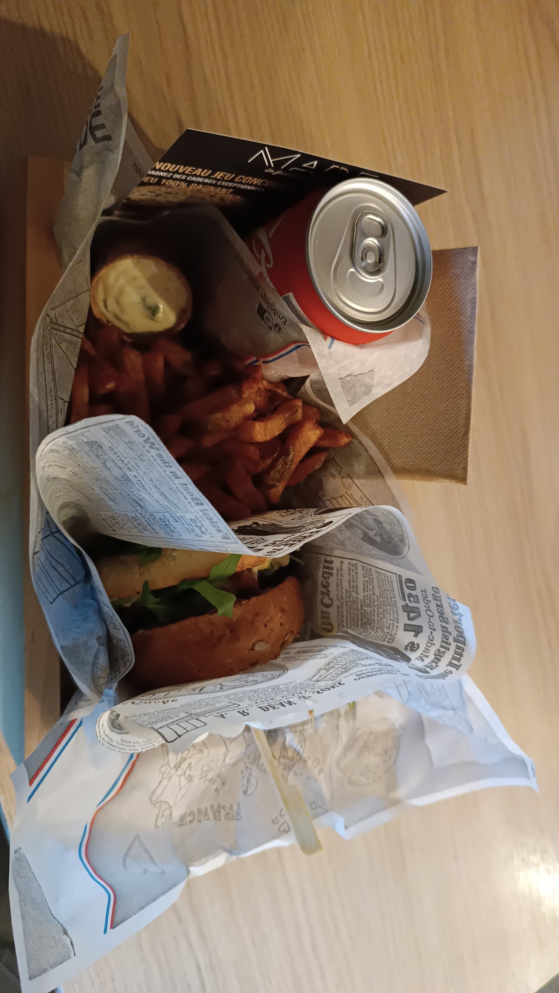 Très déçue par la box poulet dont j ai laissé les trois quarts car le gout d'huile de cuisson rance n était pas masqué par celui de la mayo et le poulet lui même était très fade !quand aux frites de patates douces ,nettement moins bonnes que d habitude....burger très gras et beaucoup plus petit qu' avant.Que se passe t il au made de beaucouze ?