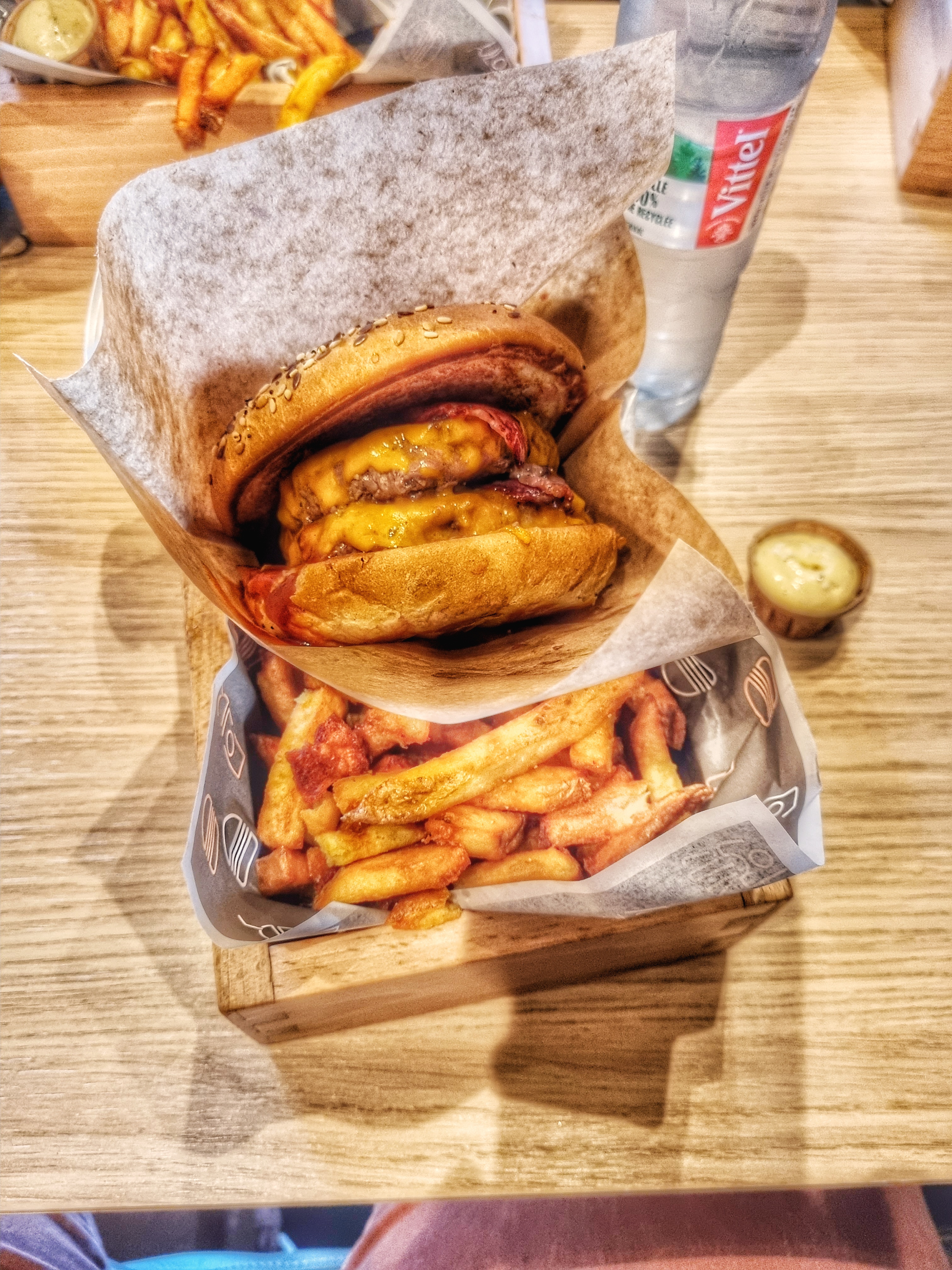 Burger très bon Frite très bonne également et très généreuse Il faudrait justement un peu plus de sauce car cela faisait trop peu comparer à la quantité de frite Mais rien à dire à part ça c’est excellent