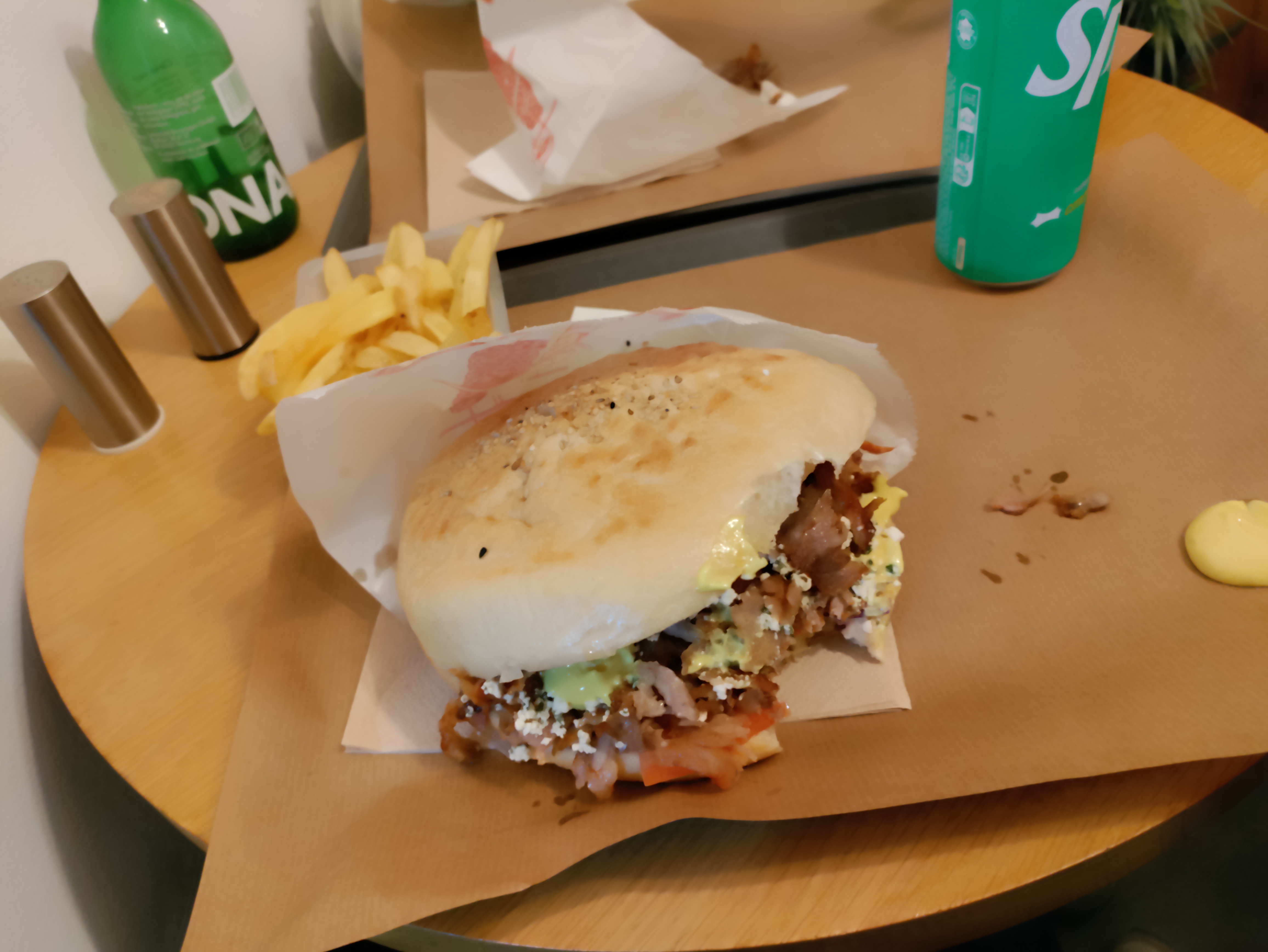 Belle découverte pour ce kebab de type BERLINER. Un sandwich avec un pain rond artisanale composé d'une broche artisanale de viande de veau de lait avec un très bon mélange de légumes frais et/ou frits, possibilité de manger sur place en intérieur ou en terrasse.