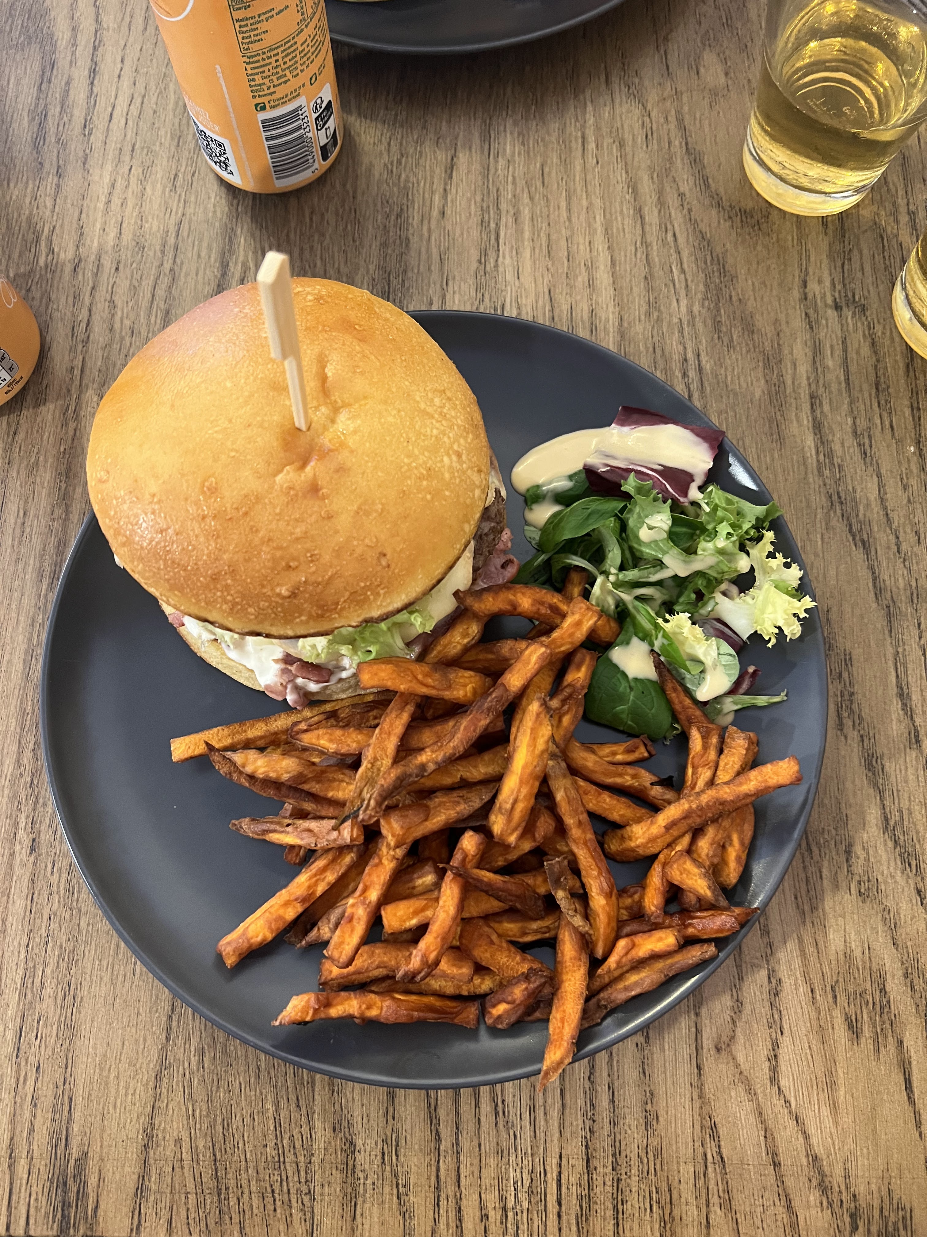 Accueil sympathique. Burger très bon et très copieux. Les frites sont parfaites, petite découverte pour les frites de patates de douces. La salade avec sa vinaigrette accompagne parfaitement le tout.