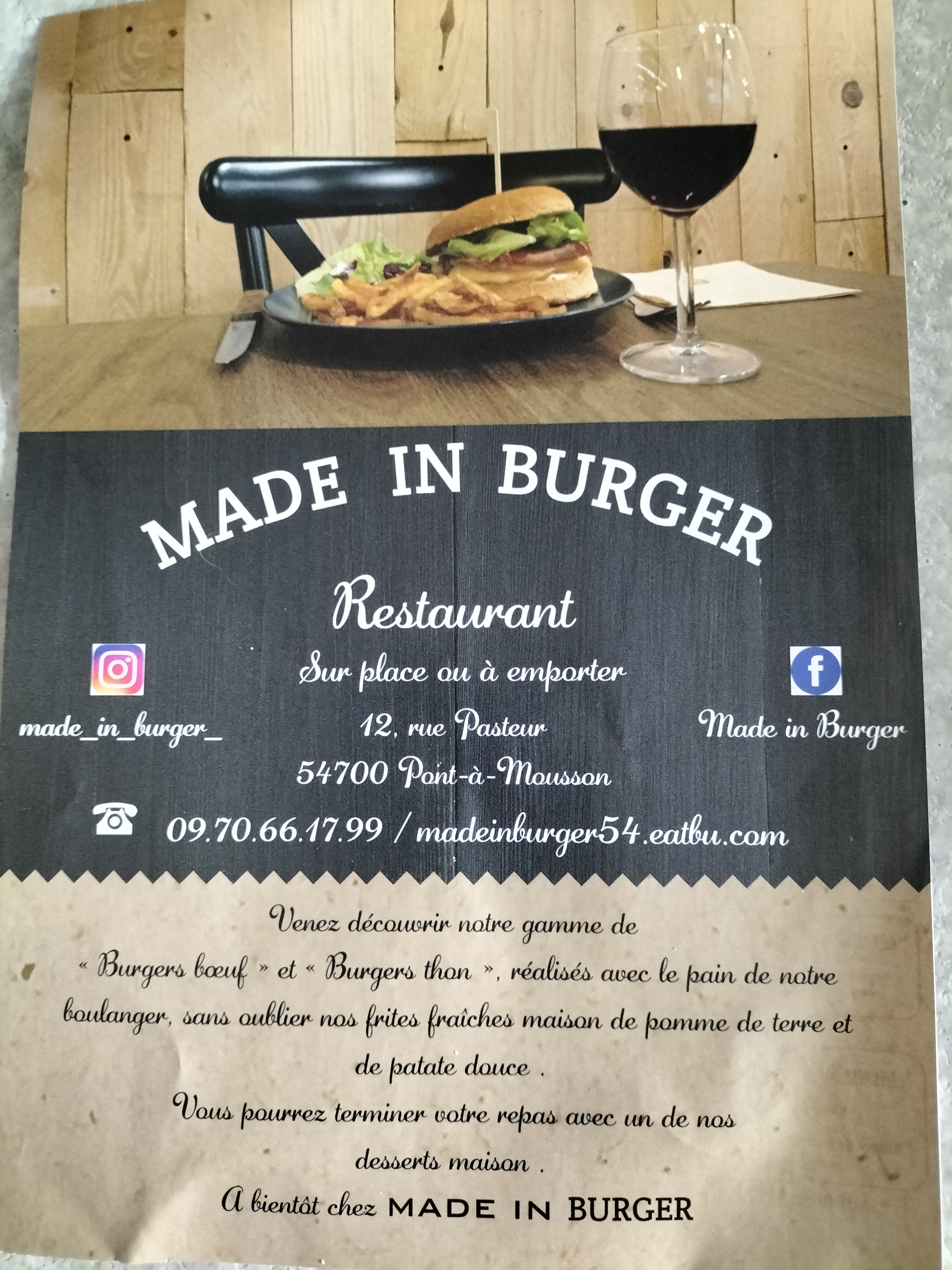 Vous voulez manger un excellent burger sur Pont à Mousson ? Alors pas d'hésitation allez chez Made in Burger. Un burger cuit à la demande avec des produits de qualité, des frites faites maison. Un accueil très sympathique et le rapport qualité prix est top. Il y a des burgers pour tous les gourmands et même des burgers au thon. Possibilité de manger sur place ou à emporter