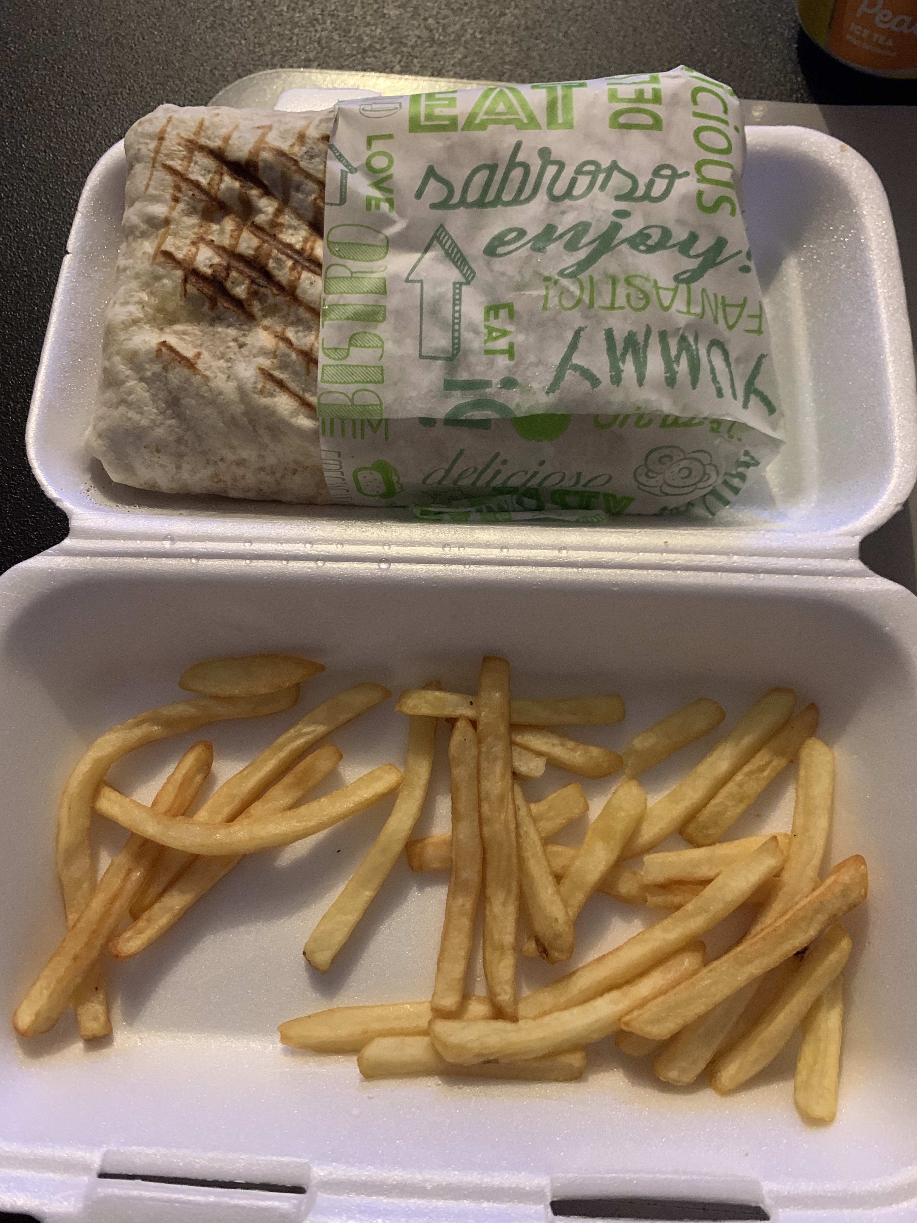 Attiré par la note, et de passage dans le coin, j’ai voulu tester. Raté, la personne qui prend les commandes me dit que je devrais payer un supplément pour faire cuire les oignons avec le poulet parce que ça fait du travail en plus (😂🤔😅)… pourtant si on prend sans oignons ou sans tomate, le prix ne diminue pas donc, par principe, j’ai été à côté, où, comme dans tous les fastfoods, les oignons cuits ne sont évidemment pas payants.
