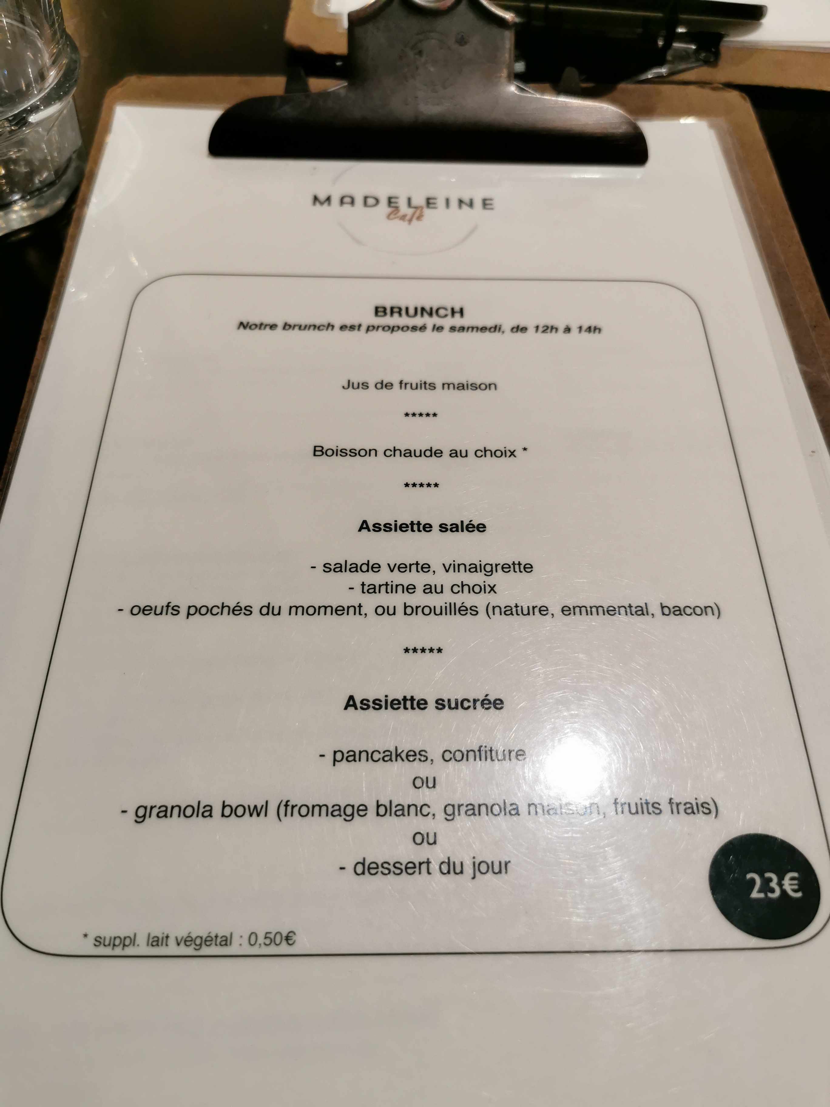 Petite escapade chez Madeleine café un matin très tôt pour profiter des derniers instants de liberté avant confinement. J’ai pris une formule gourmande à 9€ comprenant un dessert, un jus de fruit pressé et une boisson chaude. Comme je faisais partie des premiers clients, il n’y avait pas grand choix niveau pâtisserie. Et c’était sûrement les restes d’hier. Car la tarte crumble était dur. Et le jus de pomme, trop mais alors vraiment trop sucré à mon goût. Honnêtement. J’ai juste siroté rapidement histoire de voir. Assez déçue pour le coup. Le chocolat chaud. Rien d’extravagant, c’est bon mais sans plus quoi. J’ai demandé si c’était maison. On me fait oui et plus tard je vois la dame versé un sachet de poudre lol. Sinon l’endroit est vraiment beau. Ambiance cosy, nid douillet. Je n’ai rien à dire sur le service, l’attente était raisonnable. Bilan de l’expérience. Un peu déçue, je m’attendais à quelque chose qui mettent mes papilles en éveil (comme suggéré dans les avis) mais pas au rendez-vous. Peut-être faudrait-il testé à un autre moment de la journée ?
