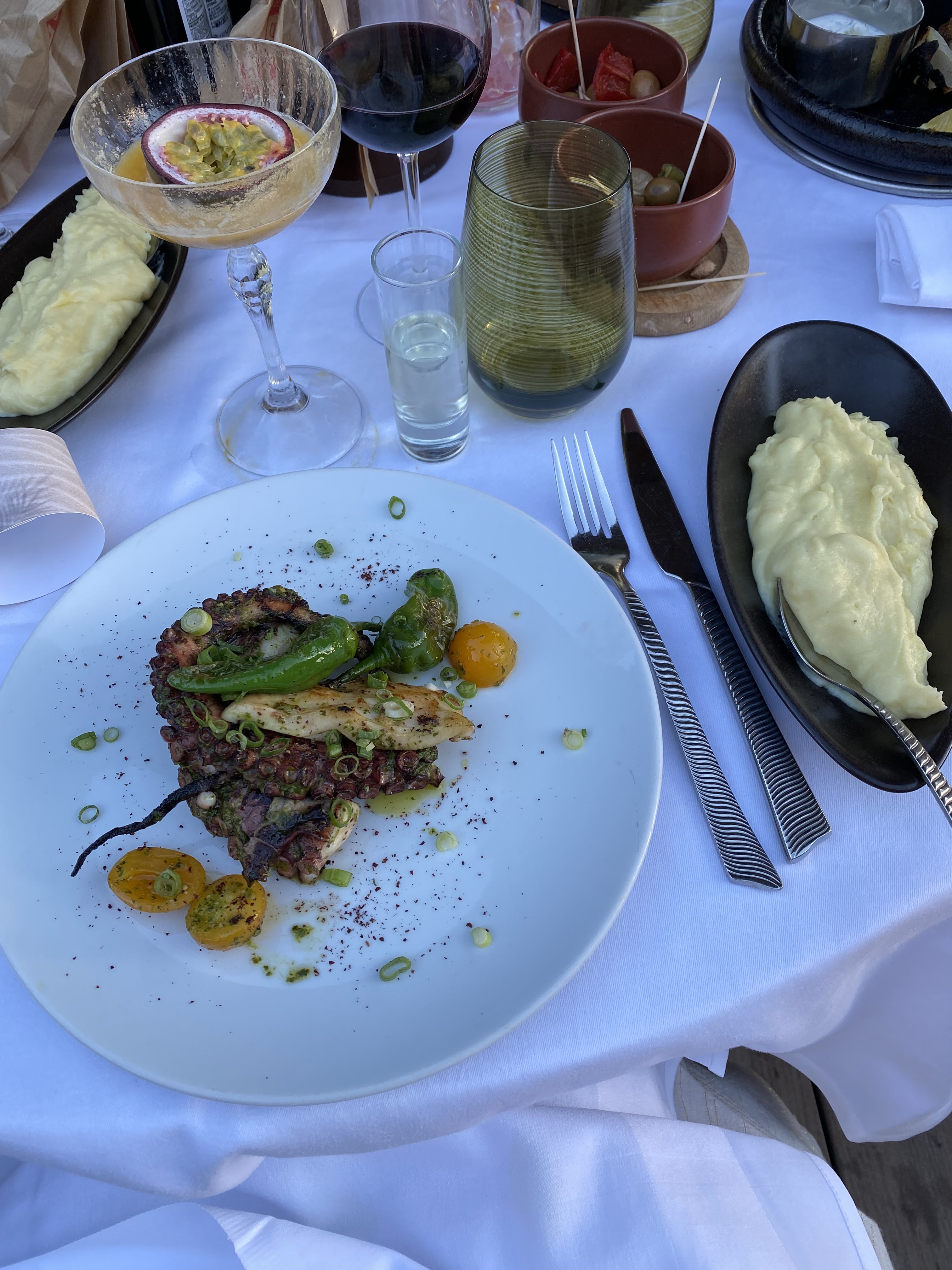 Cadre très beau au bord de plage, avec une bonne ambiance estivale comme on les aime ! Le service est très professionnel et agréable (on a juste oublié de nous amener notre bouteille de vin) autrement c’était très bien ! La cuisine est excellente, j’ai prit du poulpe avec une purée de pomme de terre. Un petit peu cher pour la quantité. Et les cocktails, un délice pour les yeux et pour le goût !