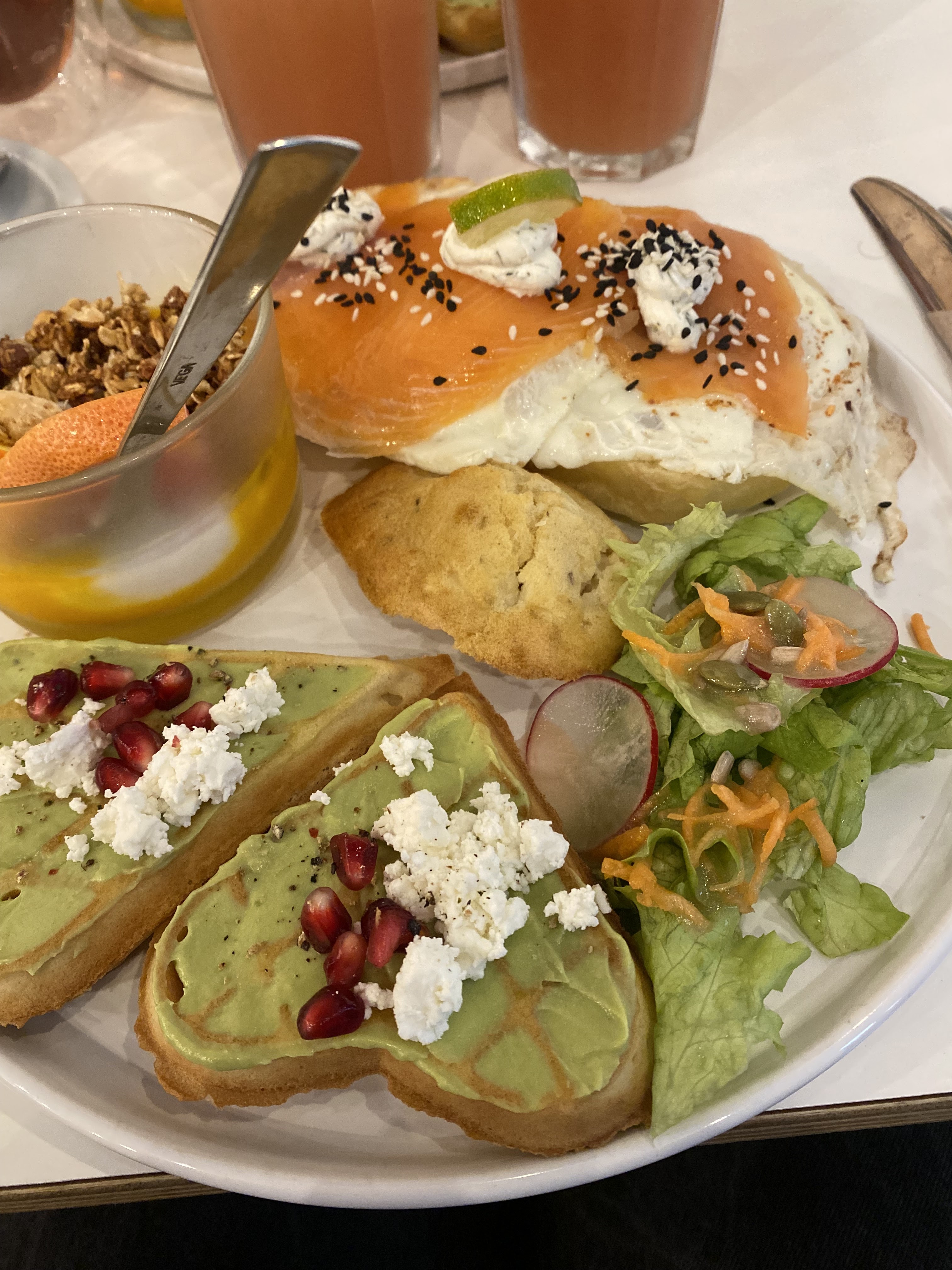 Menu complet brunch à 25€ avec boisson chaude + boisson froide + plat salé + dessert (brioche perdue ou pancakes), accompagné de petites gaufrettes avocado et madeleine salée, avec petit granola Beaucoup de choses mais en petites proportions donc très bien, on ne ressort pas en roulant! Petit resto par contre, resa ok en semaine, pas ok le week-end.