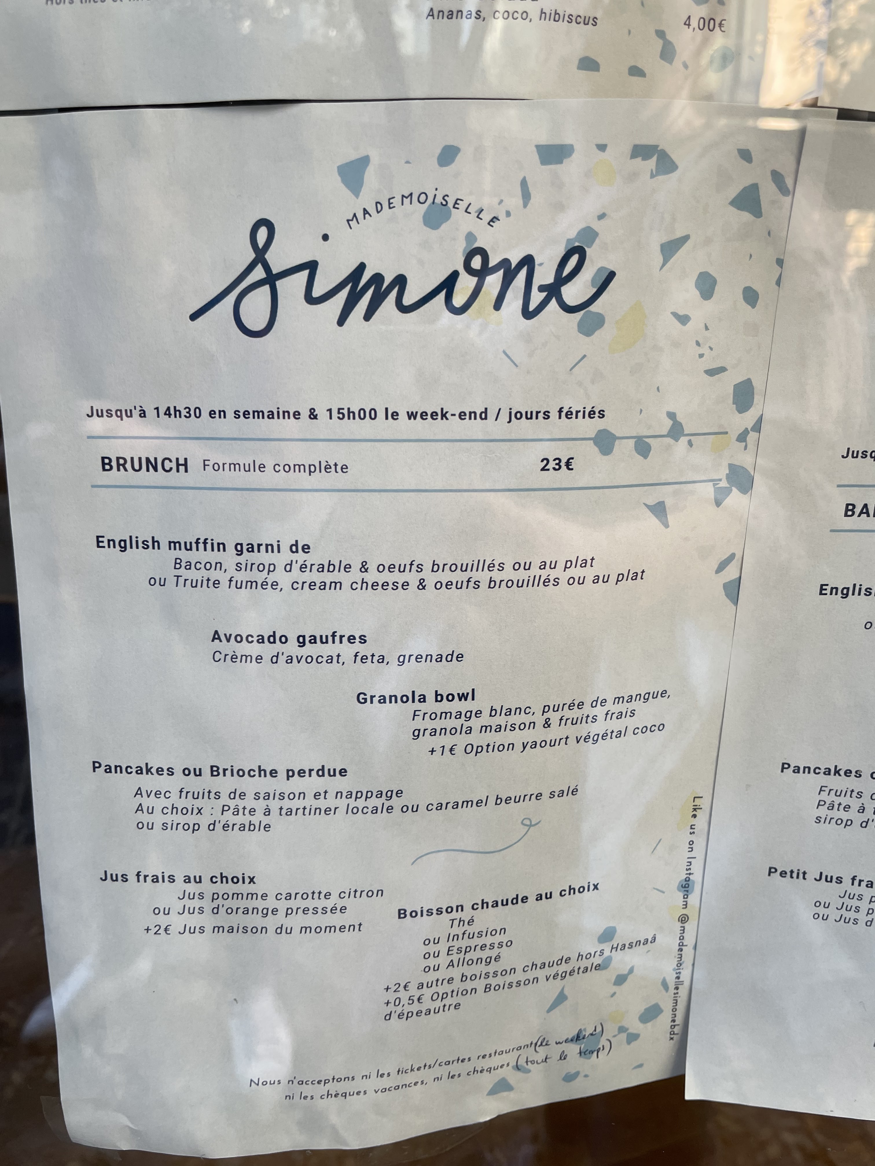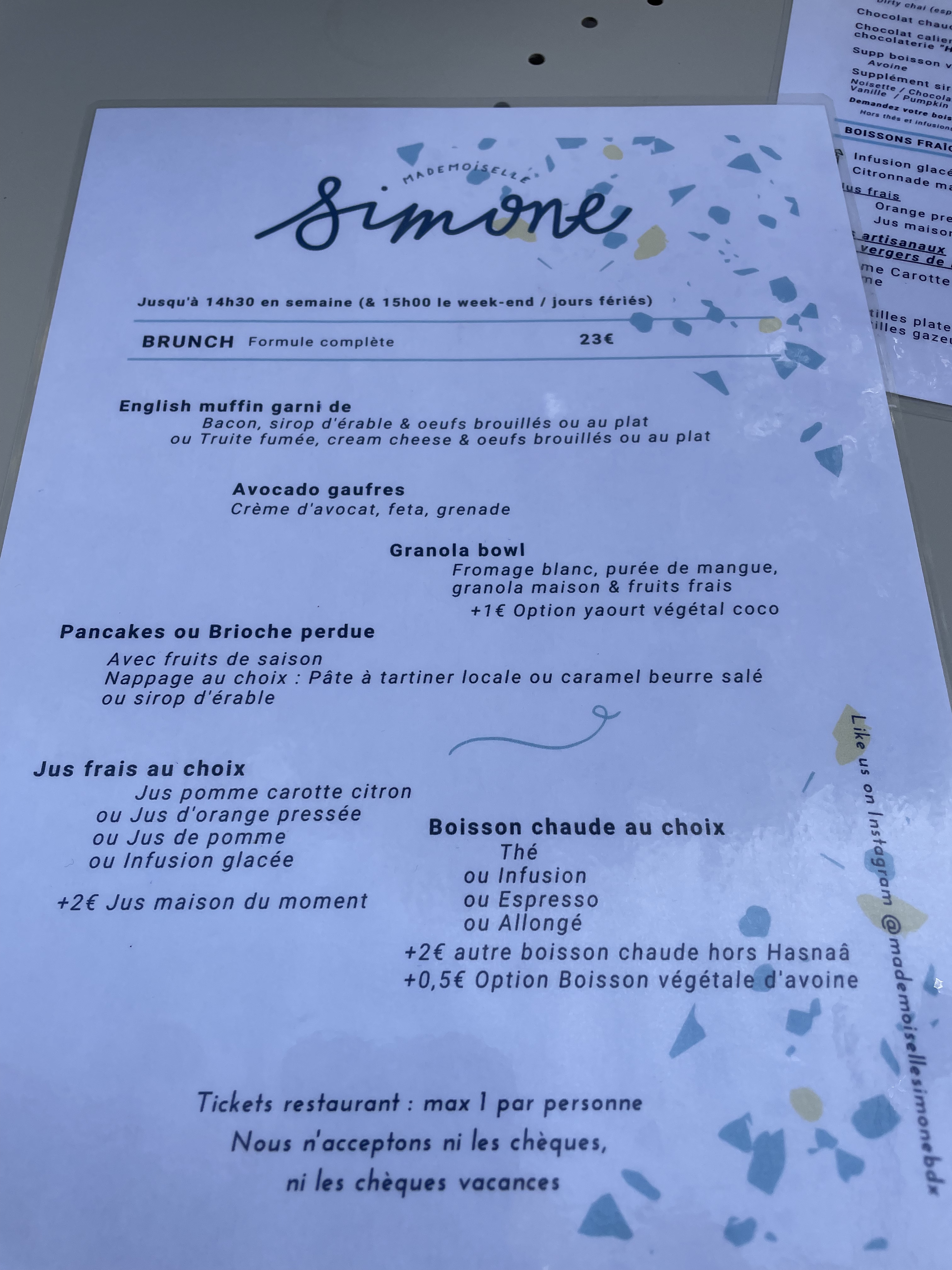 Particulièrement déçue , par ce soit disant Big Brunch comme indiqué à l'entrée de Mademoiselle Simone.. De toutes petites quantités et pas forcément travaillé , Il ne faut pas avoir très faim , on s'attend à quelque chose de copieux mais ce n'est pas le cas du tout ! Je ne recommande pas. Vous trouverez de bien meilleures adresses sur Bordeaux si vous souhaitez faire un brunch.