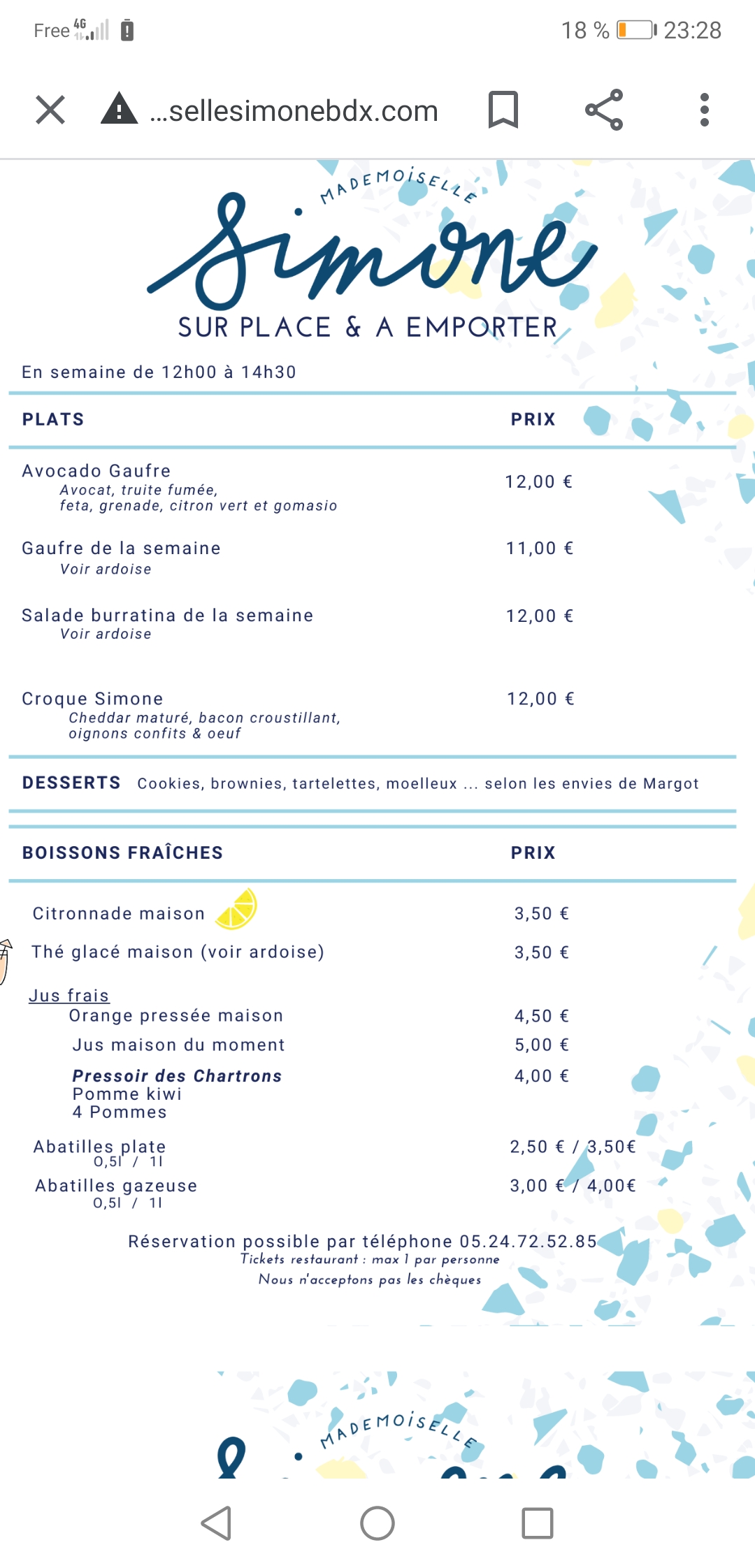 Pour avoir testé un grand nombre de brunch à Bordeaux, mademoiselle Simone a été l’un de mes préférés ! Situé dans une rue calme, nous avons pu nous installer en terrasse et manger comme des rois, tout pleins de saveurs et parfaitement équilibré : moi qui n’aime pas gaspiller je me force généralement à finir mon assiette, mais cette fois-ci c’est passer tout seul, tout en étant rassasiée ! J’ai passé un agréable moment et l’équipe est au top, le service est rapide, les assiettes son belles, en bref : je recommande à 200% !!!