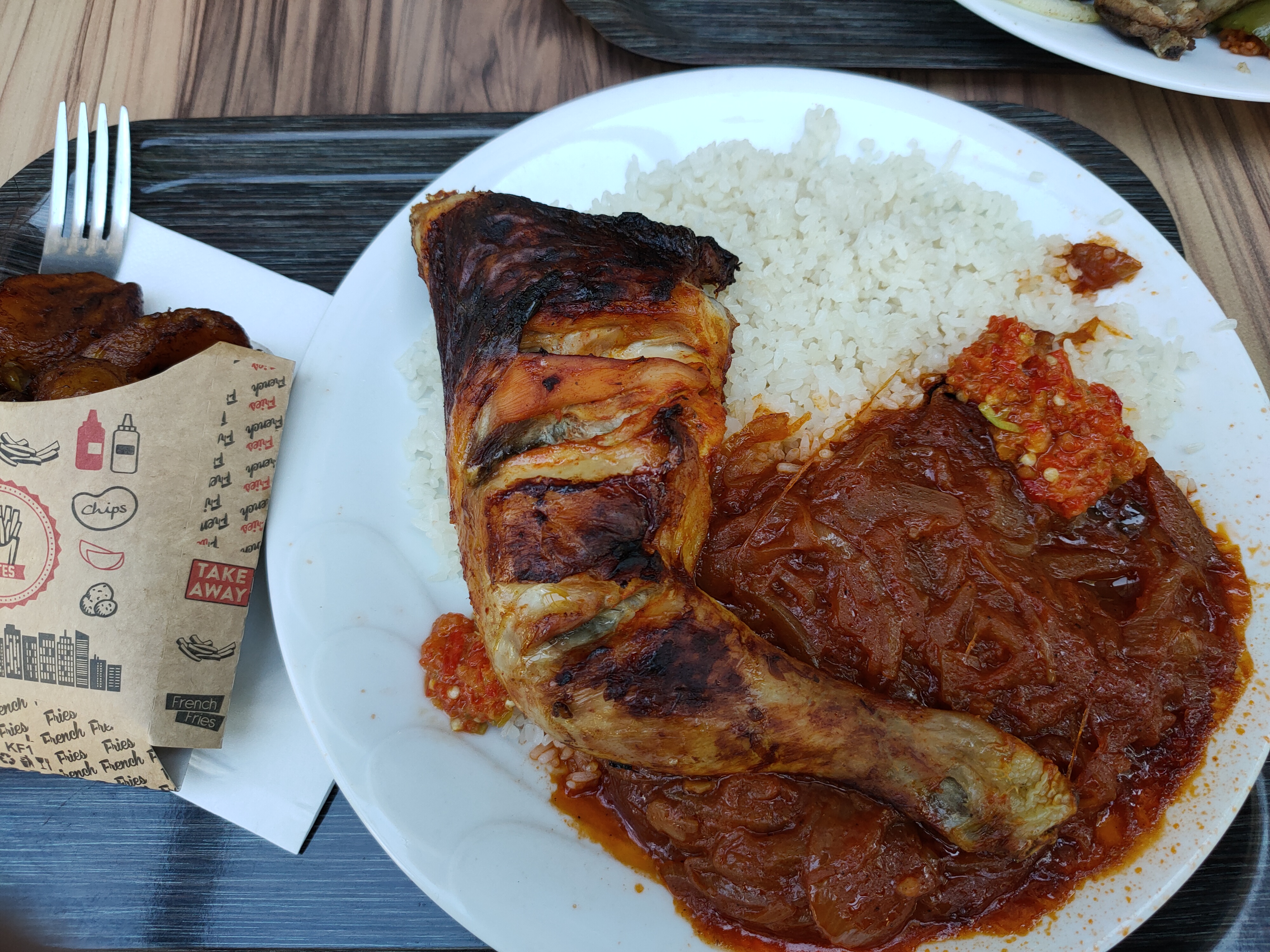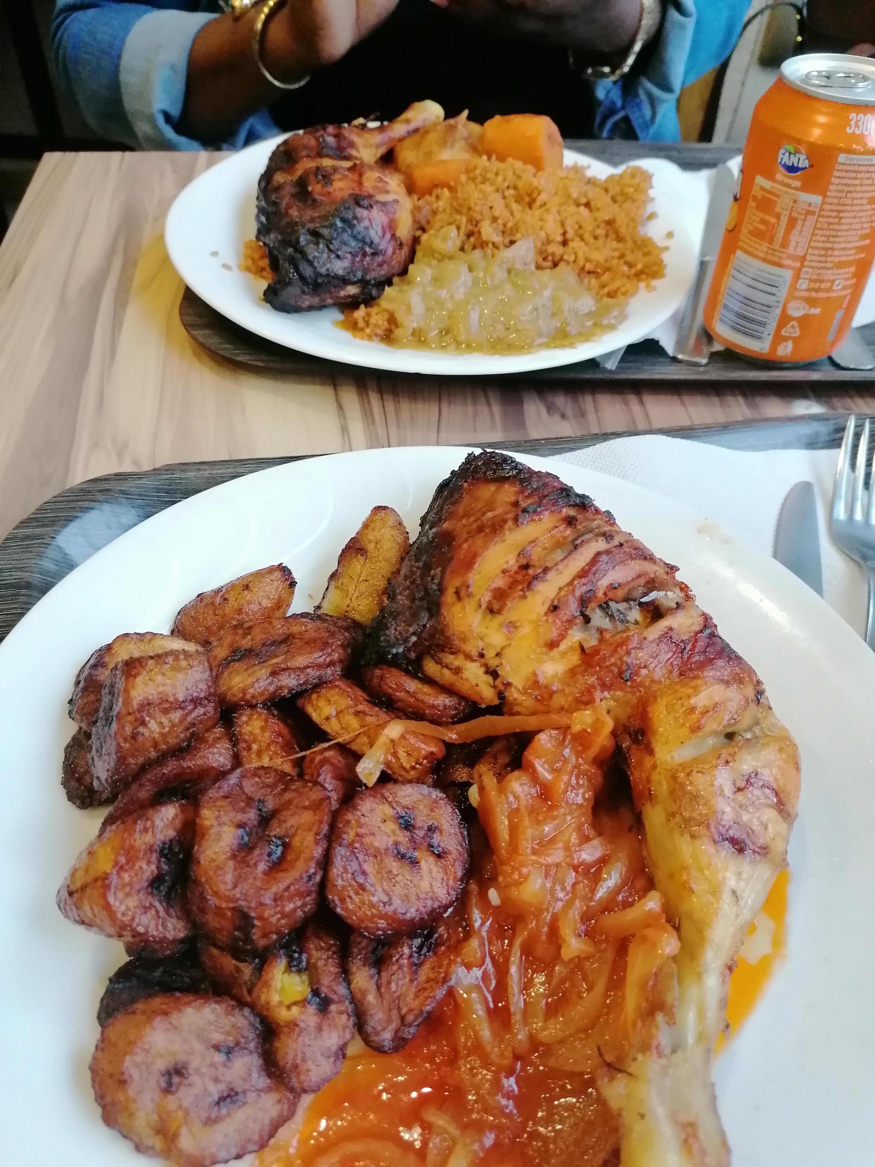 Les plats son bon, le riz délicieux le poulet est bien assaisonner mais par contre je suis très déçu des bananes plantain qui sont secs et sèche.