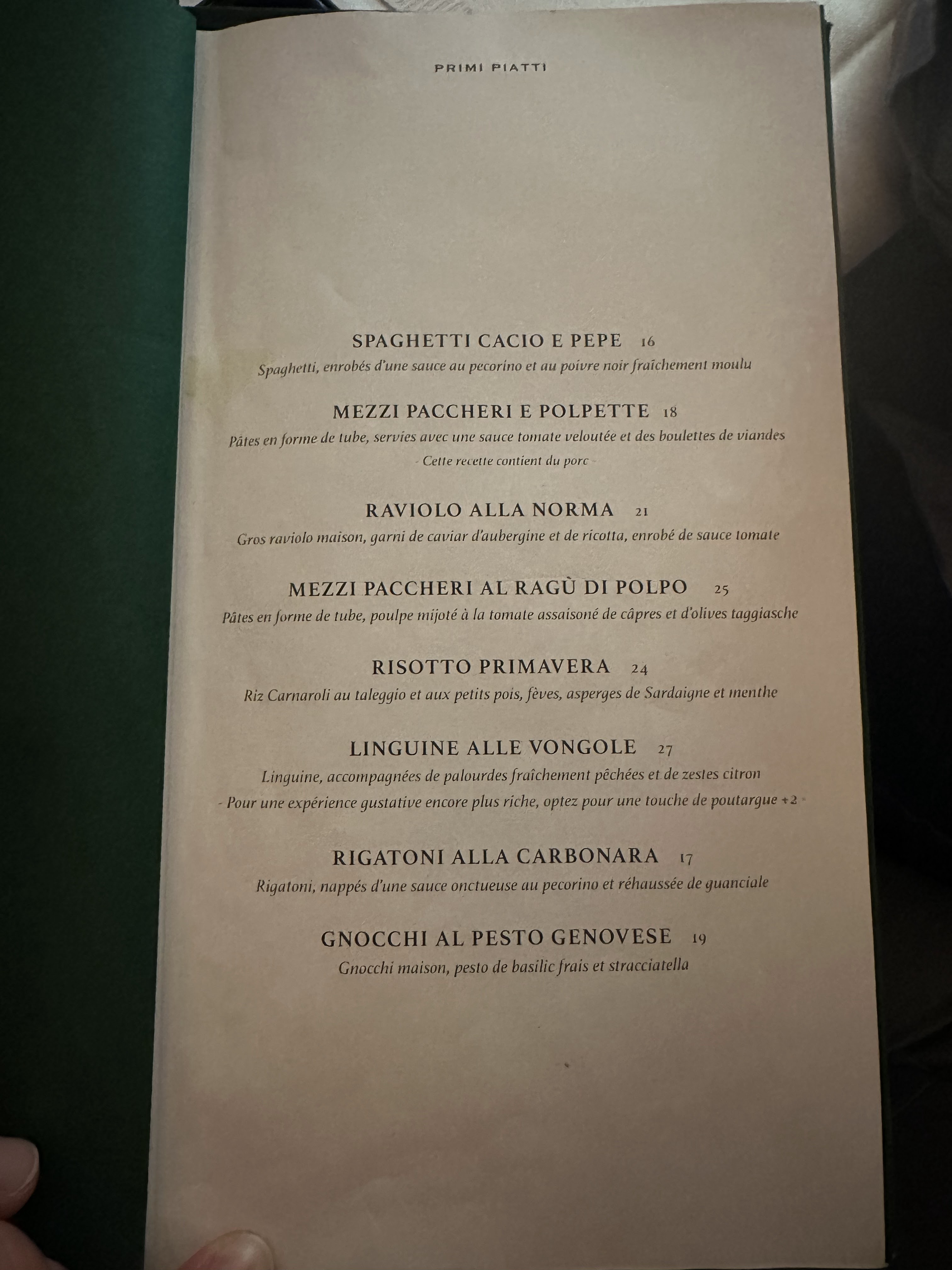 Belle cuisine italienne à Paris. Le service était rapide et attentionné. Options végétariennes. Charmant restaurant avec beaucoup de locaux, le personnel parle anglais.