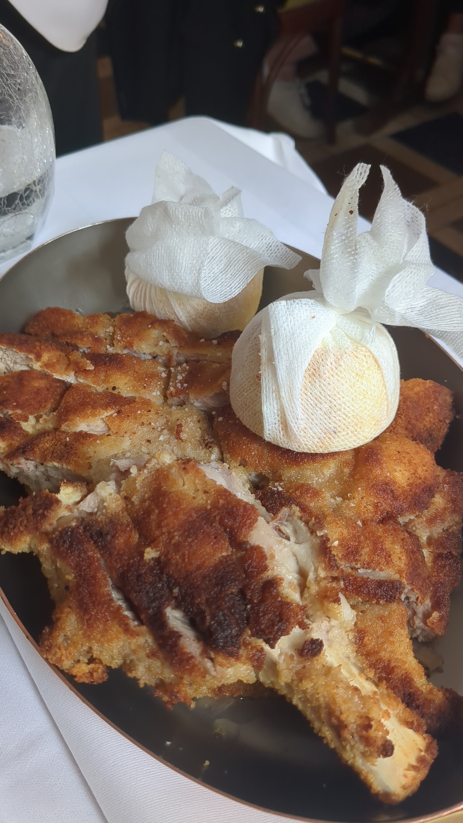 Nous sommes arrivés dans ce très beau restaurant et nous avons été très chaleureusement accueilli. L'équipe a été très professionnel et gentille tout au long du service. Nous avons eu la chance de vivre une expérience culinaire en goûtant l'escalope milanaise pour deux. Un petit show dans lequel le serveur découpe la sublime pièce de viande sous nos yeux. Imposant morceau bien épais, il libère son jus à la découpe et attise la faim. L'escalope est très tendre, délicieuse et généreuse, sans doute la meilleure que j'aie mangé. En revanche, l'accompagnement que nous avons choisi, les spaghettis sont simplement baigné dans de l'huile et un peu trop d'huile que c'était même écœurant. Les carbonara étaient aussi exquises, cuisson parfaites et une sauce très savoureuses. Peut être aussi la meilleure que j'aie goûté ? Le service qui avait fini son shift est même venu nous salué alors qu'il partait, quel geste adorable. Je recommande cette adresse et je reviendrai sans hésitation.